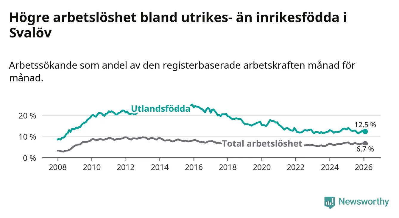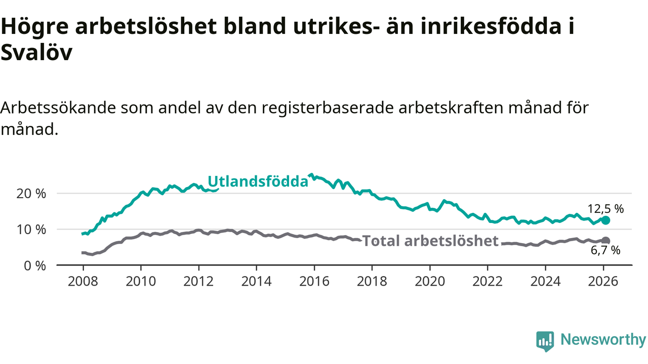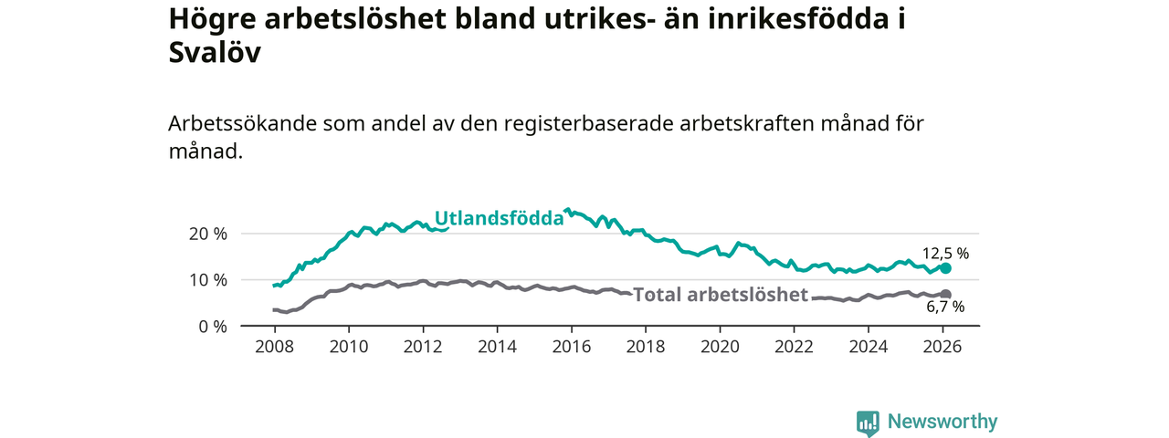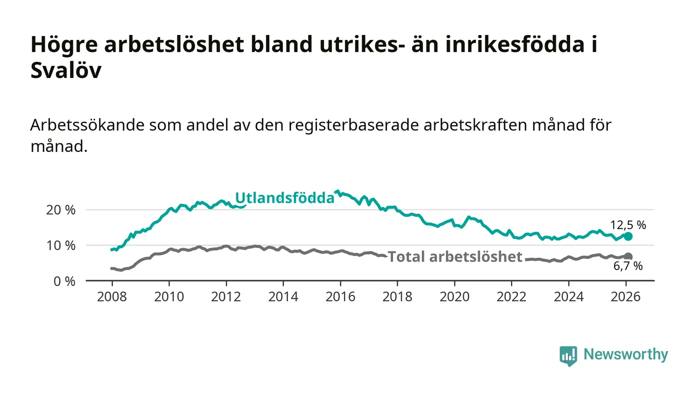 Skillnaden i arbetslöshet mellan utrikesfödda och hela befolkningen är 5,8 procentenheter i Svalöv. Det är en mindre skillnad än för ett år sedan (−1,0 procentenheter).