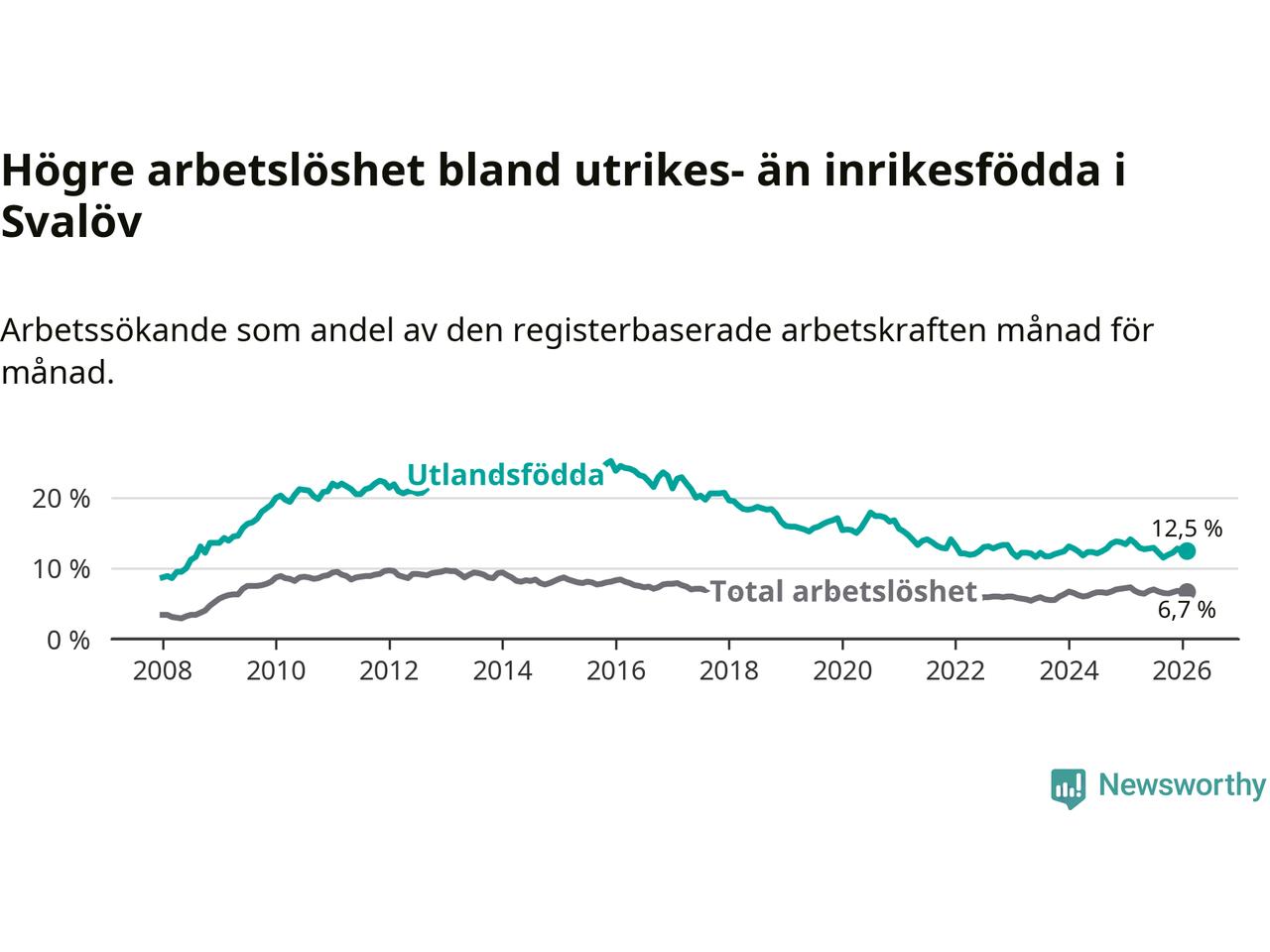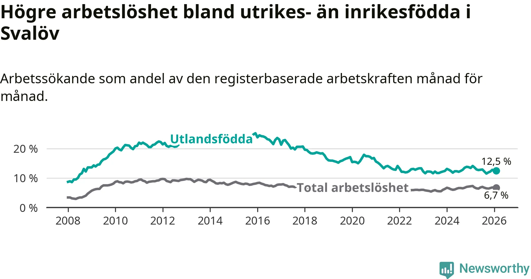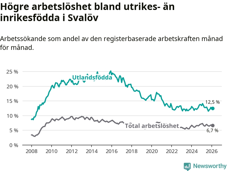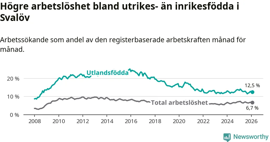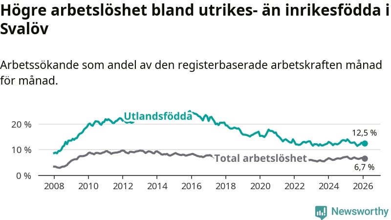 Skillnaden i arbetslöshet mellan utrikesfödda och hela befolkningen är 5,8 procentenheter i Svalöv. Det är en mindre skillnad än för ett år sedan (−1,0 procentenheter).
