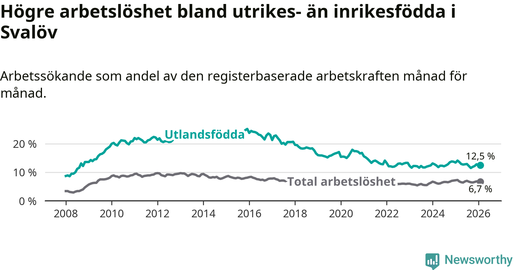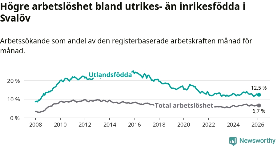 Arbetslösheten bland utlandsfödda var 12,5 procent i Svalöv under februari månad, motsvarande 206 av 1 648 personer. Det är 1,6 procentenheter färre än vid samma tidpunkt i fjol (−19 om man räknar personer). Därmed är de utlandsföddas arbetslöshet lägre än vid samma tidpunkt i fjol för sjunde månaden i följd.