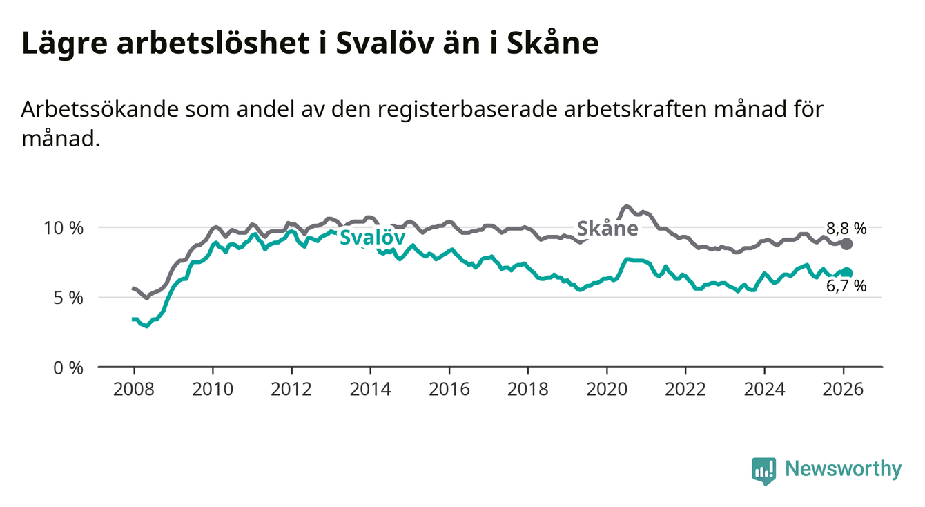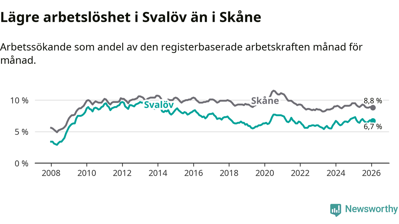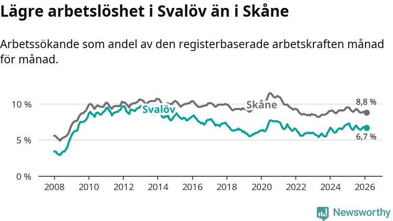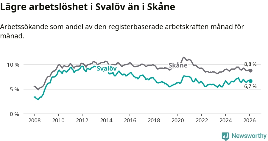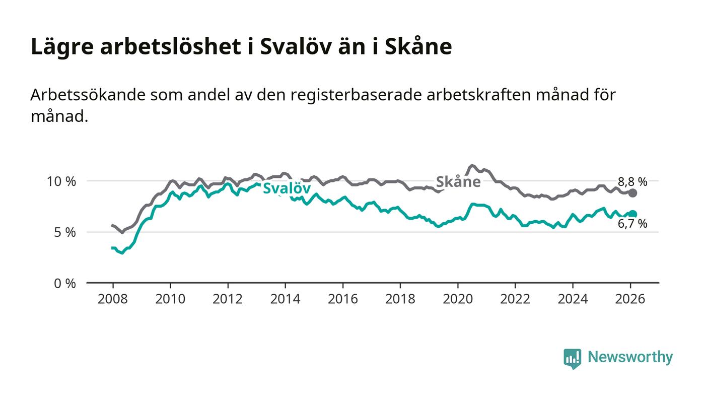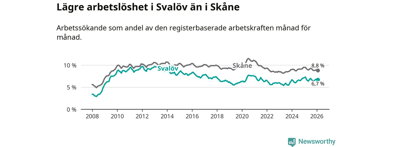 Under februari månad rapporterade Svalövs kommun en total arbetslöshet på 6,7 procent. Det är en minskning jämfört med samma tidpunkt i fjol (−0,6 procentenheter). Även i Skåne län sjunker arbetslösheten .