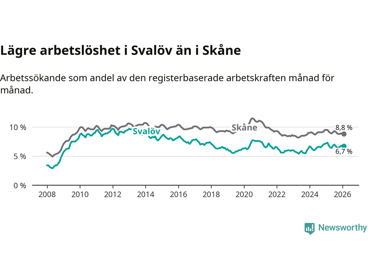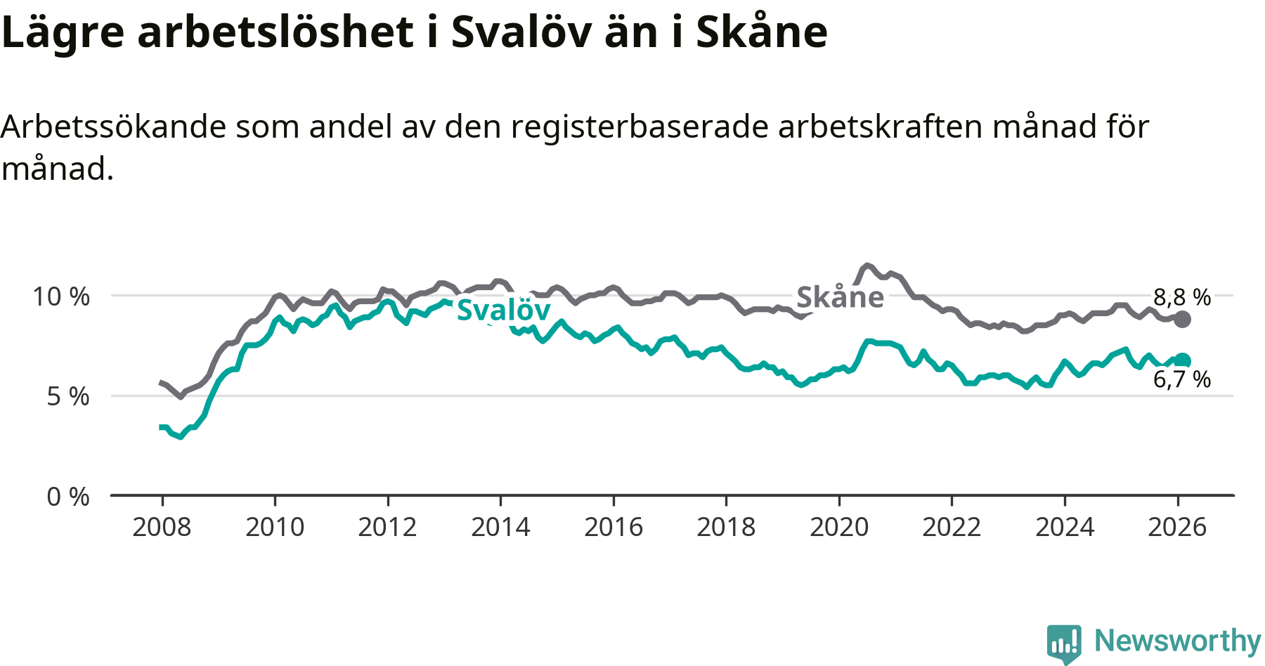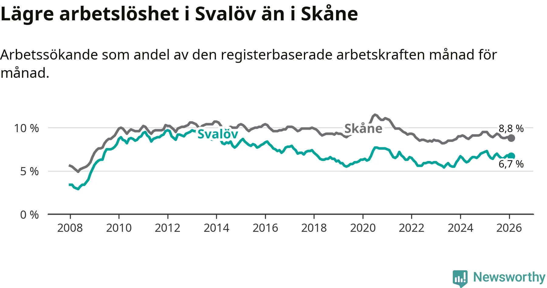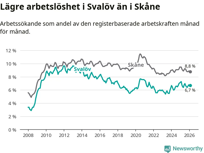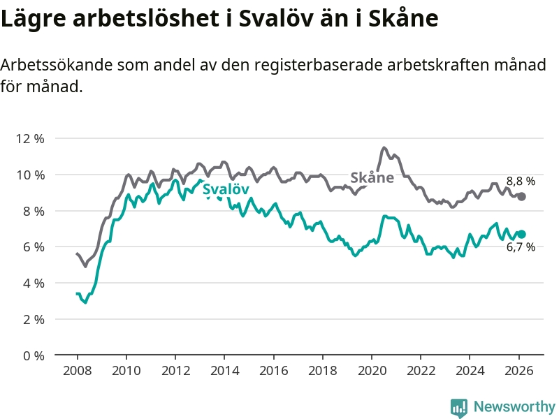 Under februari månad rapporterade Svalövs kommun en total arbetslöshet på 6,7 procent. Det är en minskning jämfört med samma tidpunkt i fjol (−0,6 procentenheter). Även i Skåne län sjunker arbetslösheten .