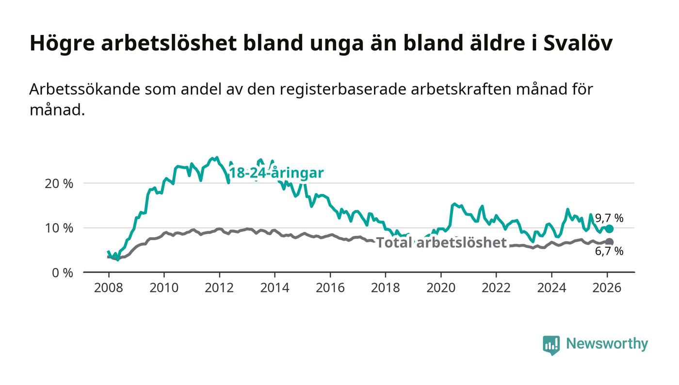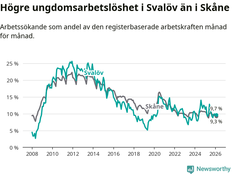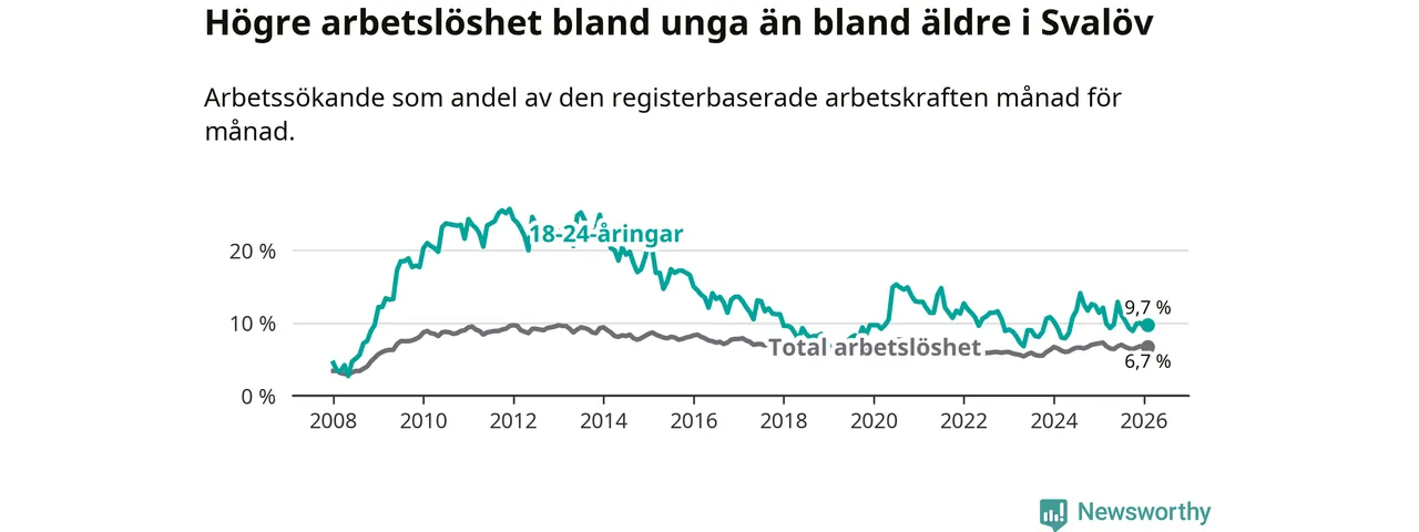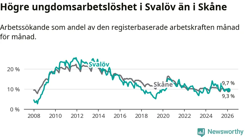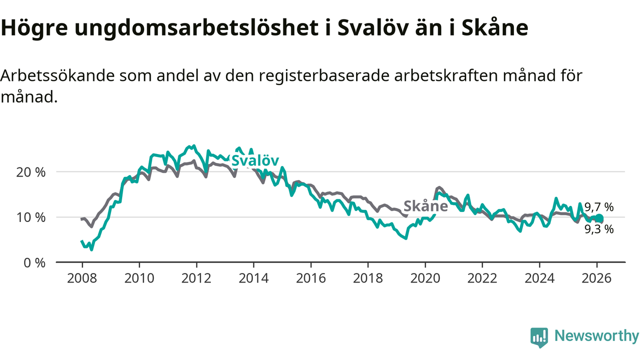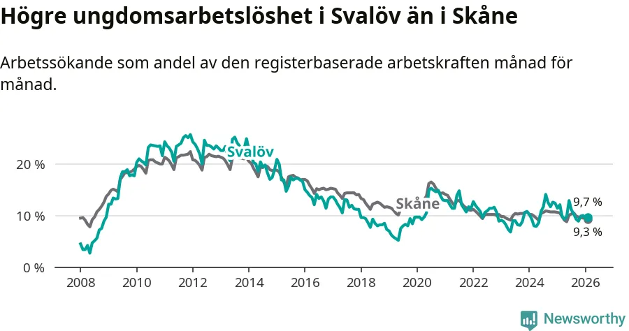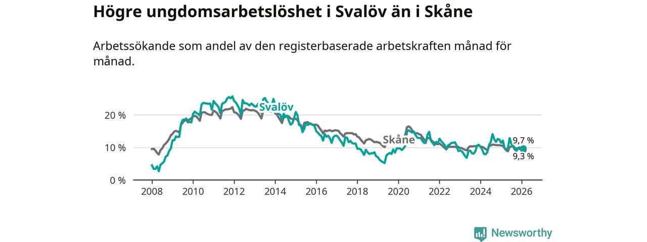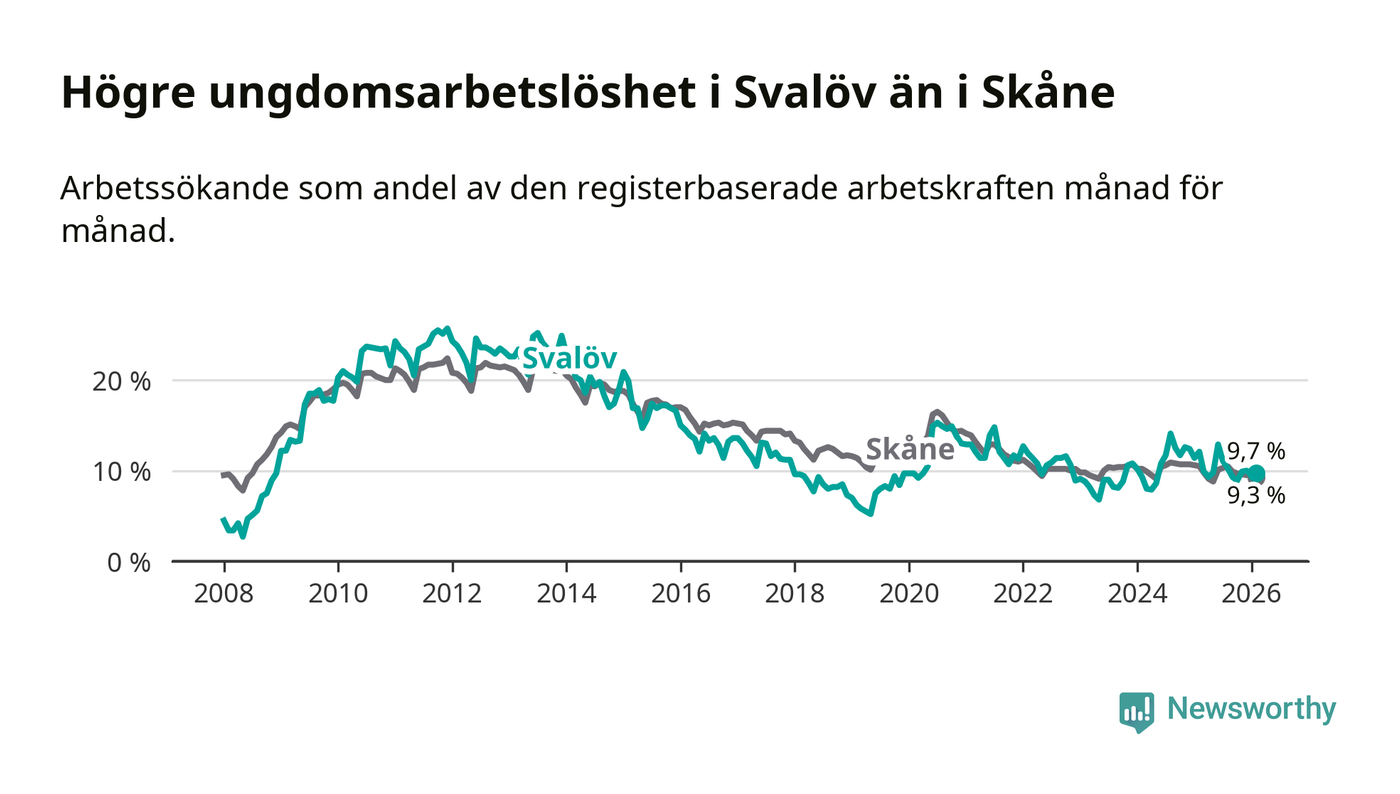 Medan Svalöv har lägre total arbetslöshet än Skåne, ligger ungdomsarbetslösheten 0,4 procentenheter högre i Svalöv.