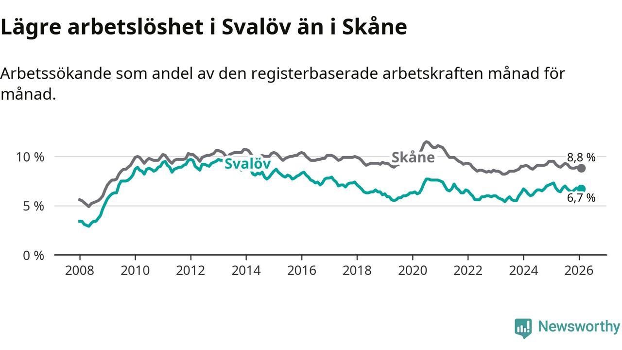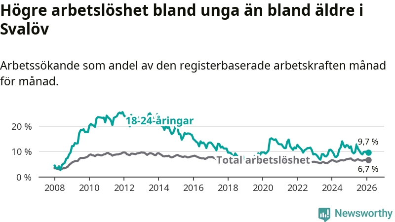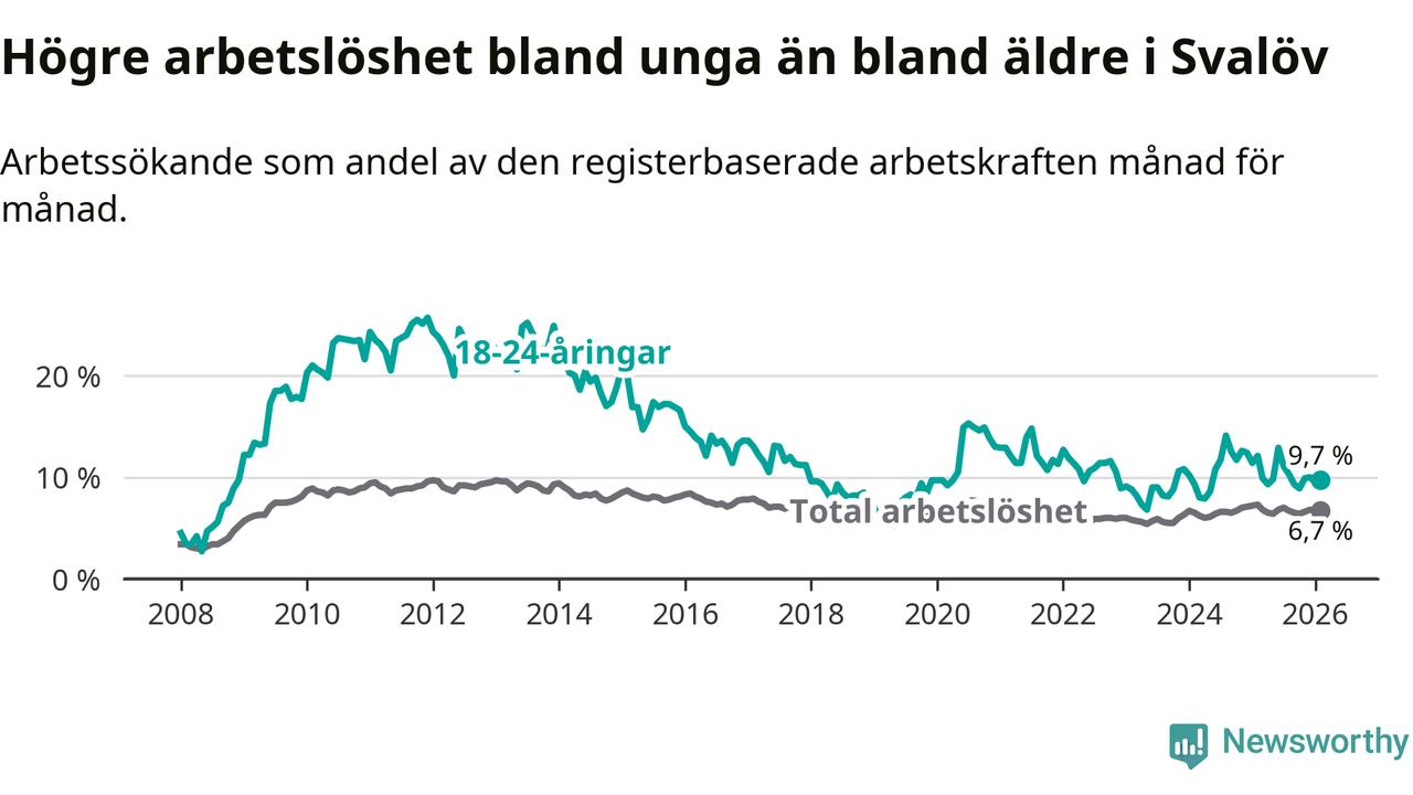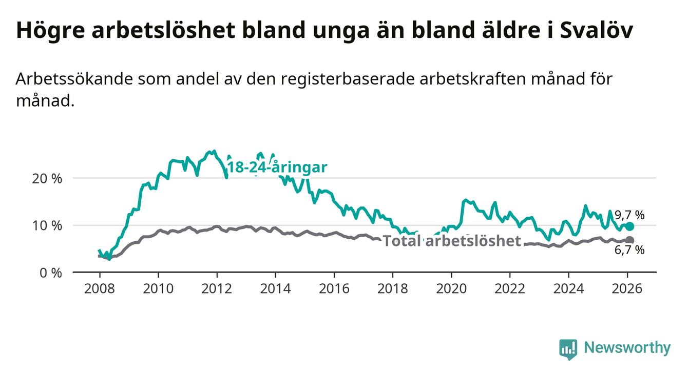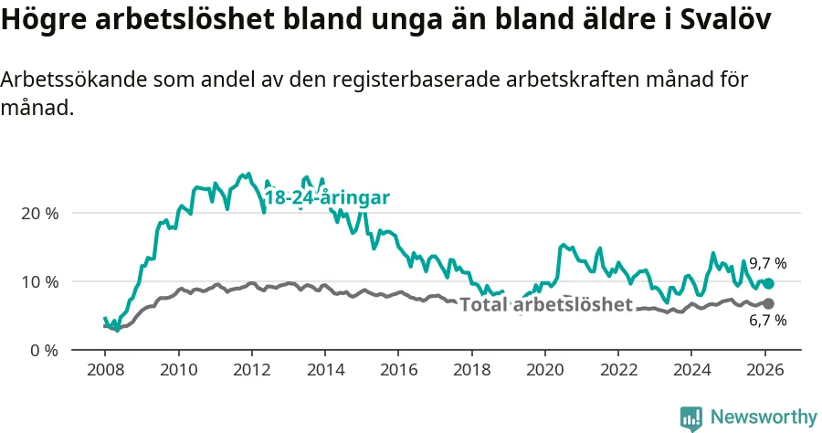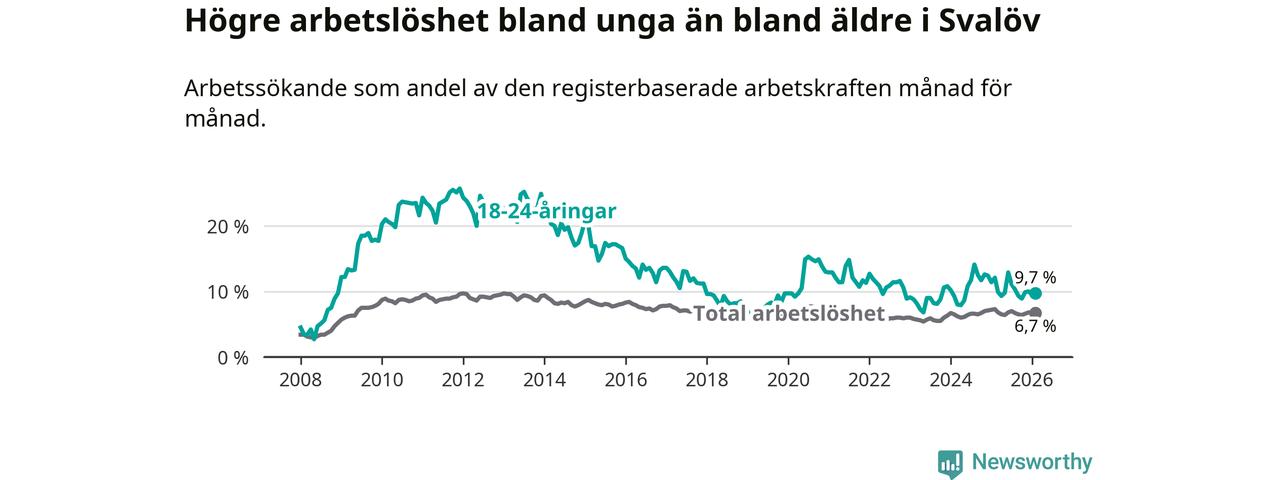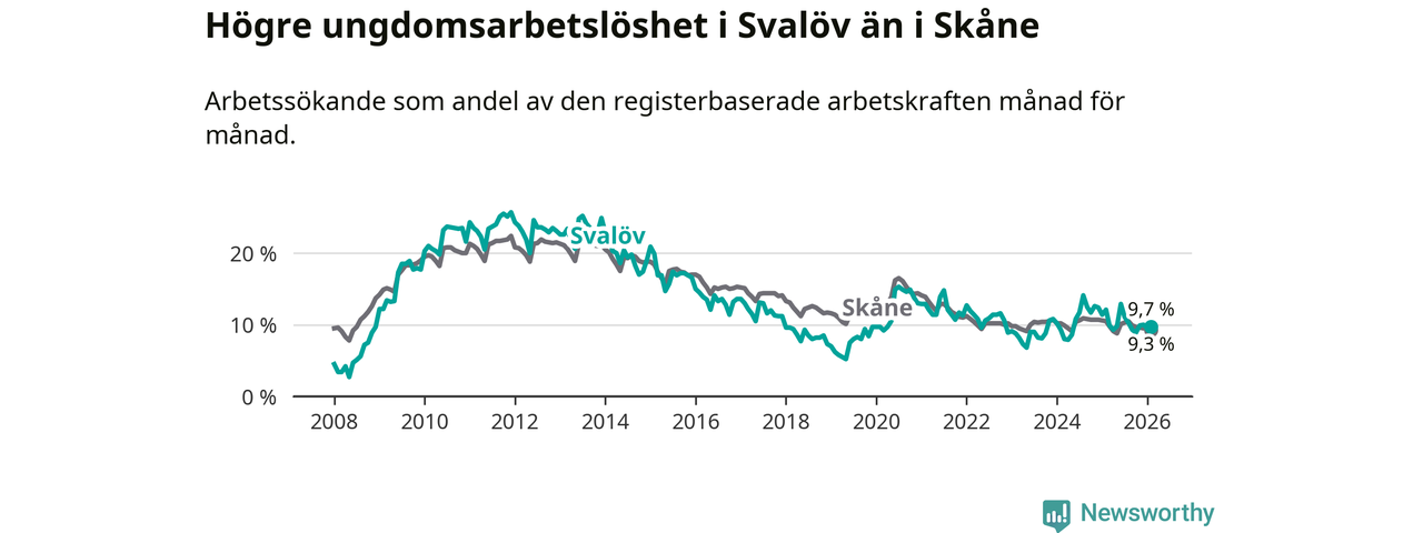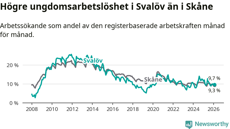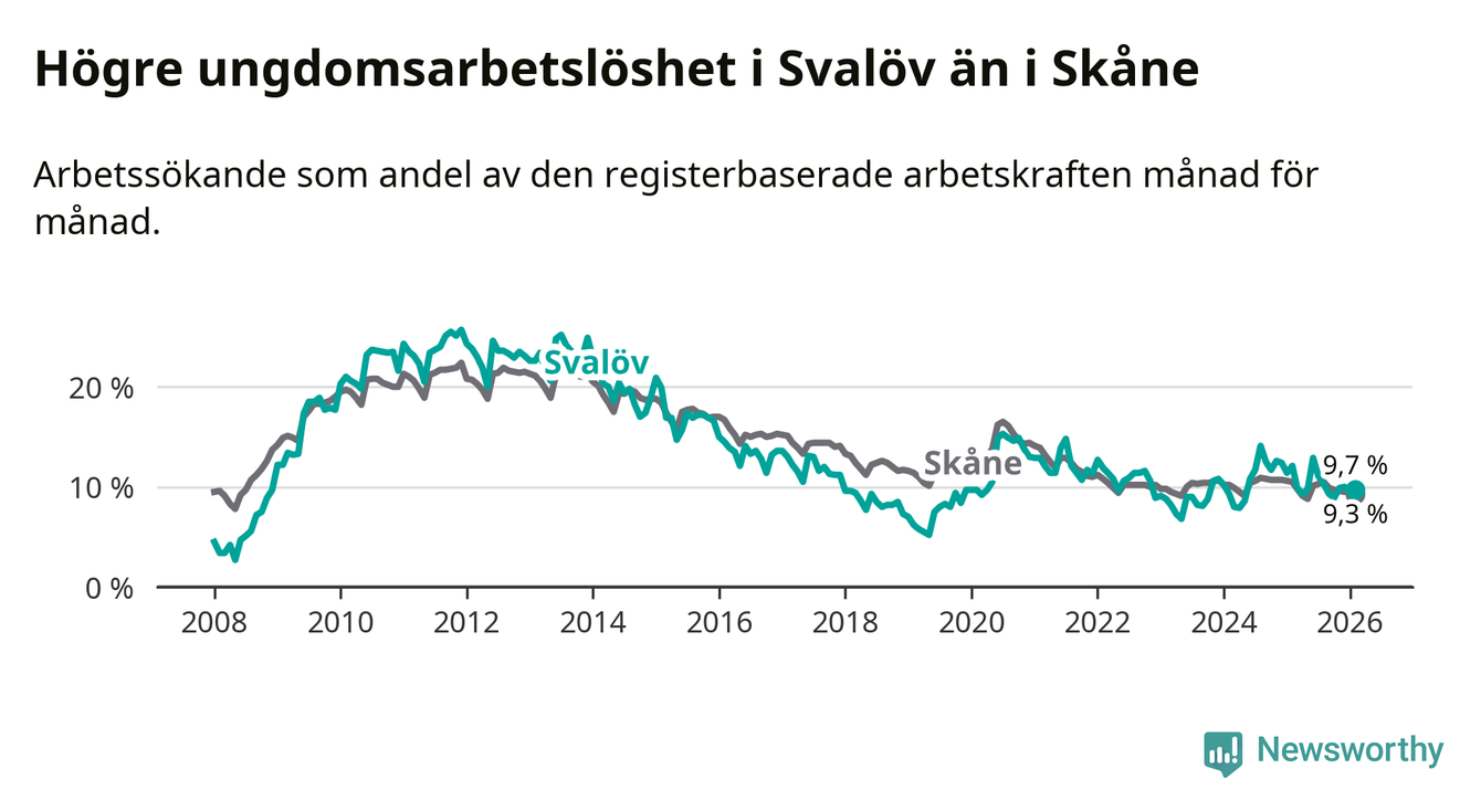 Medan Svalöv har lägre total arbetslöshet än Skåne, ligger ungdomsarbetslösheten 0,4 procentenheter högre i Svalöv.