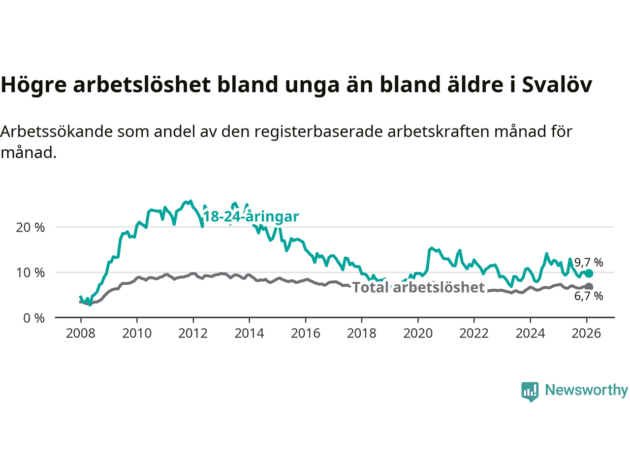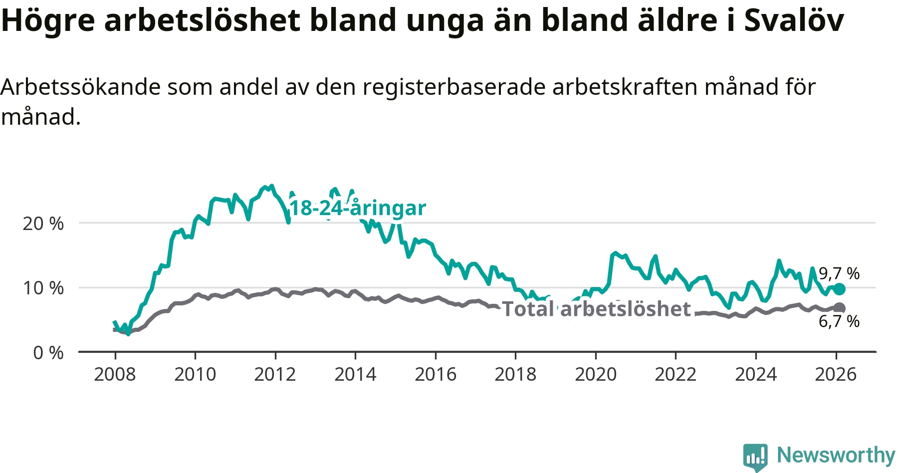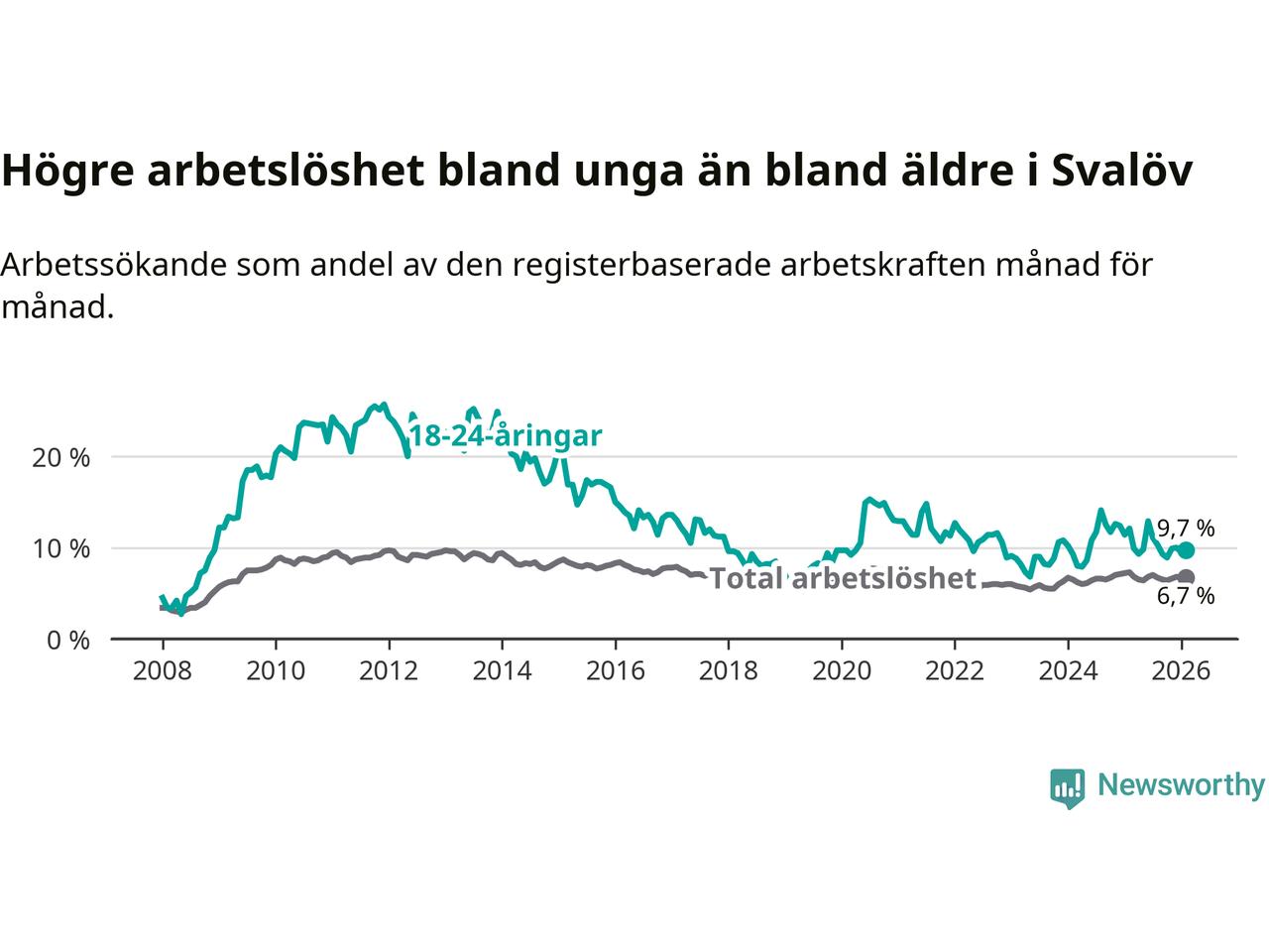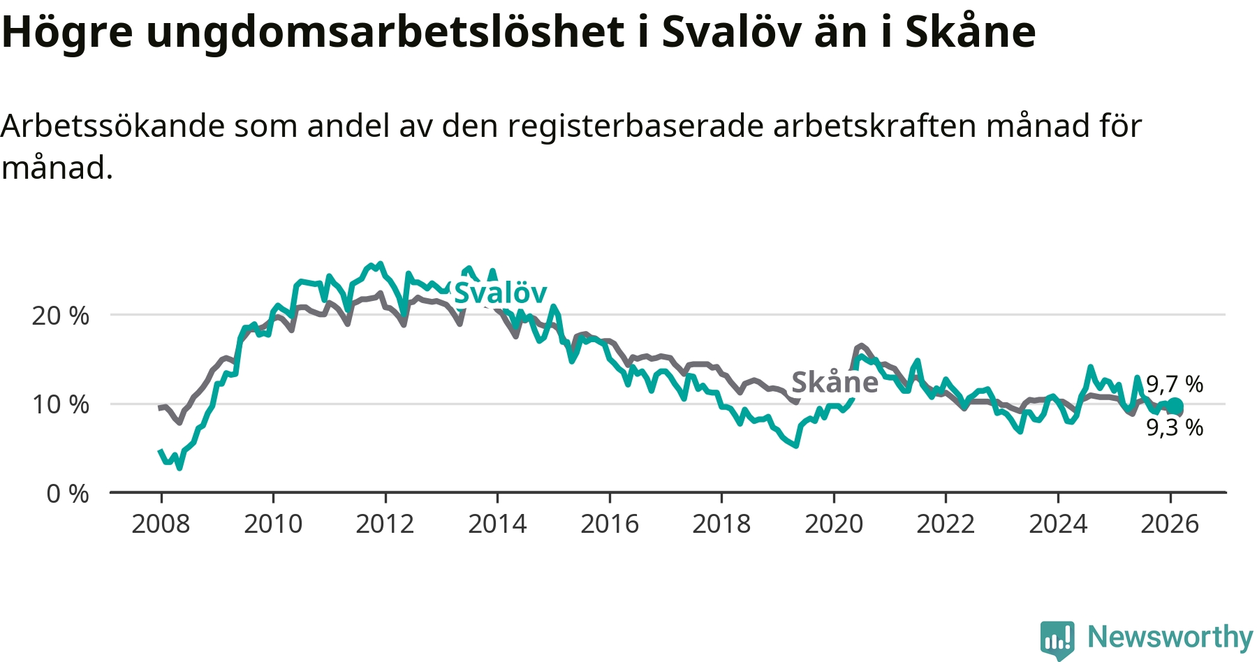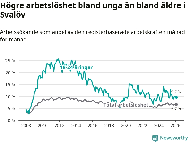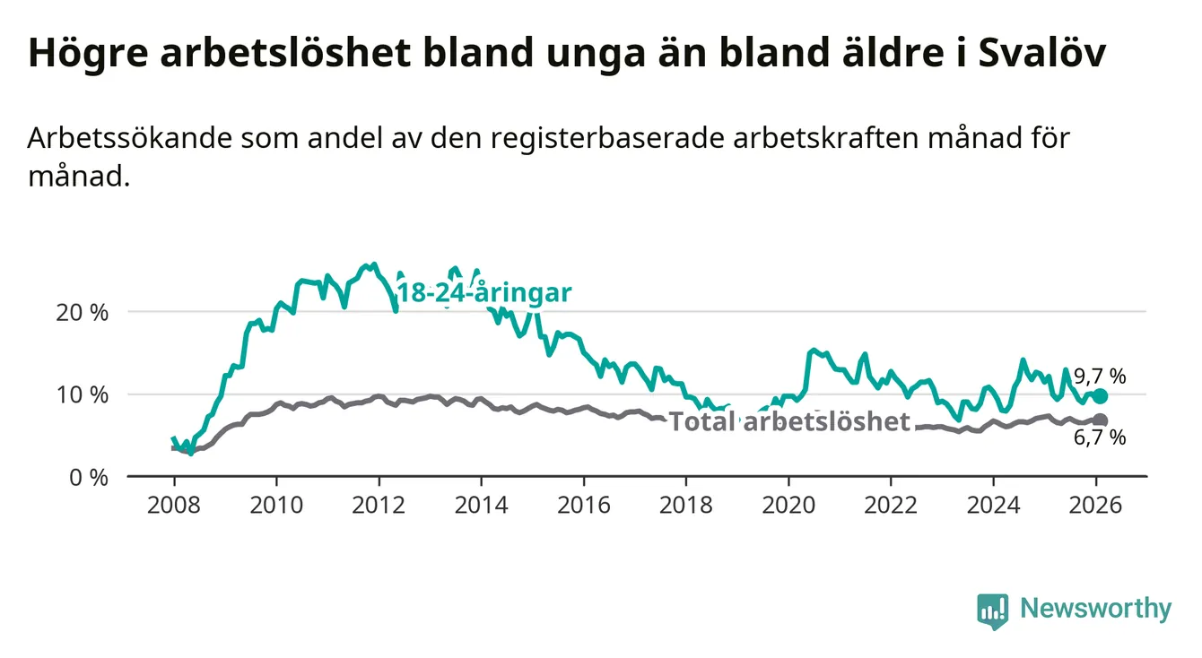 Medan Svalöv har lägre total arbetslöshet än Skåne, ligger ungdomsarbetslösheten 0,4 procentenheter högre i Svalöv.