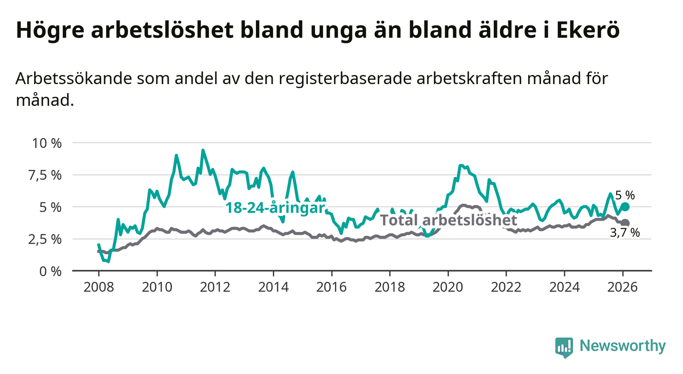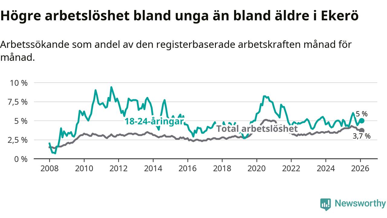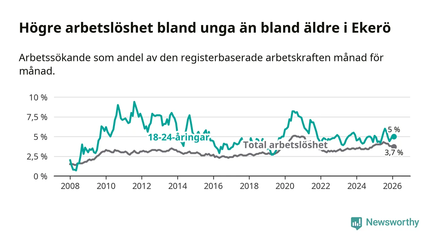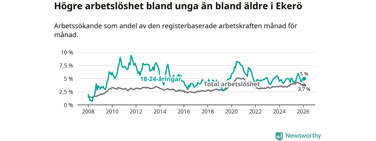 Till skillnad från den totala arbetslösheten stiger arbetslösheten bland unga (+0,1 procentenheter). I februari var 5,0 procent av 18–24-åringarna inskrivna som arbetssökande (motsvarande 63 personer). Mäter vi antalet inskrivna ser vi en ökning med två personer på ett års sikt.