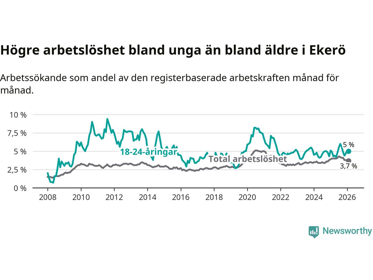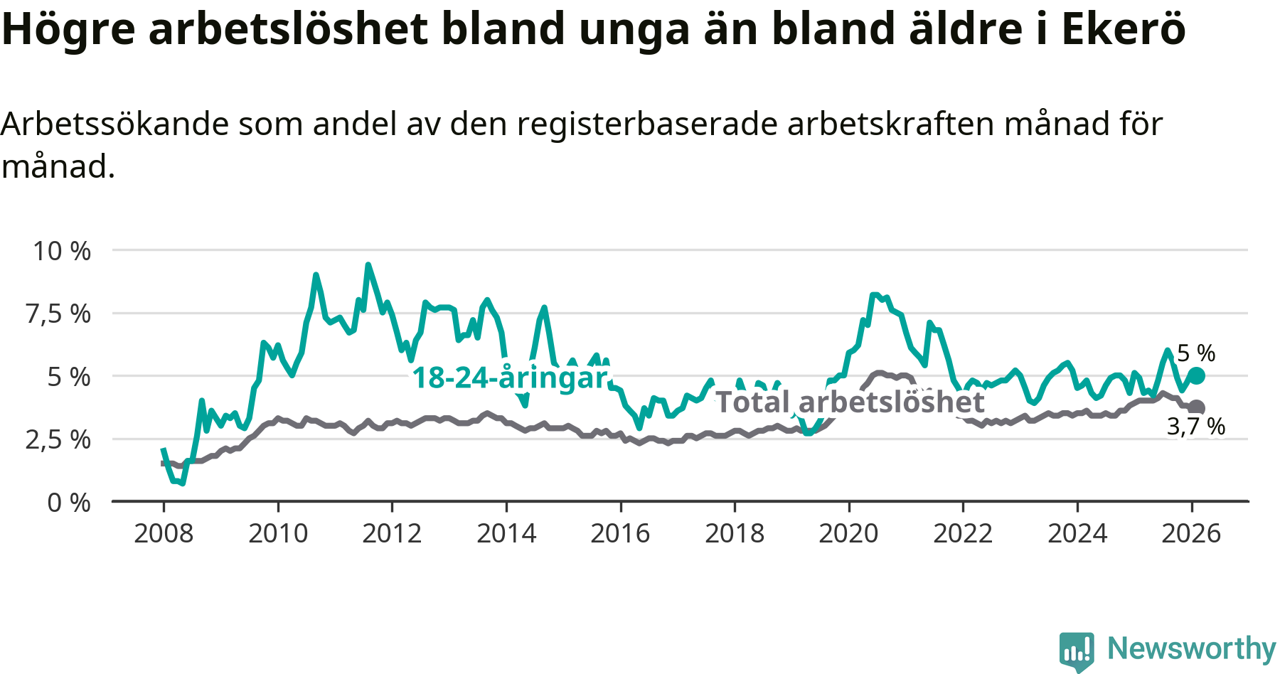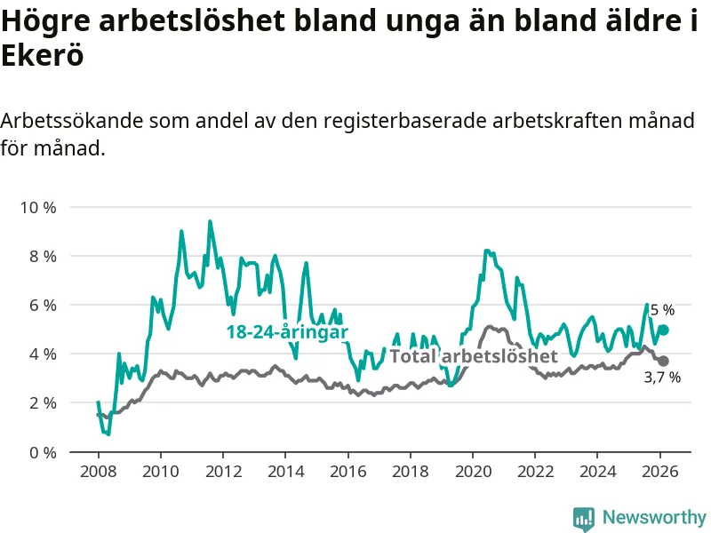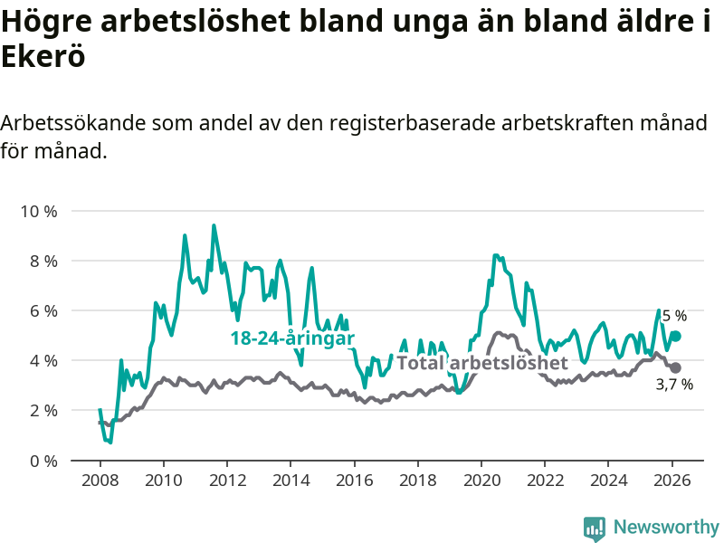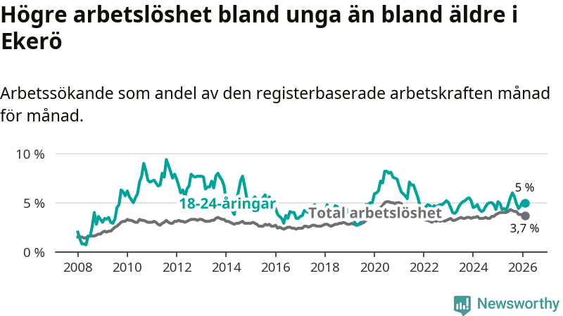 Till skillnad från den totala arbetslösheten stiger arbetslösheten bland unga (+0,1 procentenheter). I februari var 5,0 procent av 18–24-åringarna inskrivna som arbetssökande (motsvarande 63 personer). Mäter vi antalet inskrivna ser vi en ökning med två personer på ett års sikt.