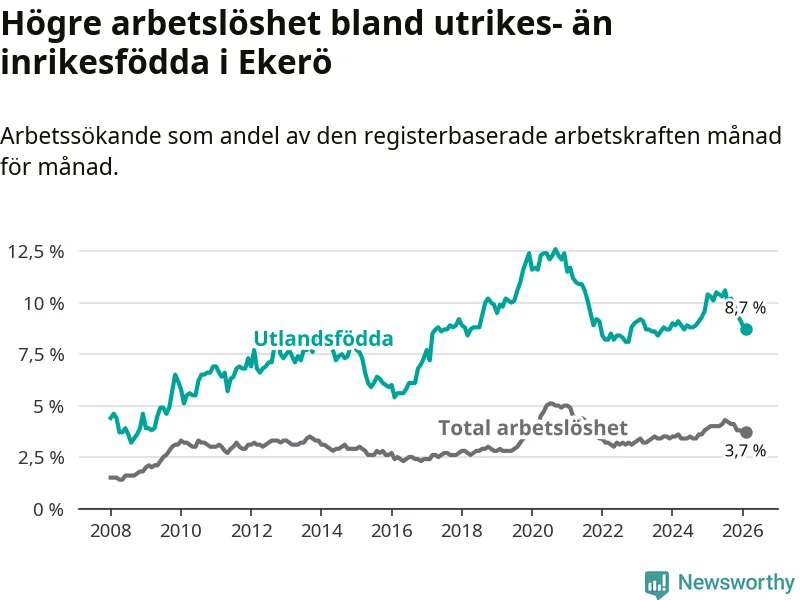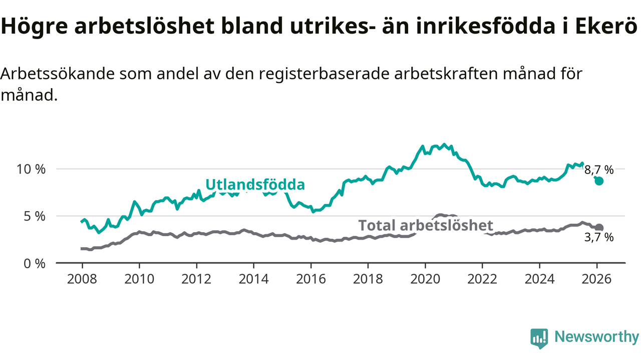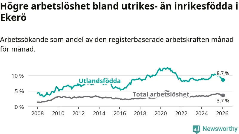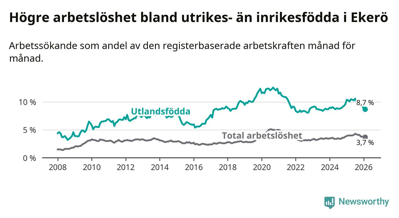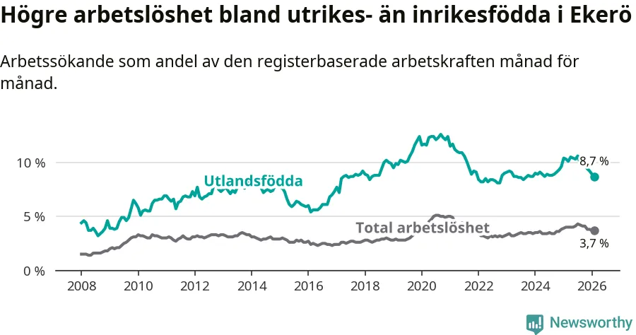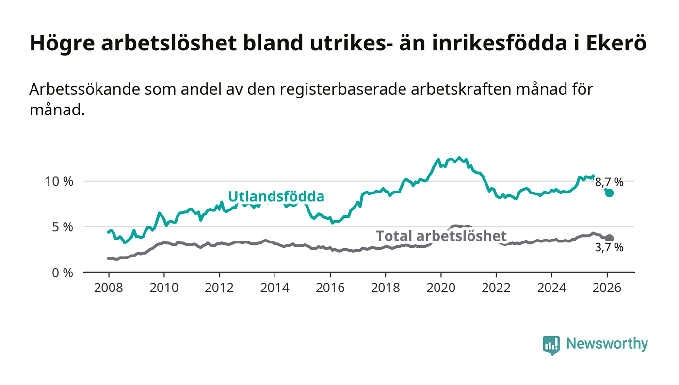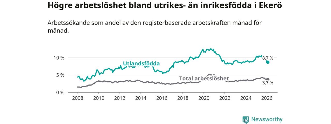 Arbetslösheten bland utlandsfödda var 8,7 procent i Ekerö under februari månad, motsvarande 199 av 2 287 personer. Det är 1,6 procentenheter färre än vid samma tidpunkt i fjol (−28 om man räknar personer).