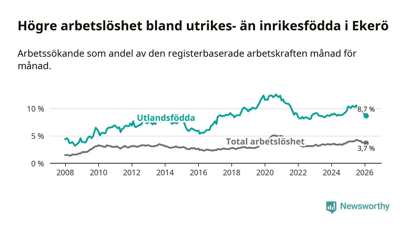 Skillnaden i arbetslöshet mellan utrikesfödda och hela befolkningen är 5,0 procentenheter i Ekerö. Det är en mindre skillnad än för ett år sedan (−1,3 procentenheter).