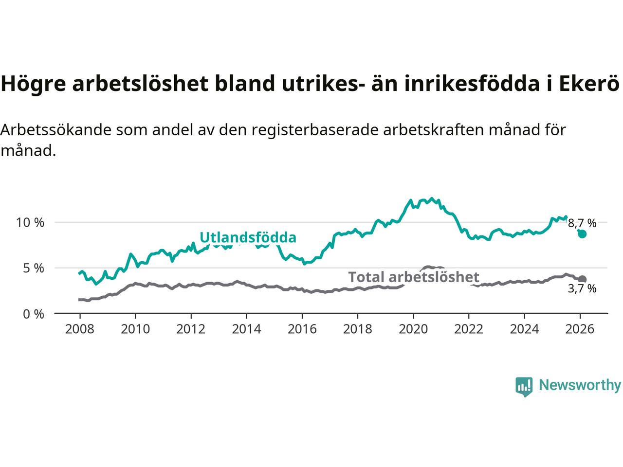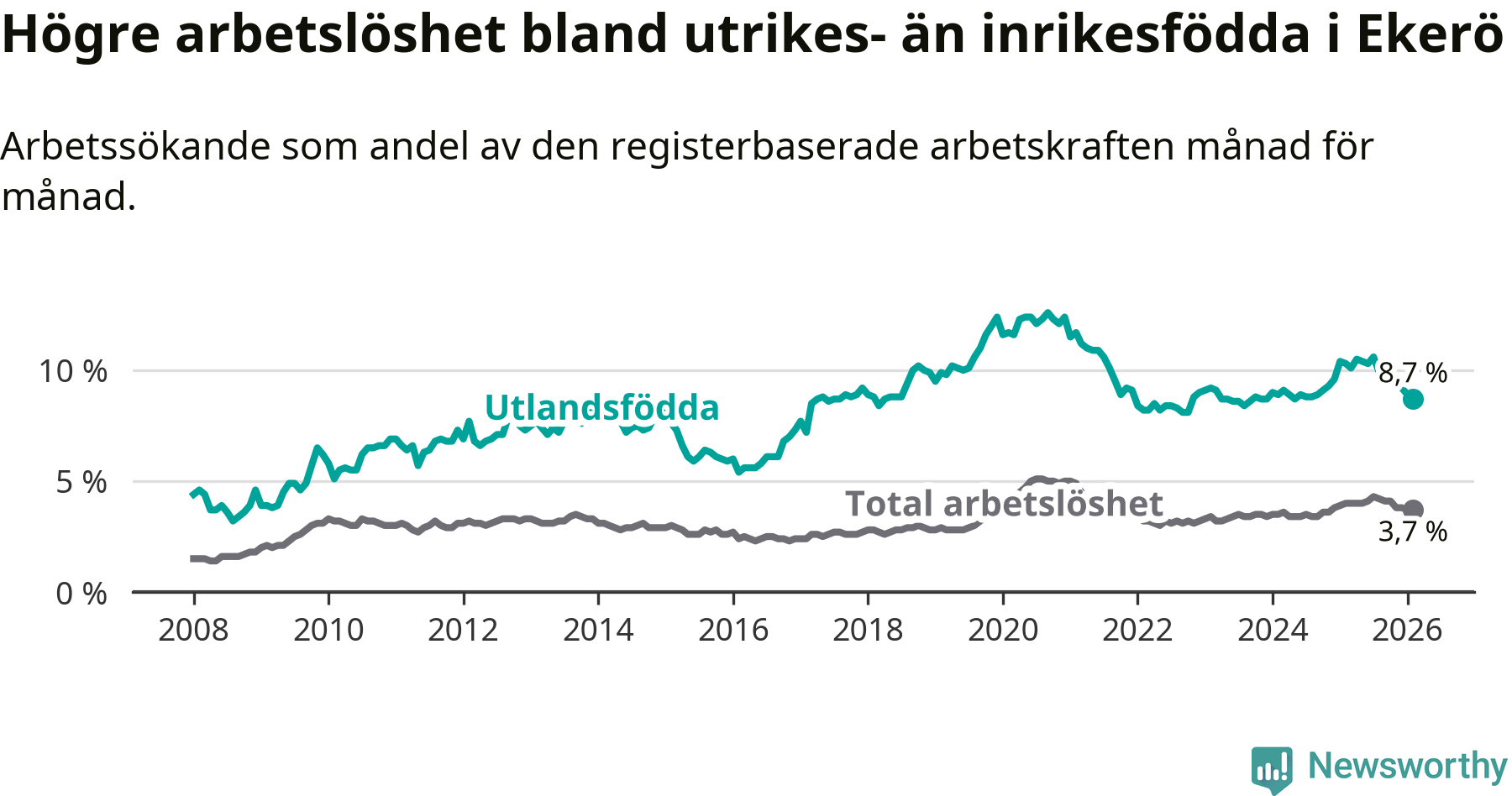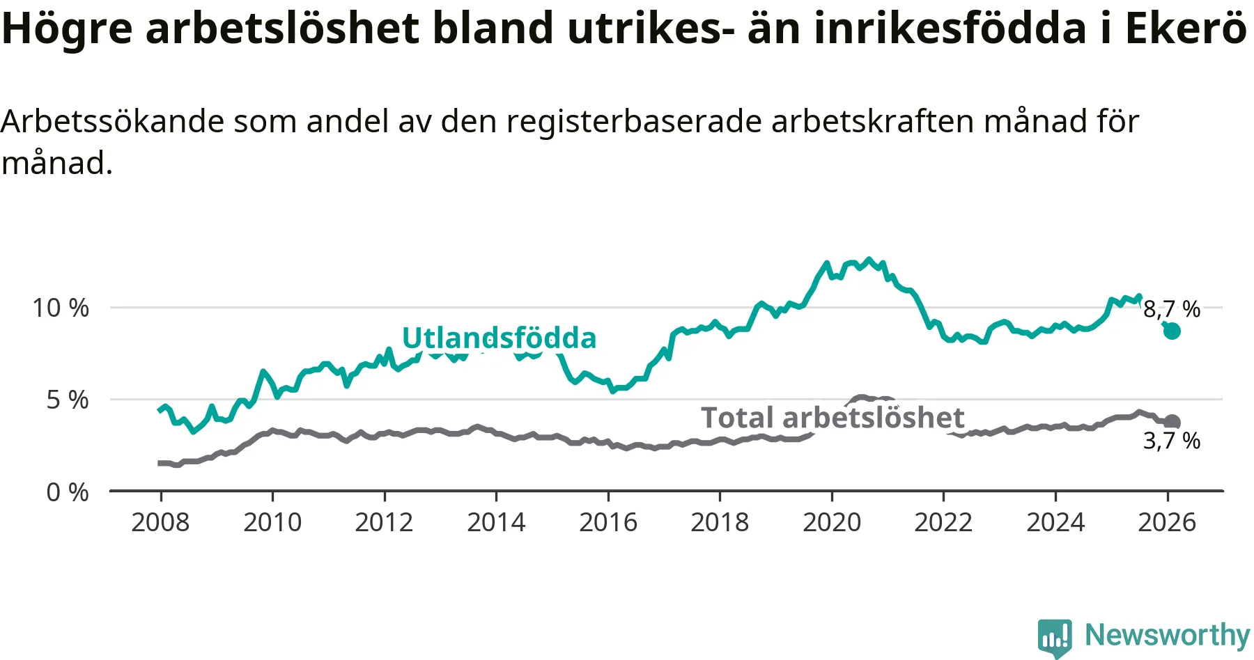 | Bland utlandsfödda | 8,7 % | −1,6 % ▼ | 12,2 % | −1,0 % ▼ | 14,3 % | −1,4 % ▼ |