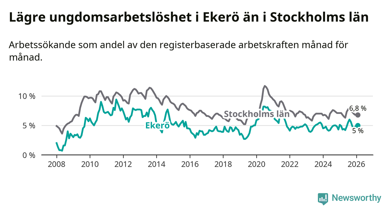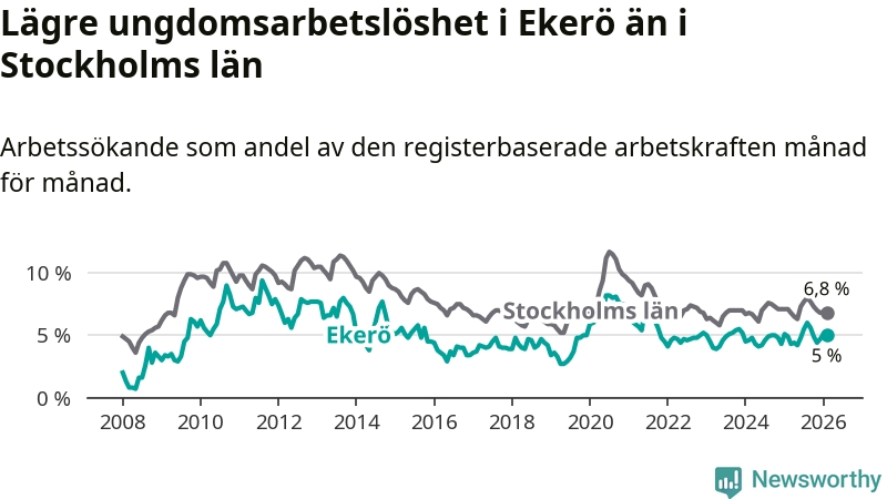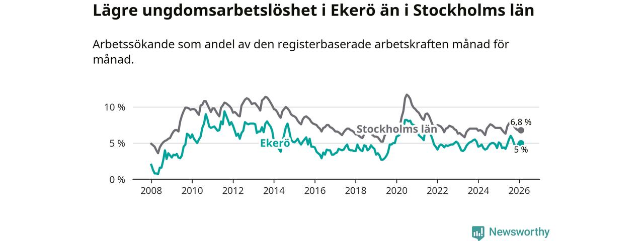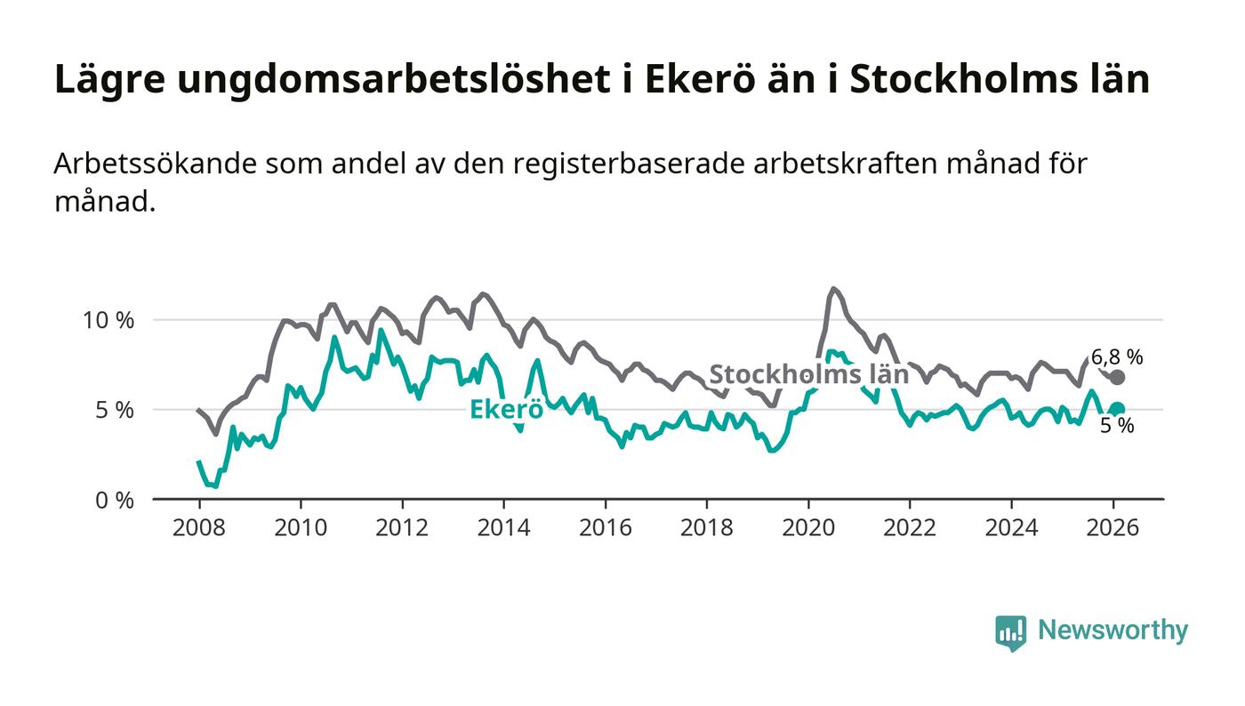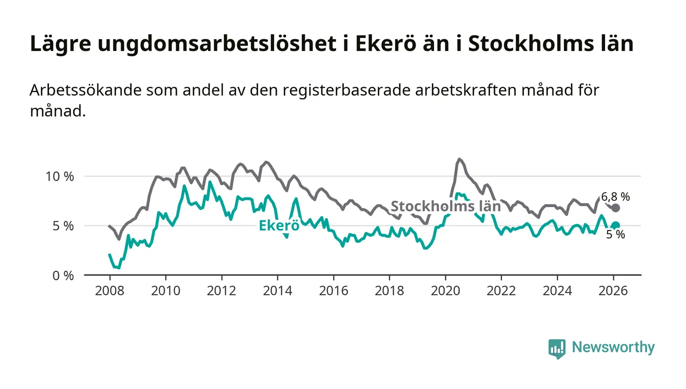 Precis som den totala arbetslösheten ligger ungdomsarbetslösheten i Ekerö lägre än i Stockholms län som helhet. Skillnaden mellan kommunen och länet är 1,8 procentenheter.