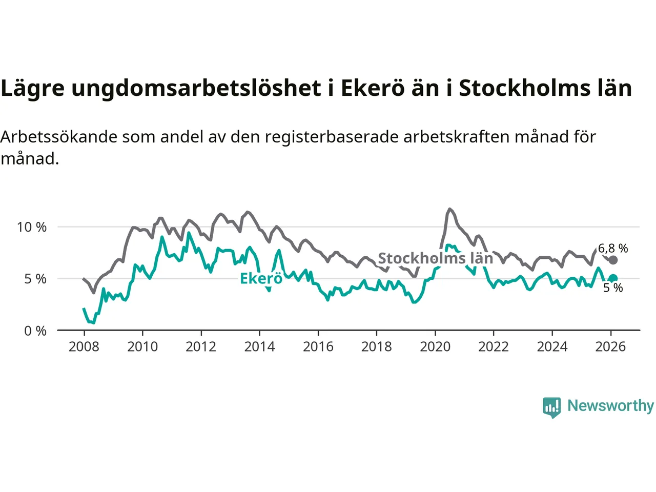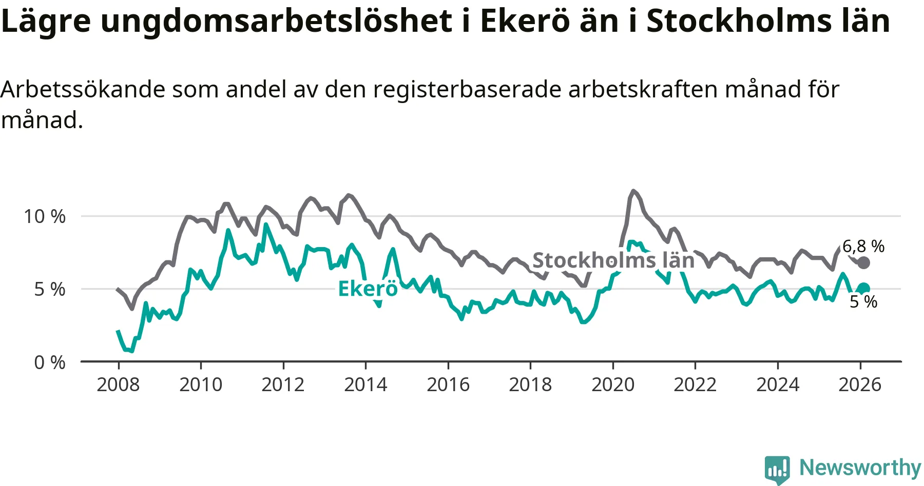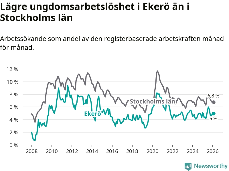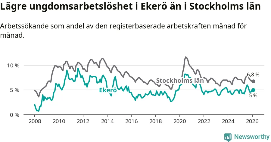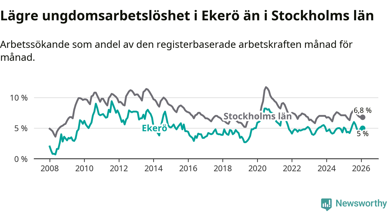 Precis som den totala arbetslösheten ligger ungdomsarbetslösheten i Ekerö lägre än i Stockholms län som helhet. Skillnaden mellan kommunen och länet är 1,8 procentenheter.