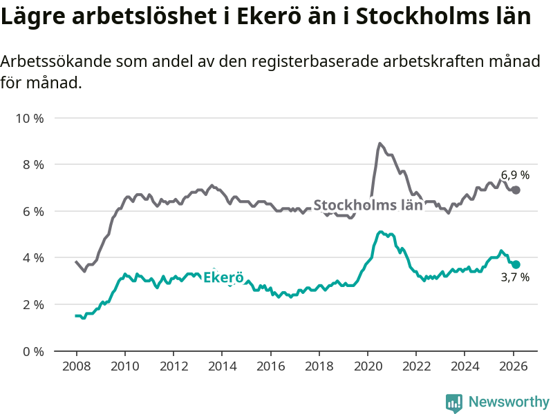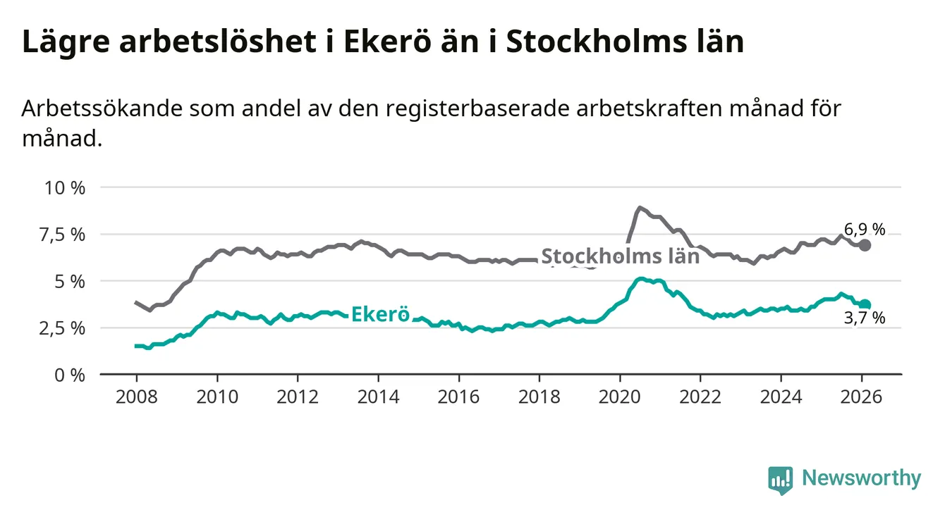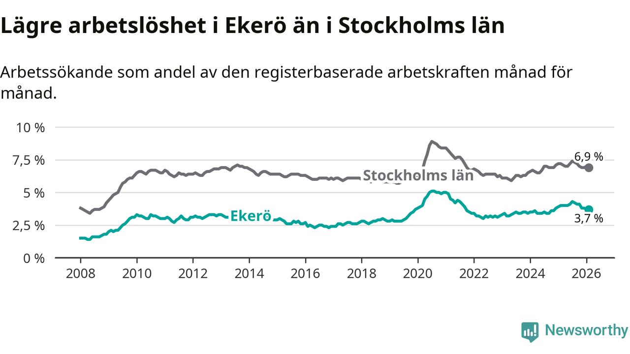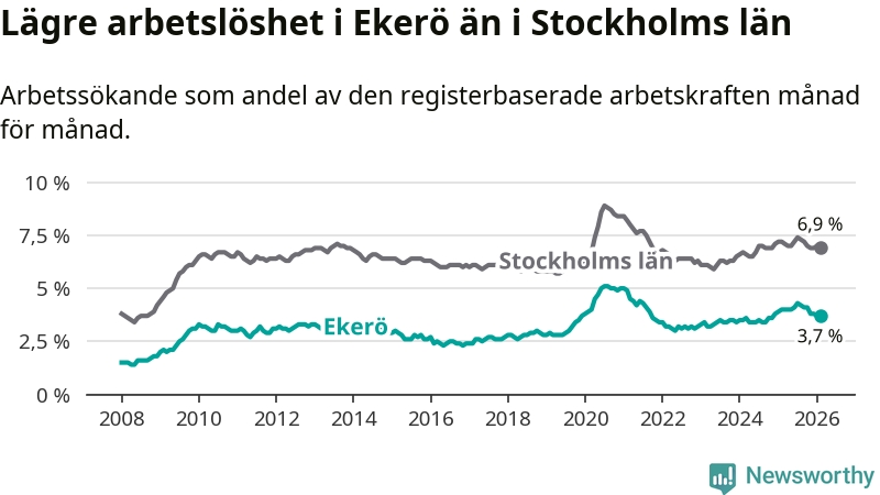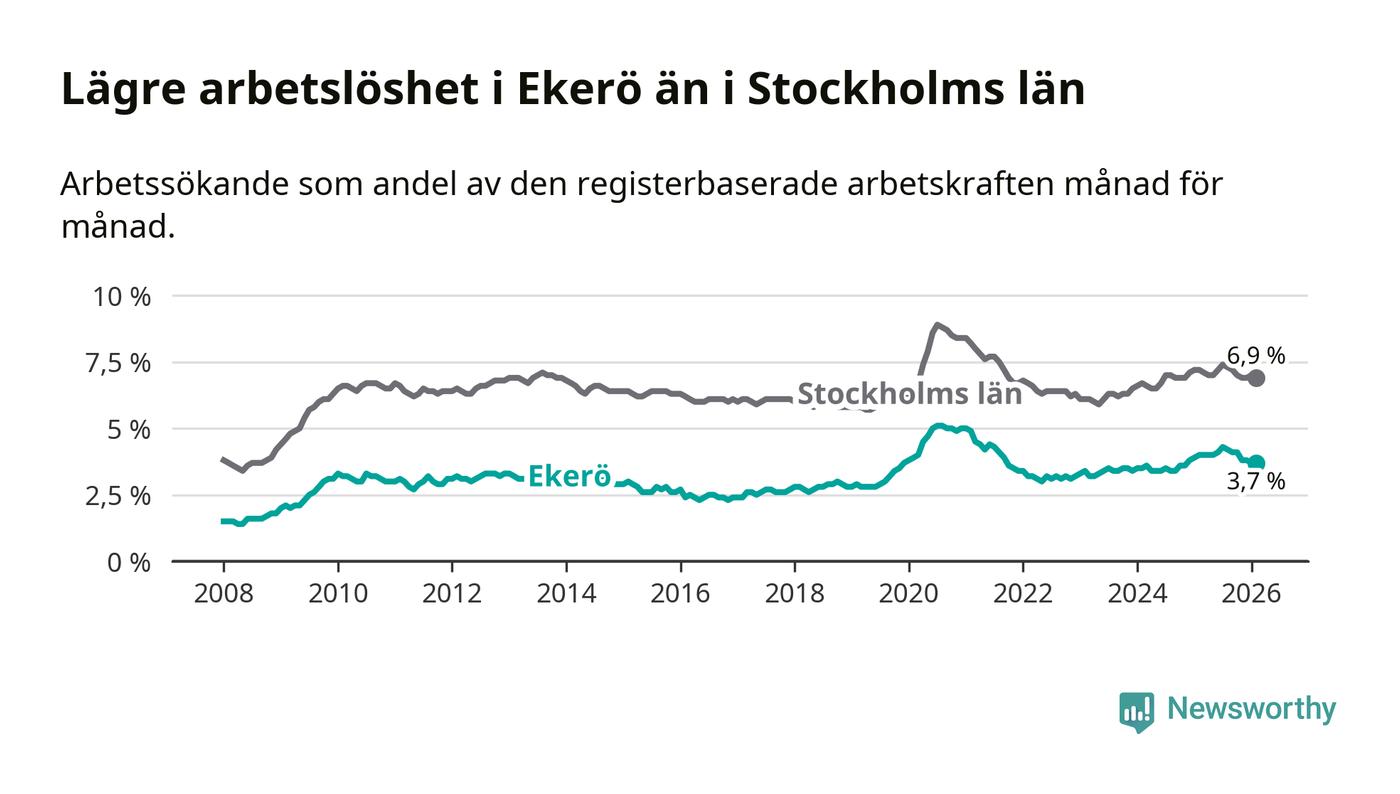 Ekerö hade redan tidigare lägre arbetslöshet än snittet i hela Stockholms län och nu växer klyftan (3,7 procent i kommunen, jämfört med 6,9 procent i hela länet). Ekerö har därmed även den lägsta arbetslöshetsnivån i länet. Södertälje har den högsta (10,8 procent).