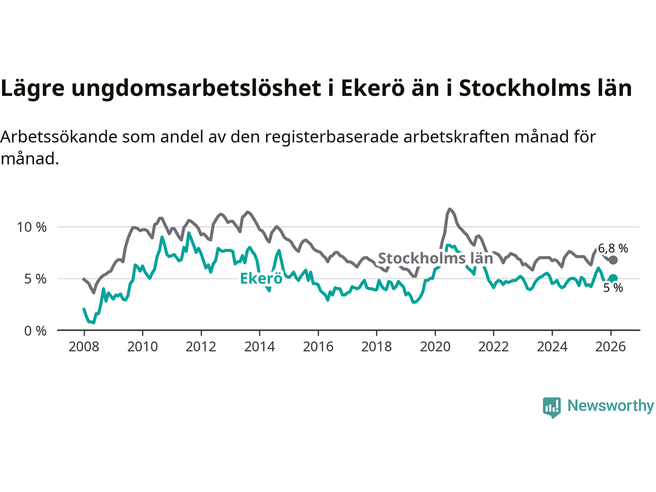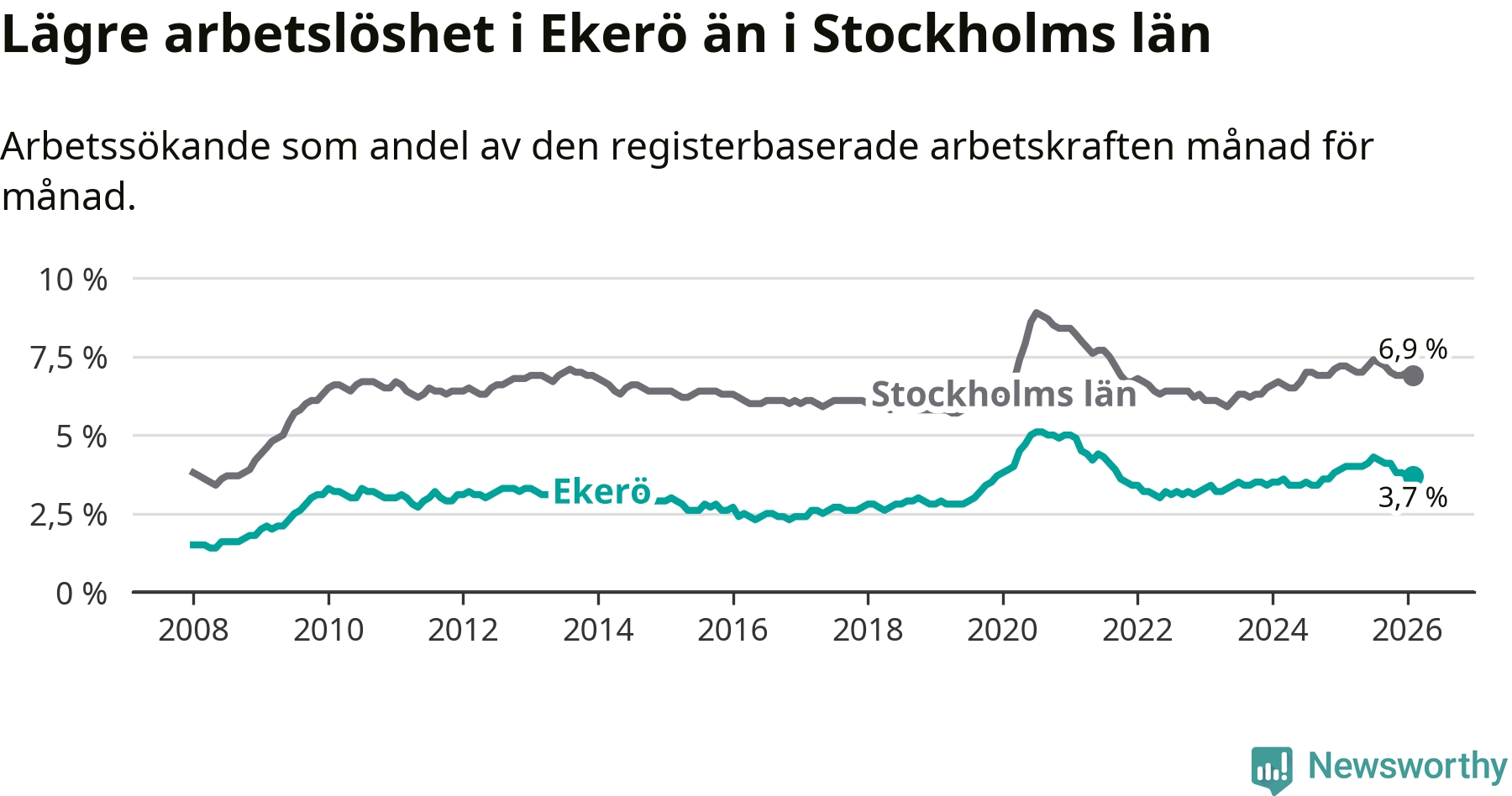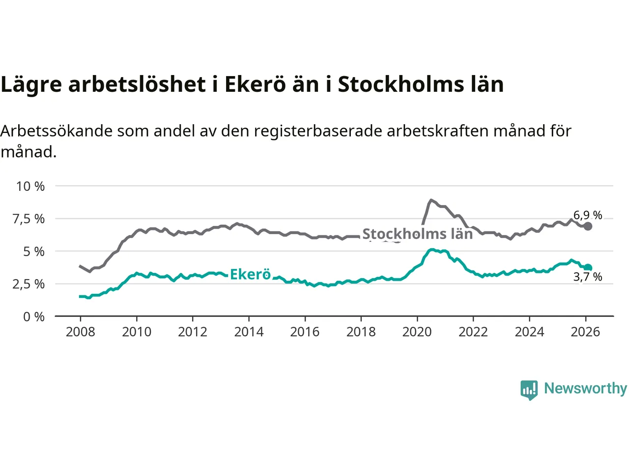 Ekerö hade redan tidigare lägre arbetslöshet än snittet i hela Stockholms län och nu växer klyftan (3,7 procent i kommunen, jämfört med 6,9 procent i hela länet). Ekerö har därmed även den lägsta arbetslöshetsnivån i länet. Södertälje har den högsta (10,8 procent).