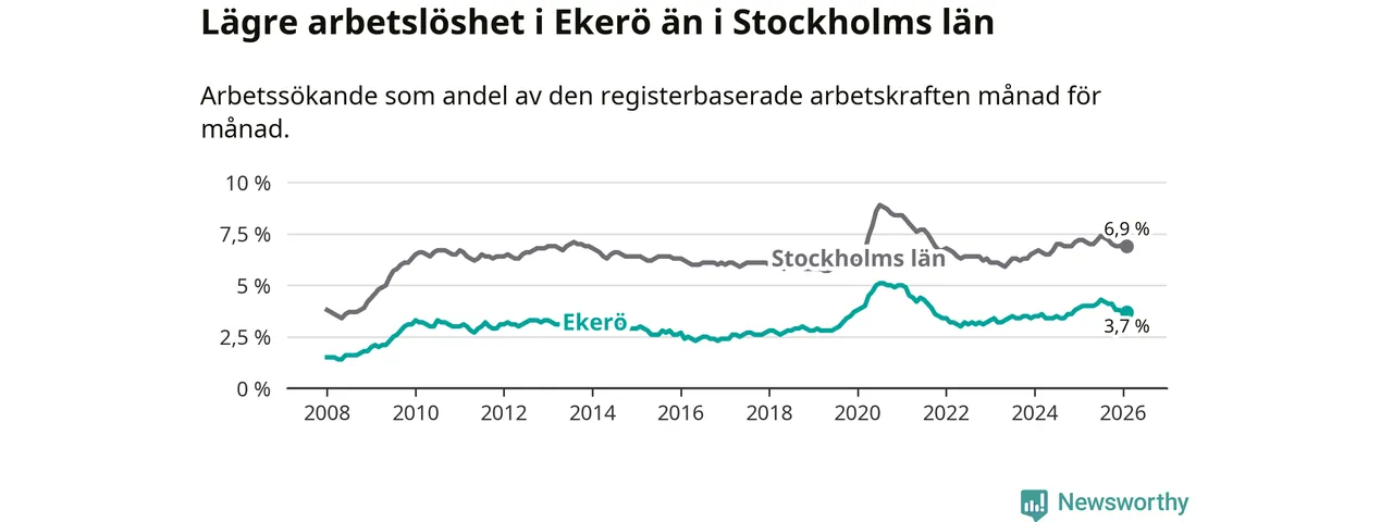 Under februari månad rapporterade Ekerö kommun en total arbetslöshet på 3,7 procent. Det är en minskning jämfört med samma tidpunkt i fjol (−0,3 procentenheter). Även i Stockholms län sjunker arbetslösheten .