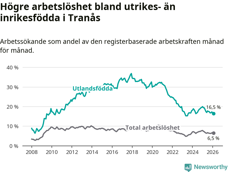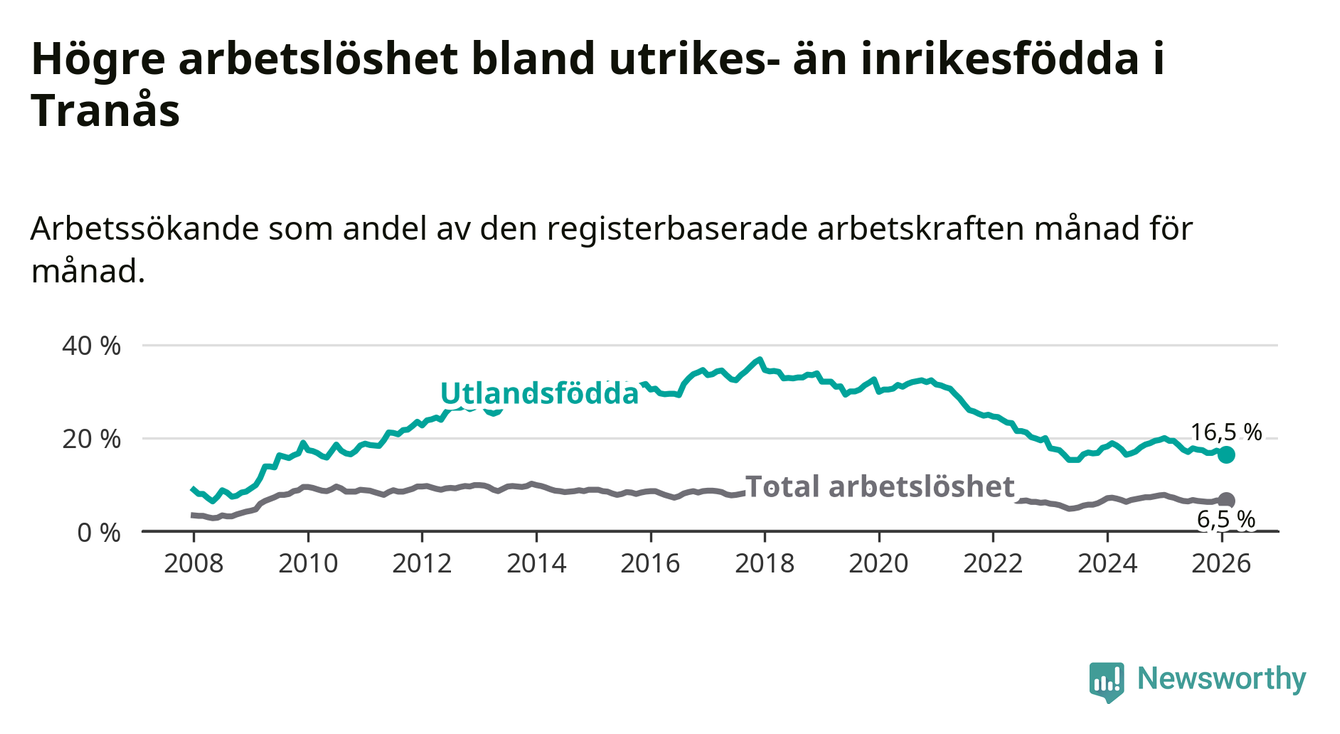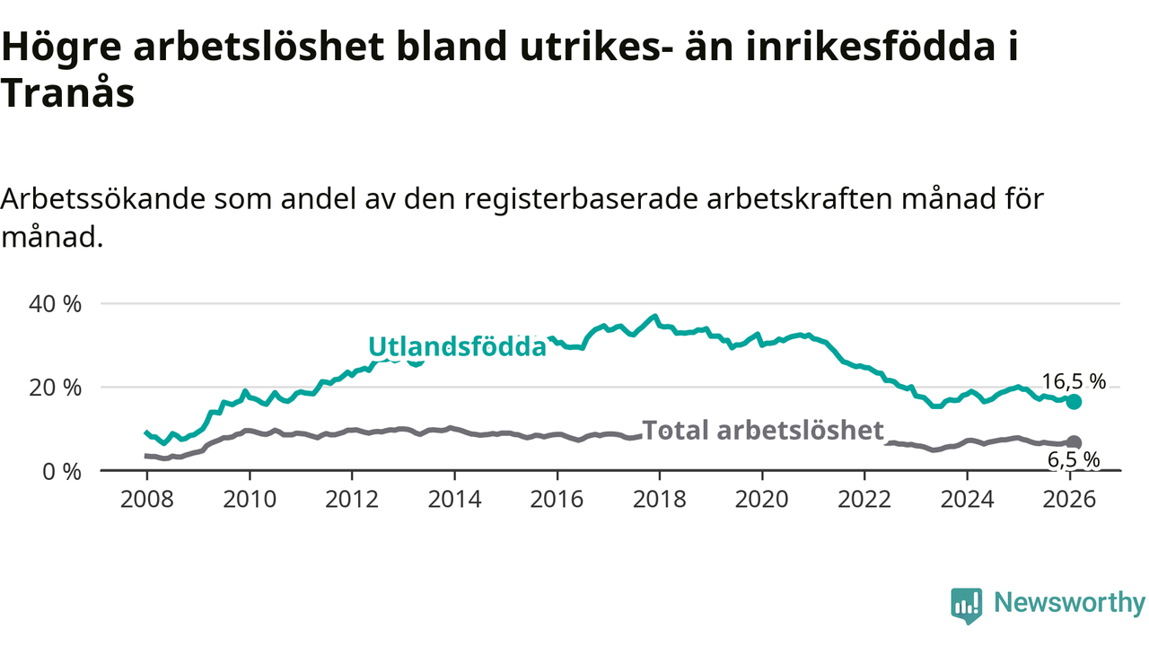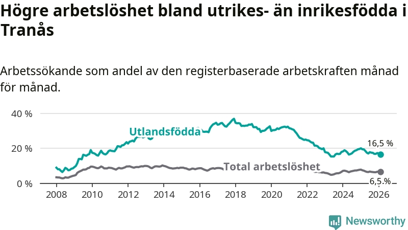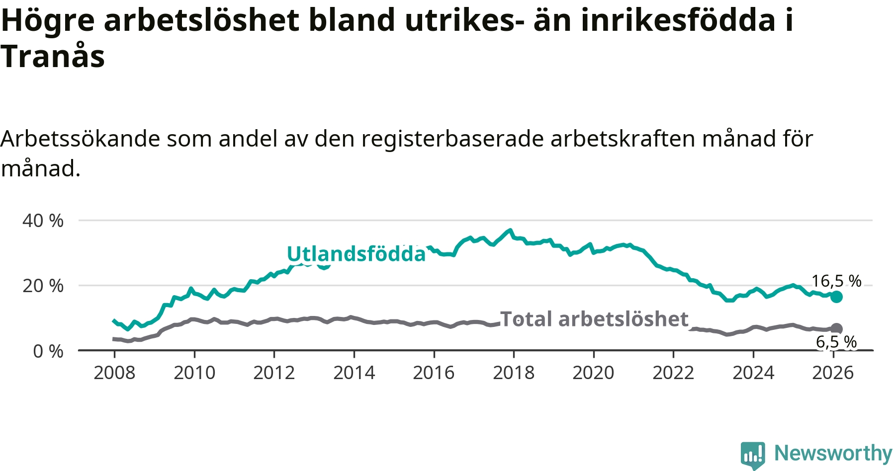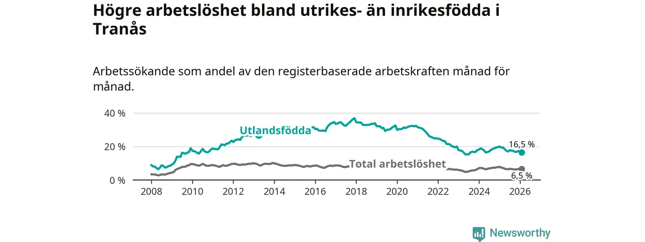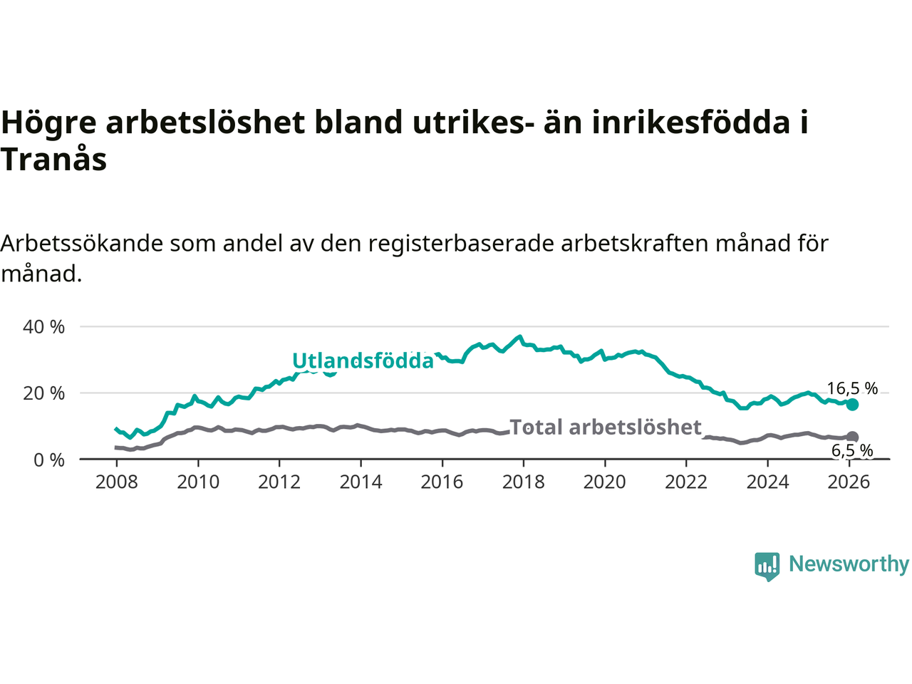 Arbetslösheten bland utlandsfödda var 16,5 procent i Tranås under februari månad, motsvarande 291 av 1 764 personer. Det är 2,9 procentenheter färre än vid samma tidpunkt i fjol (−58 om man räknar personer). Därmed är de utlandsföddas arbetslöshet lägre än vid samma tidpunkt i fjol för sjunde månaden i följd. Sedan juli 2025 har arbetslösheten bland utlandsfödda minskat från 17,8 till 16,5 procent.