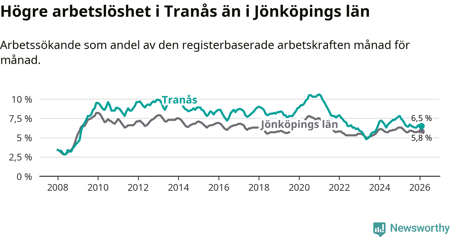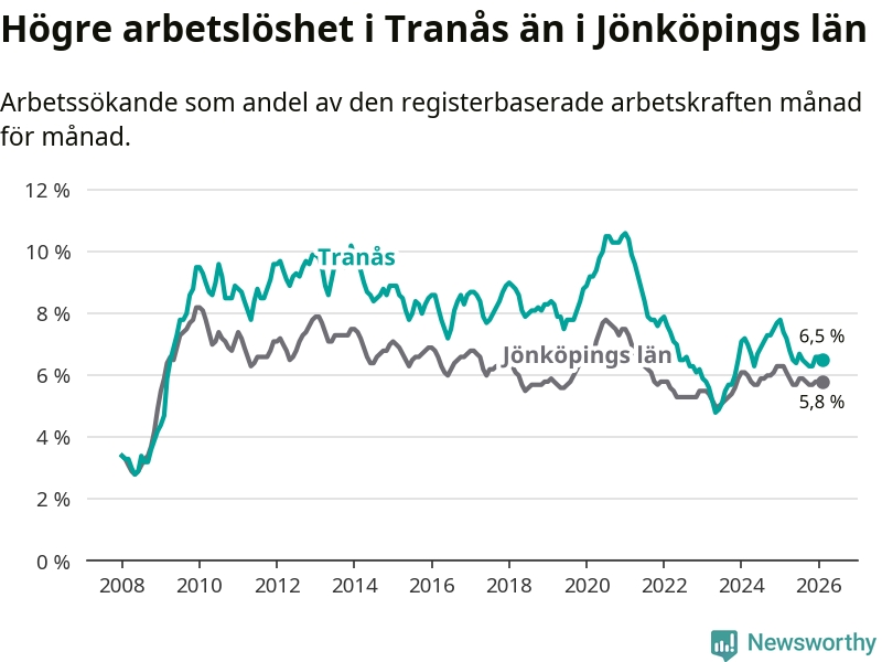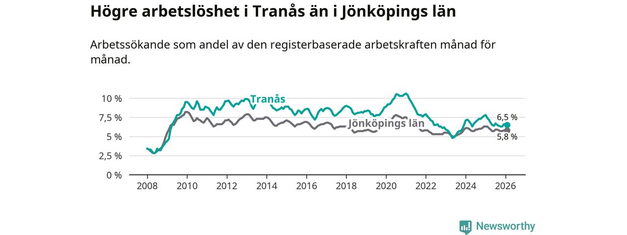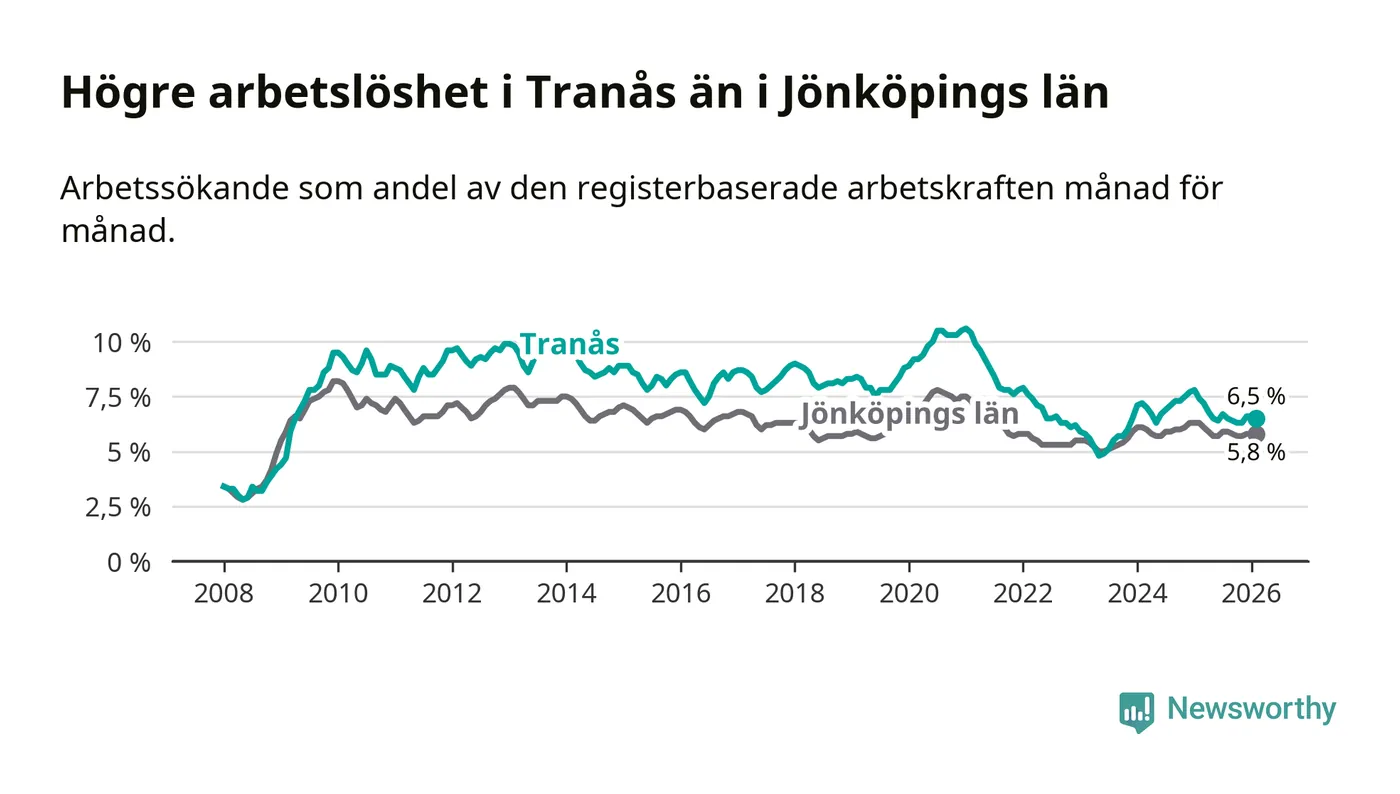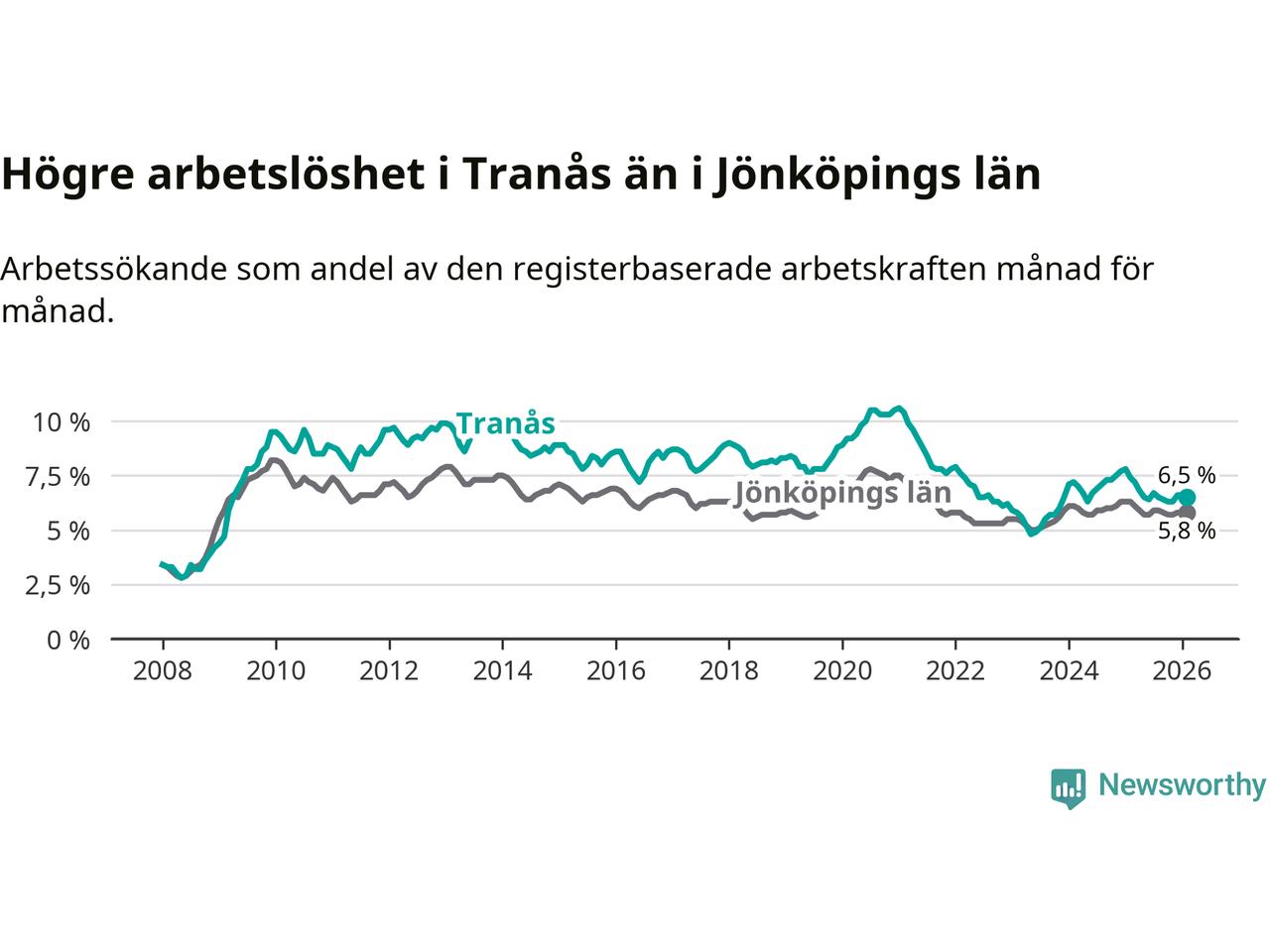 Även om arbetslösheten i Tranås alltså minskar, så ligger den fortfarande över snittet i hela Jönköpings län (6,5 procent i kommunen, jämfört med 5,8 procent i hela länet). Habo har den lägsta arbetslösheten i länet (3,3 procent), medan Nässjö och Sävsjö har den högsta (7,5 procent). För att Tranås skulle komma ner i samma arbetslöshetsnivå som Habo skulle 283 personer behöva sysselsättas.