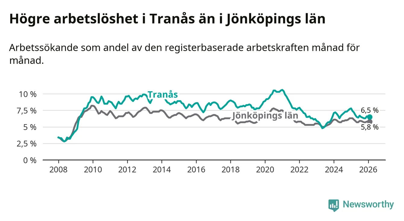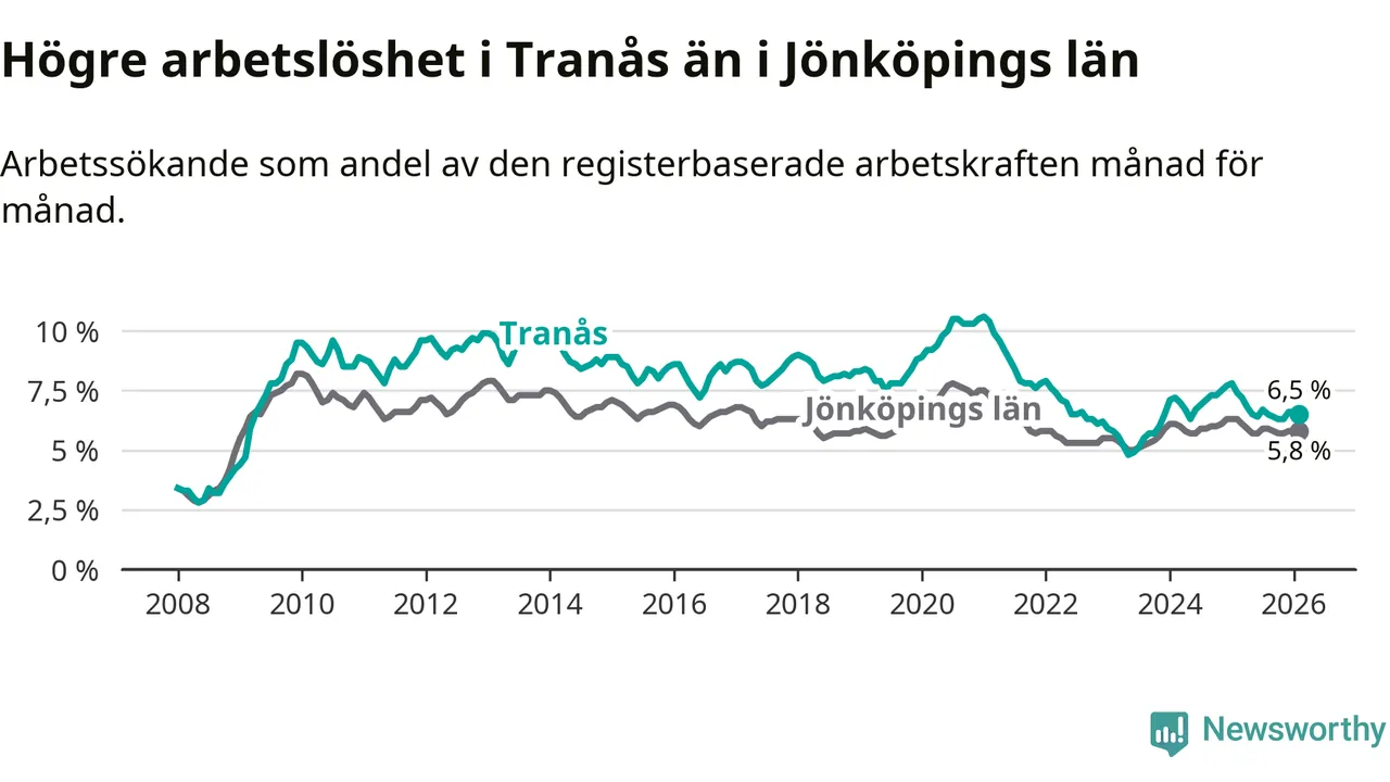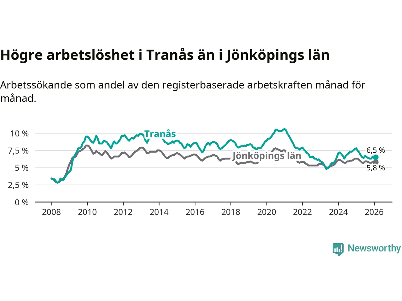 Under februari månad rapporterade Tranås kommun en total arbetslöshet på 6,5 procent. Det är en minskning jämfört med samma tidpunkt i fjol (−0,9 procentenheter). Även i Jönköpings län sjunker arbetslösheten .