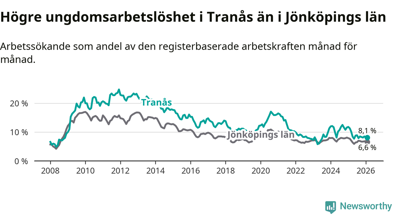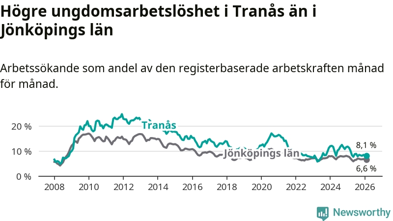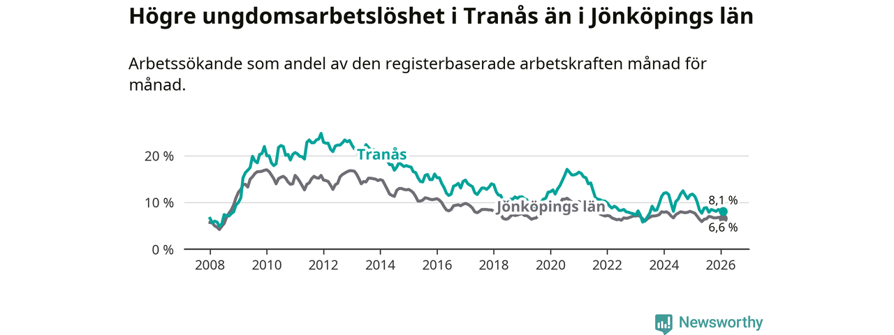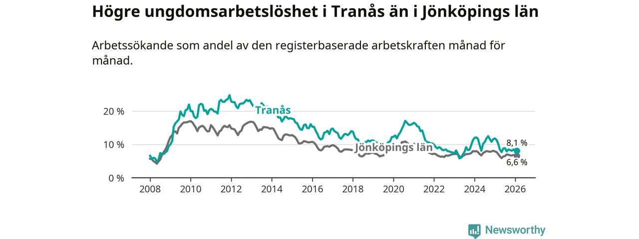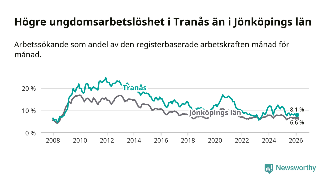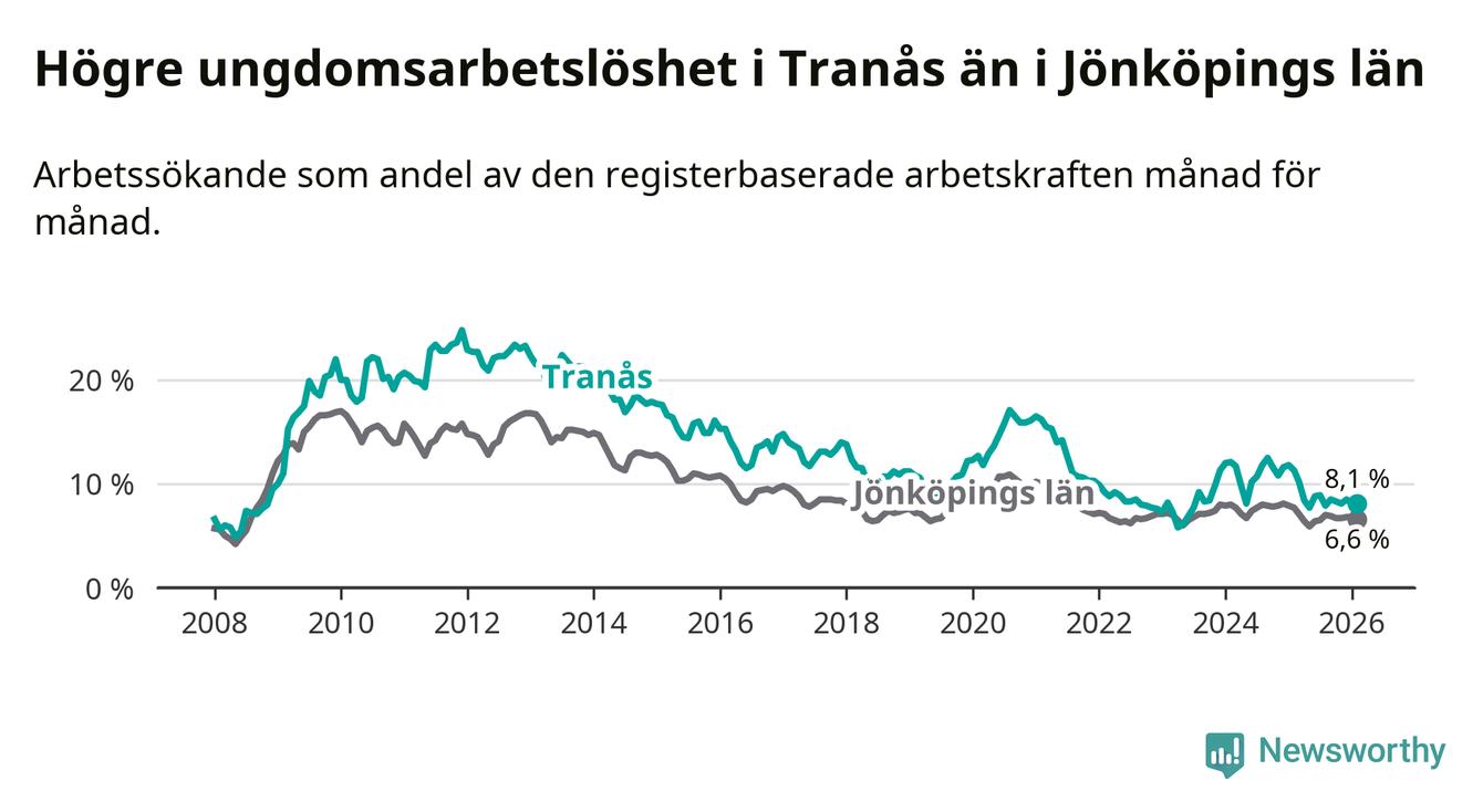 I och med den senaste månadens nedgång har de ungas arbetslöshet i Tranås sjunkit 14 månader i följd (ner från 11,6 procent i december 2024 till 8,1 procent nu).