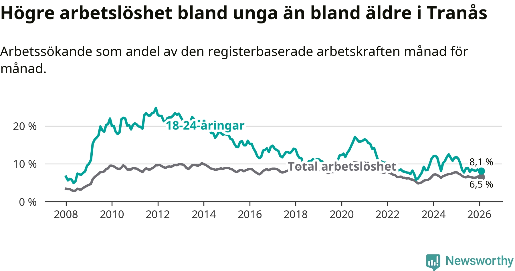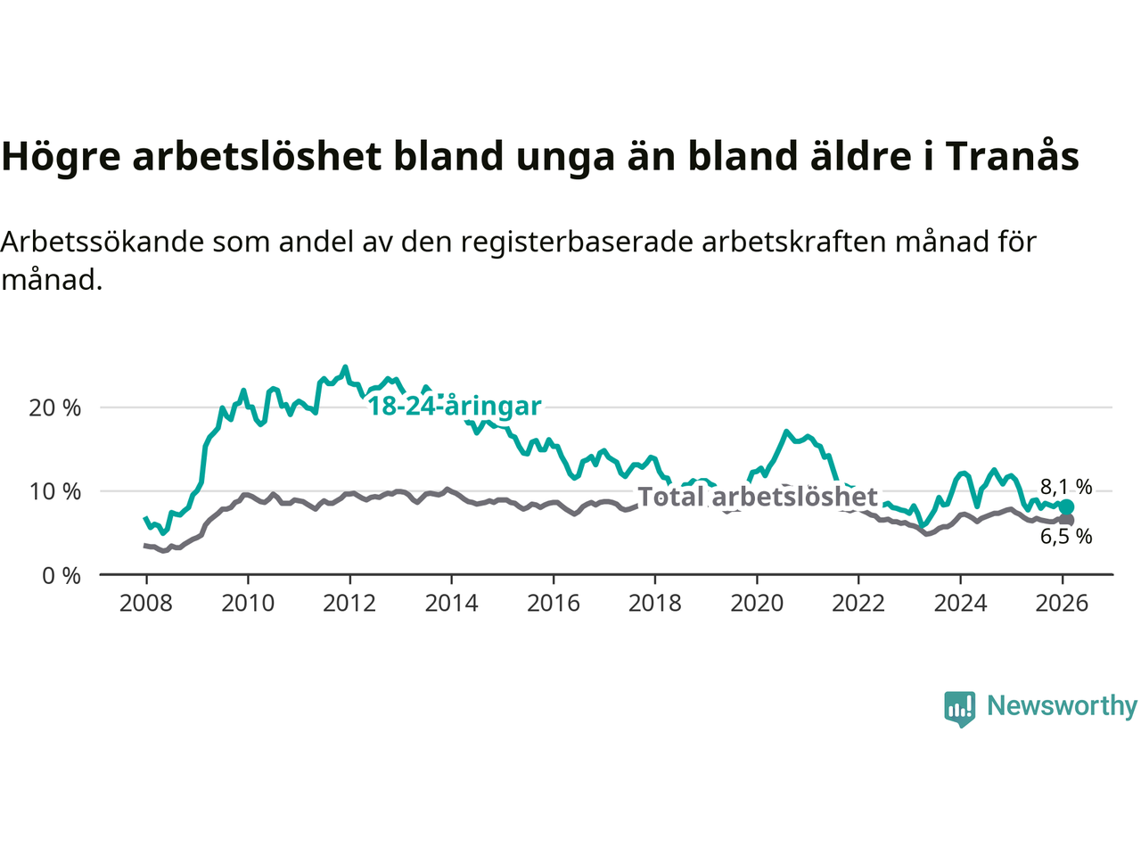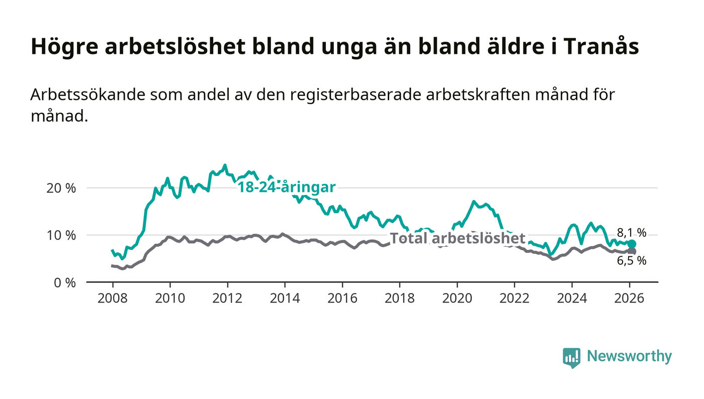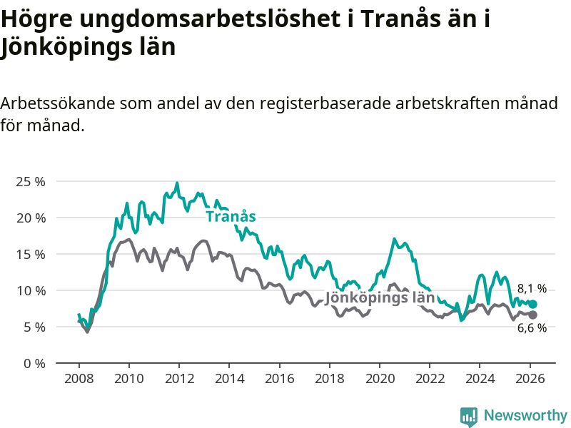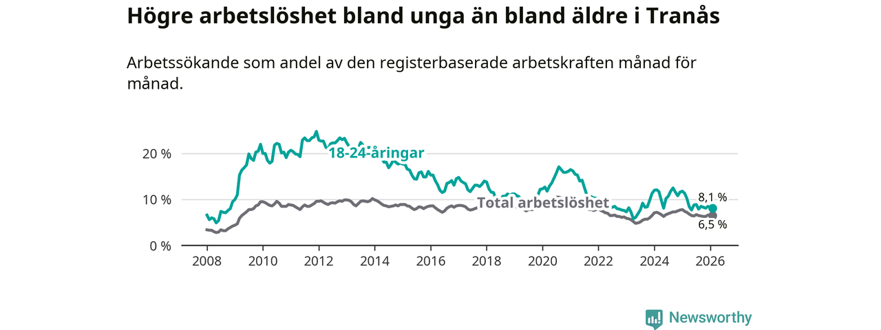 I och med den senaste månadens nedgång har de ungas arbetslöshet i Tranås sjunkit 14 månader i följd (ner från 11,6 procent i december 2024 till 8,1 procent nu).
