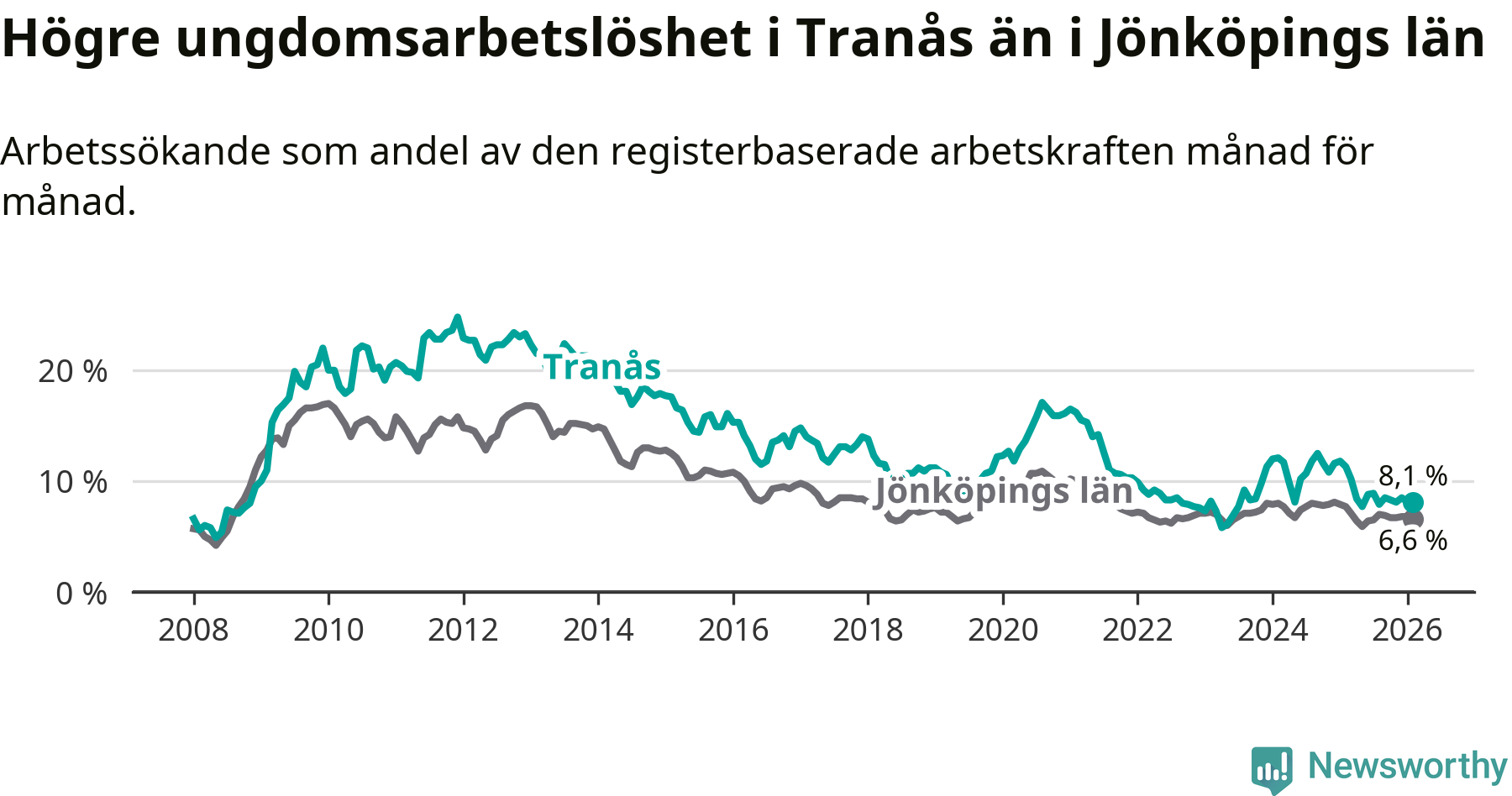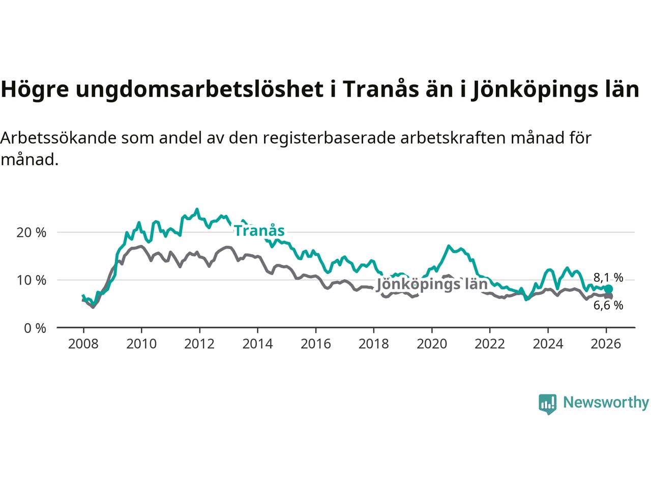 Precis som den totala arbetslösheten ligger ungdomsarbetslösheten i Tranås högre än i Jönköpings län som helhet. Skillnaden mellan kommunen och länet är 1,5 procentenheter.