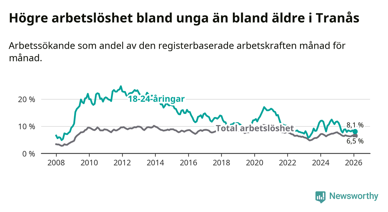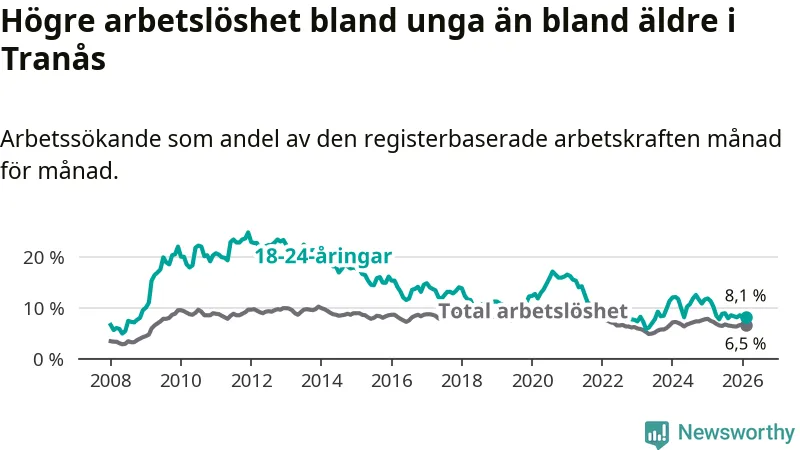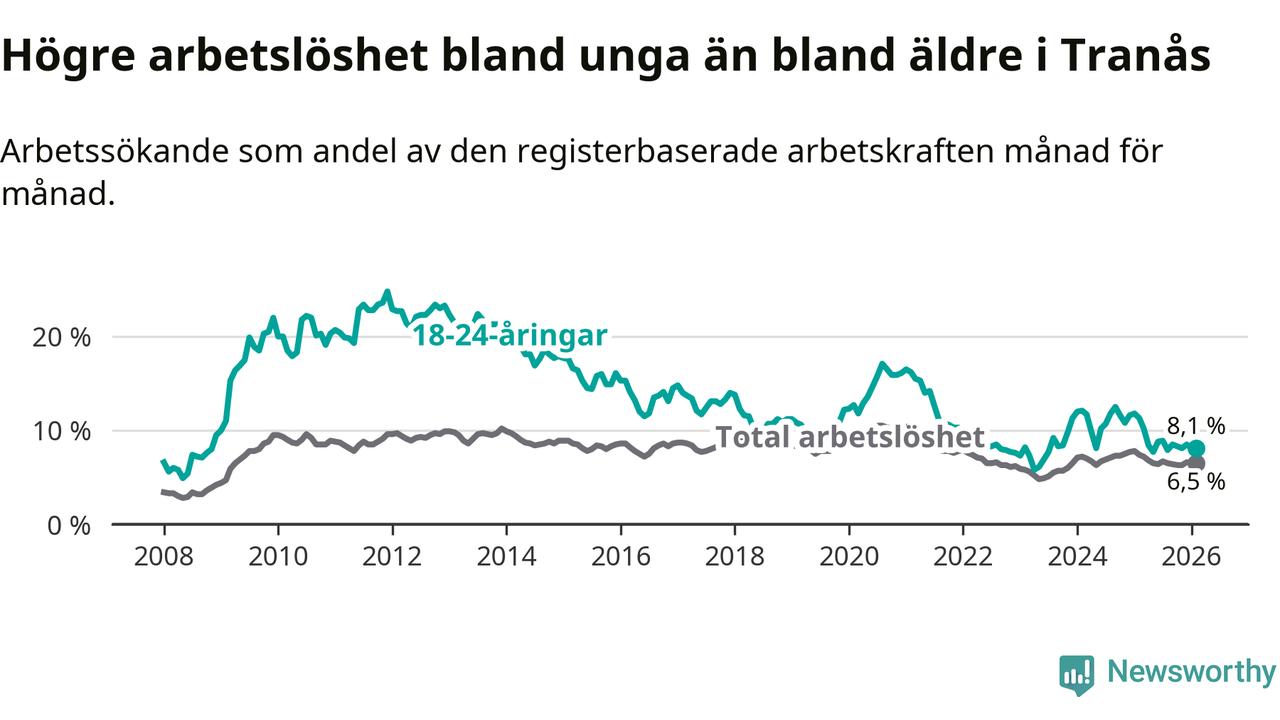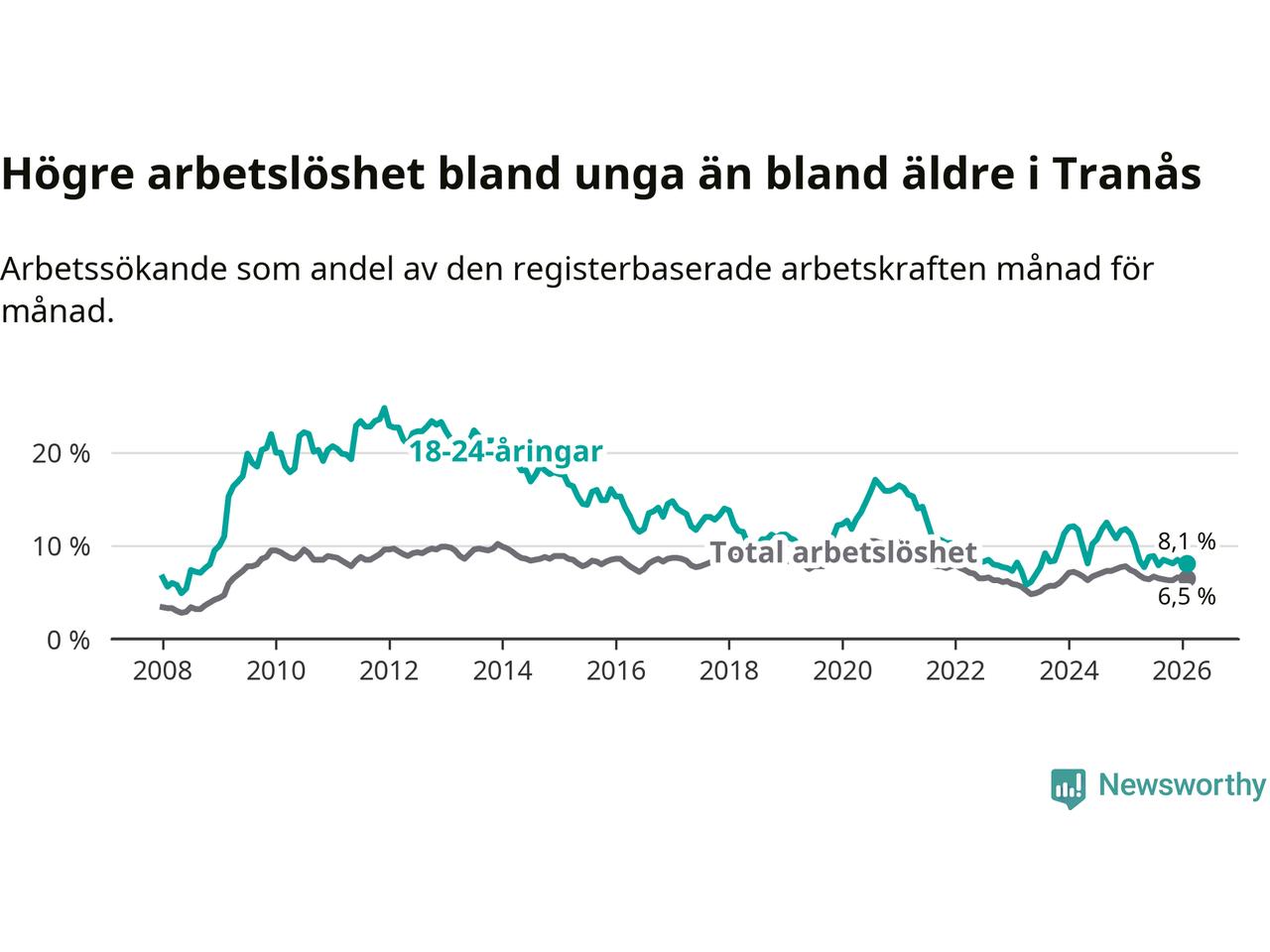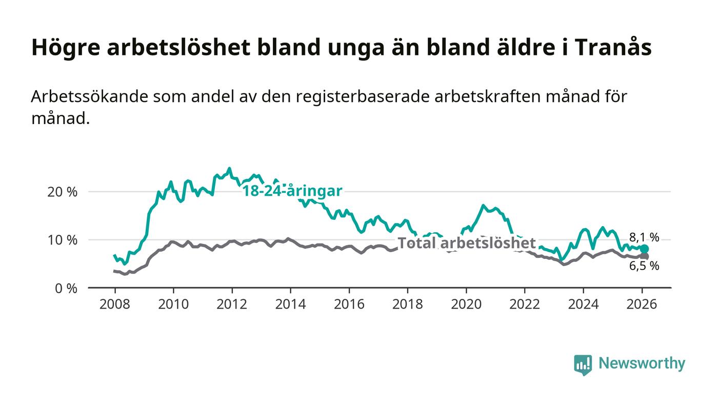 Den senaste månadsstatistiken från Arbetsförmedlingen visar på en nedgång i ungdomsarbetslöshet i Tranås kommun med 3,2 procentenheter. Arbetslösheten bland personer i åldern 18–24 år låg i februari på 8,1 procent.