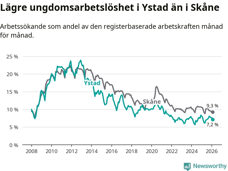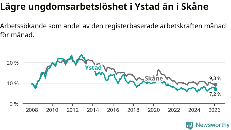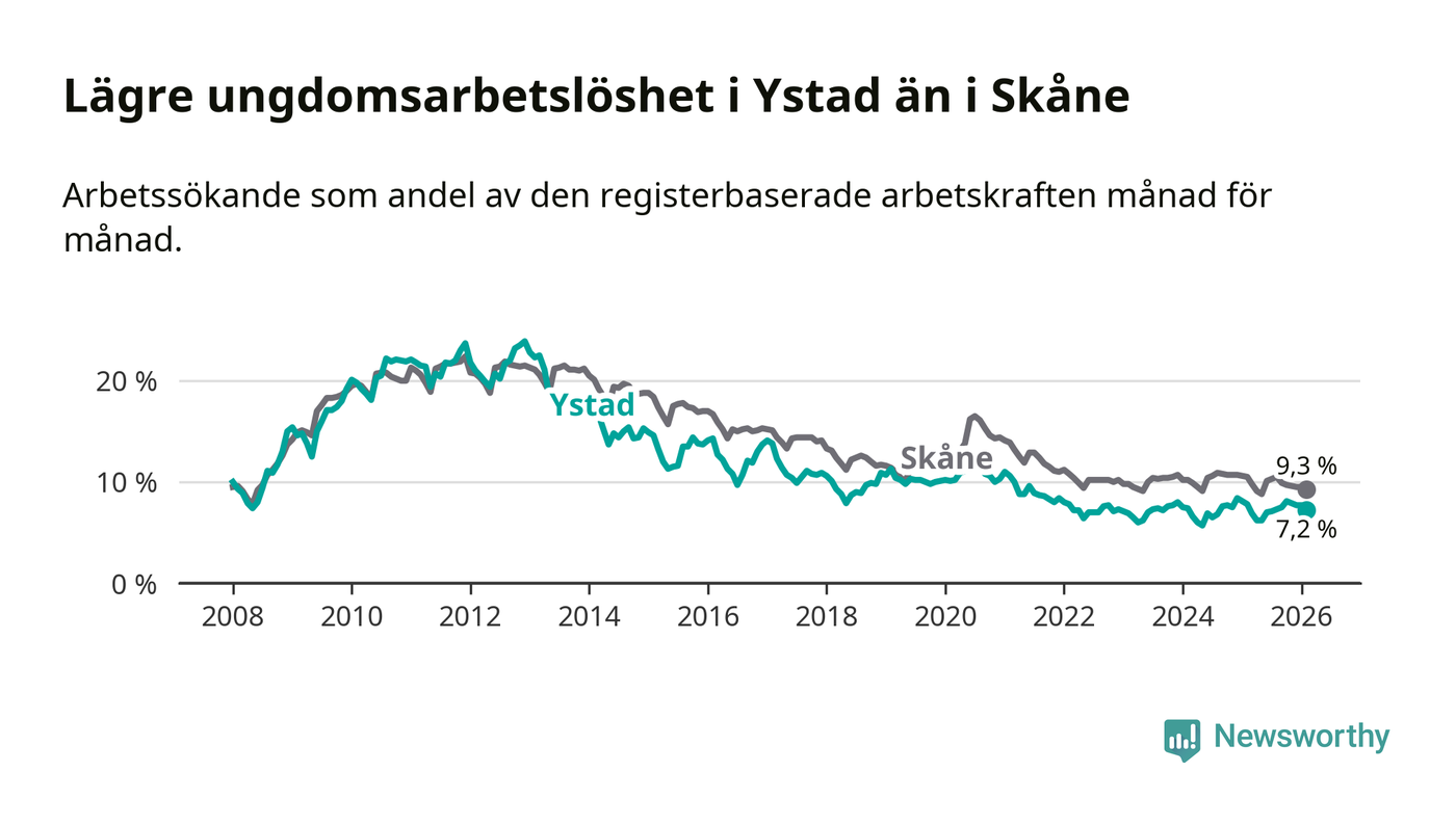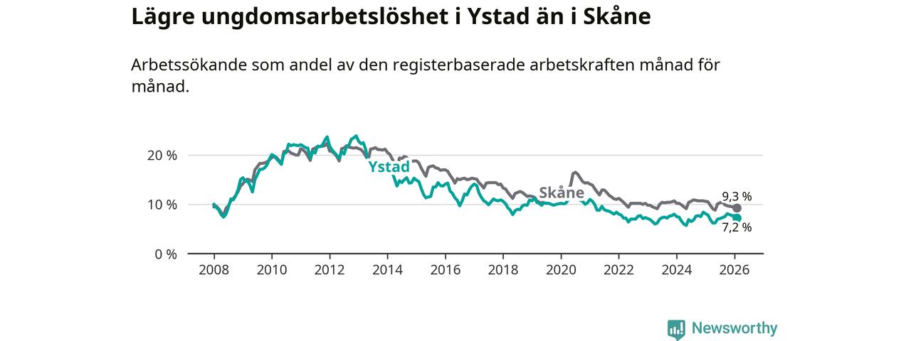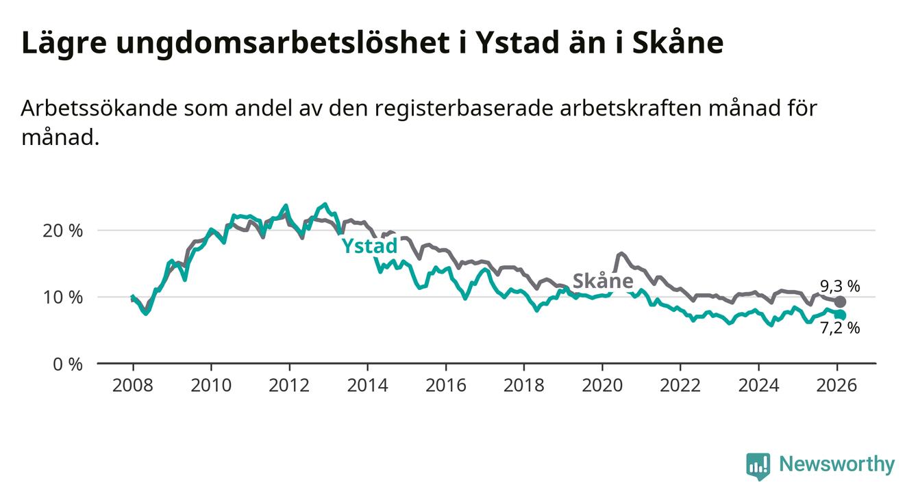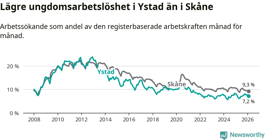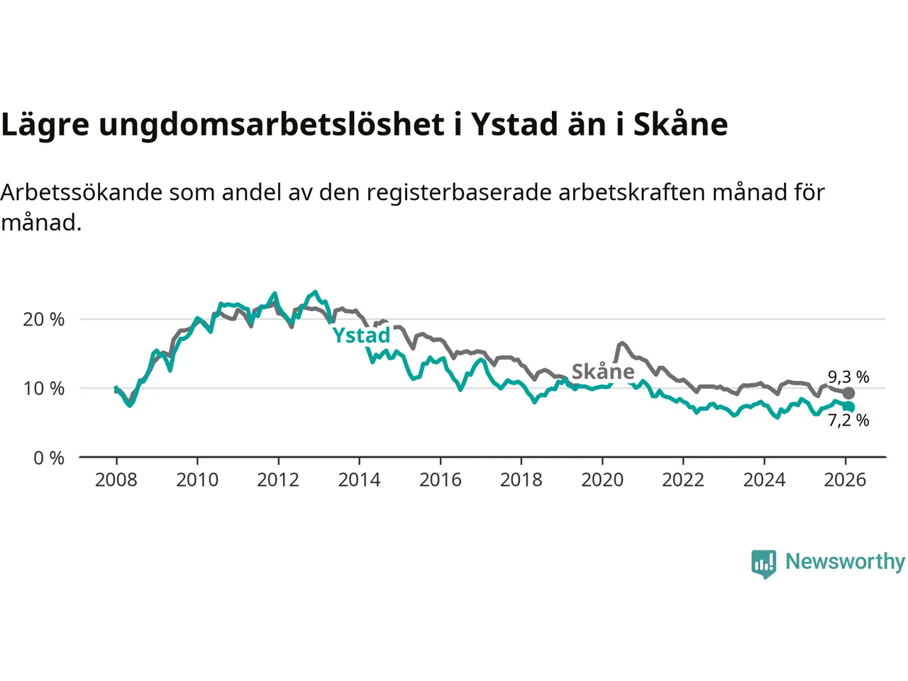 Precis som den totala arbetslösheten ligger ungdomsarbetslösheten i Ystad lägre än i Skåne som helhet. Skillnaden mellan kommunen och länet är 2,1 procentenheter.