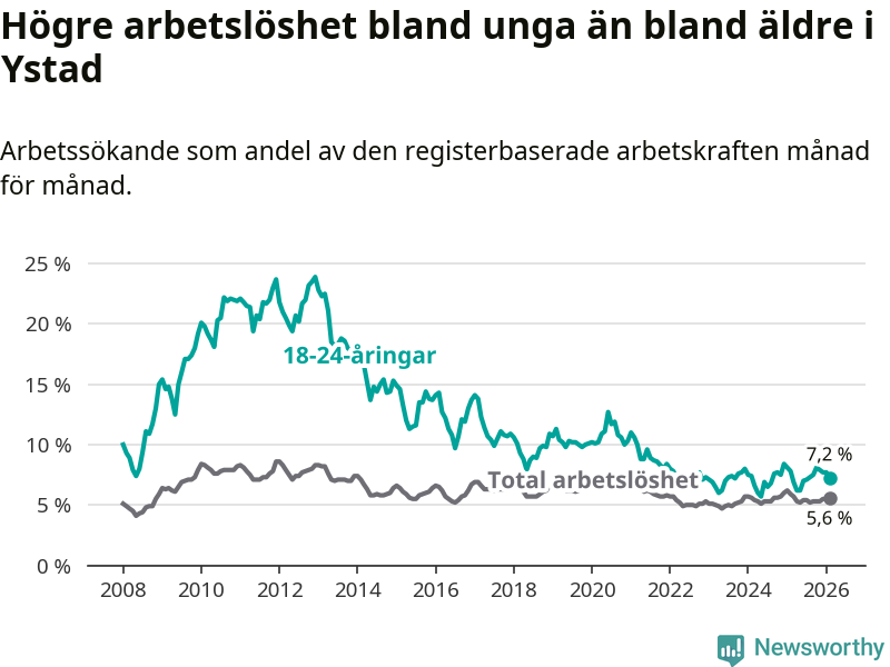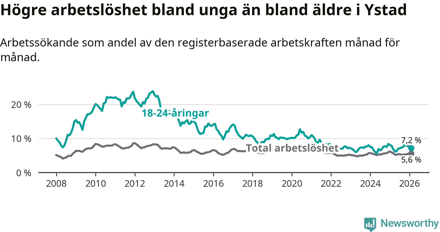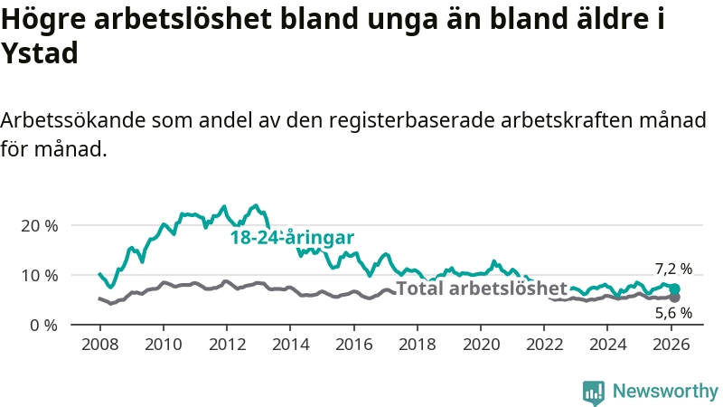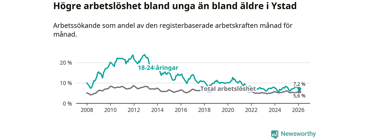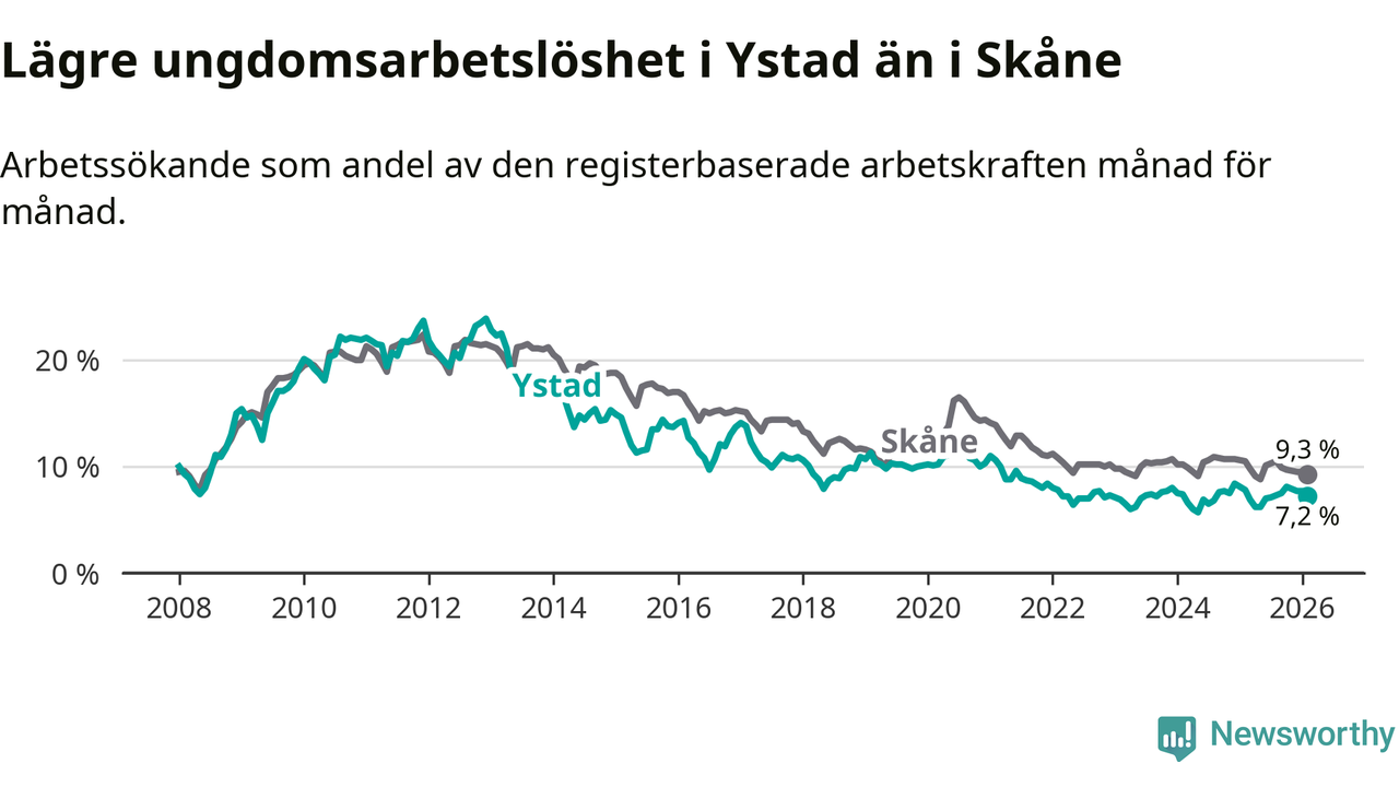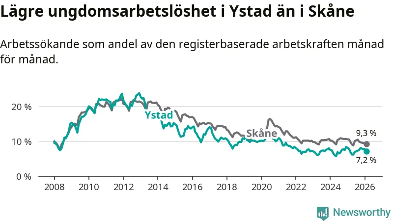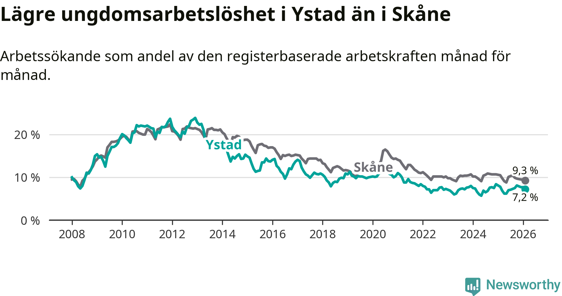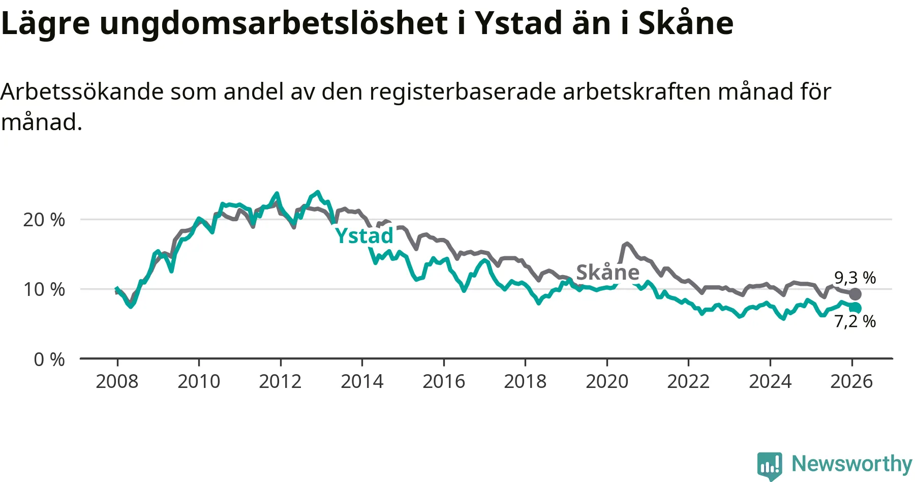 Precis som den totala arbetslösheten ligger ungdomsarbetslösheten i Ystad lägre än i Skåne som helhet. Skillnaden mellan kommunen och länet är 2,1 procentenheter.