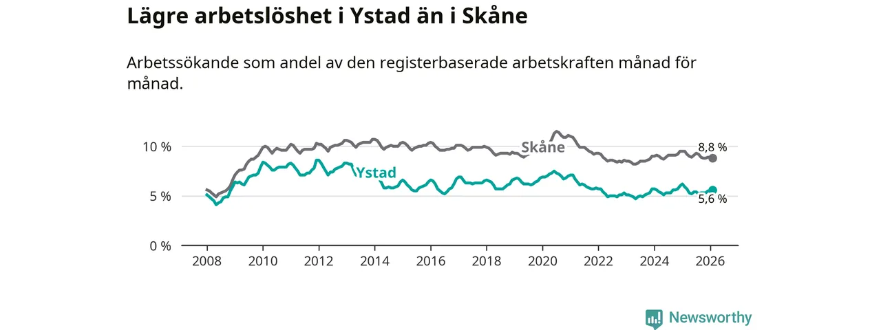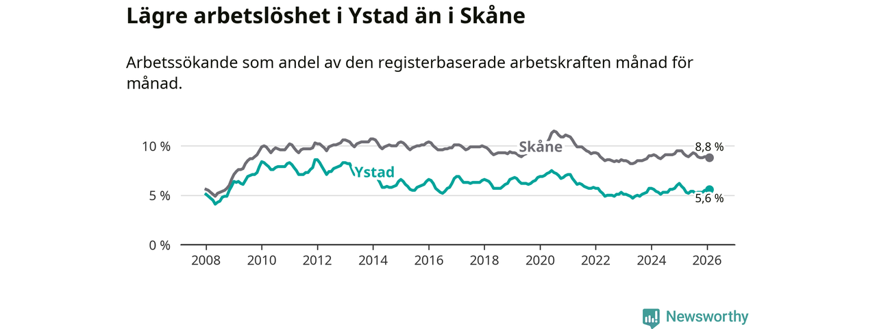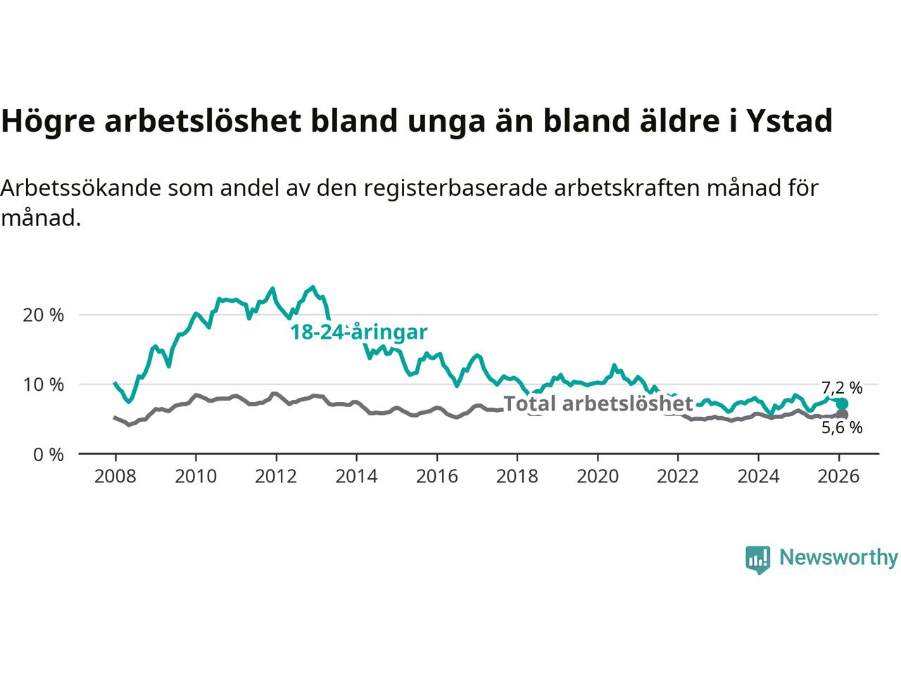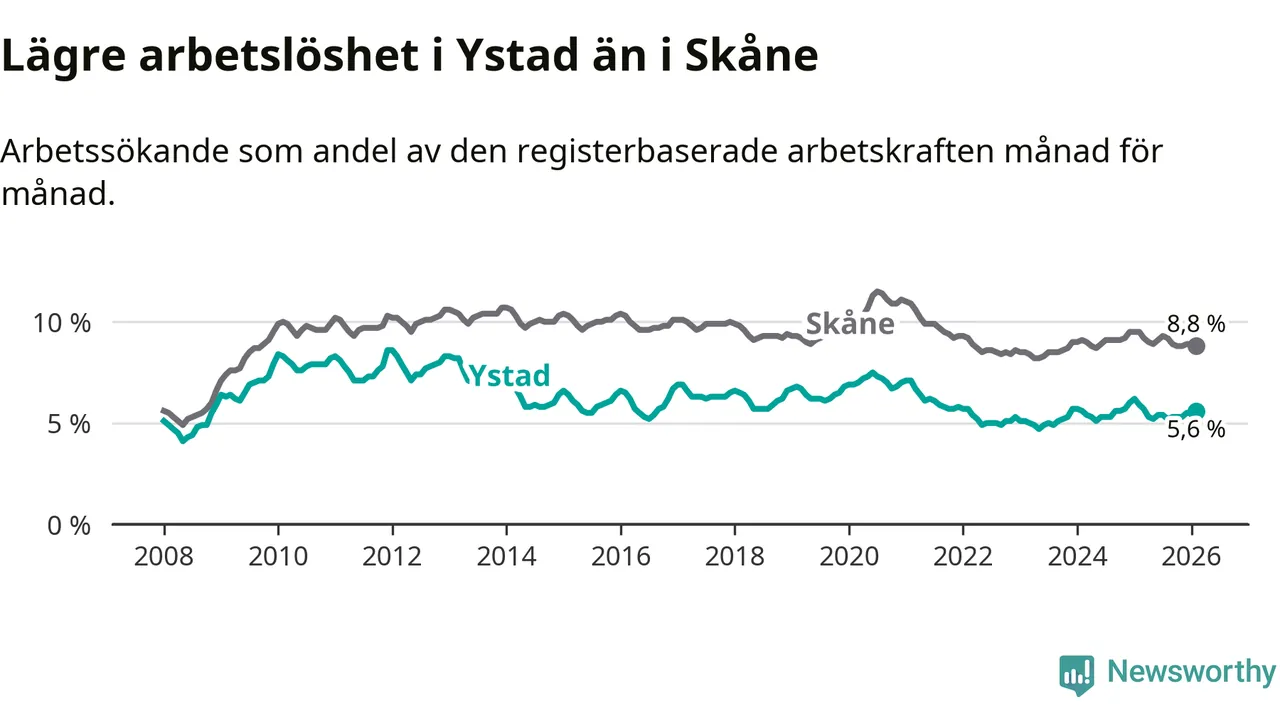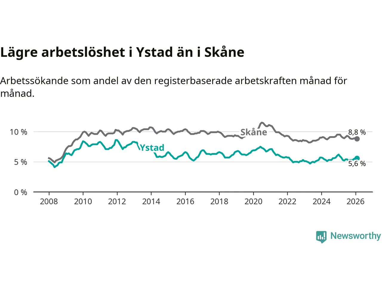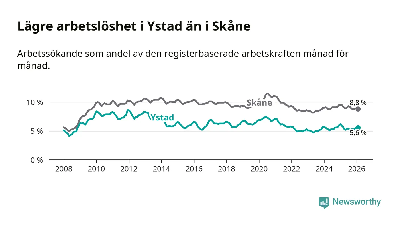 Under februari månad rapporterade Ystads kommun en total arbetslöshet på 5,6 procent. Det är en minskning jämfört med samma tidpunkt i fjol (−0,3 procentenheter). Även i Skåne län sjunker arbetslösheten .