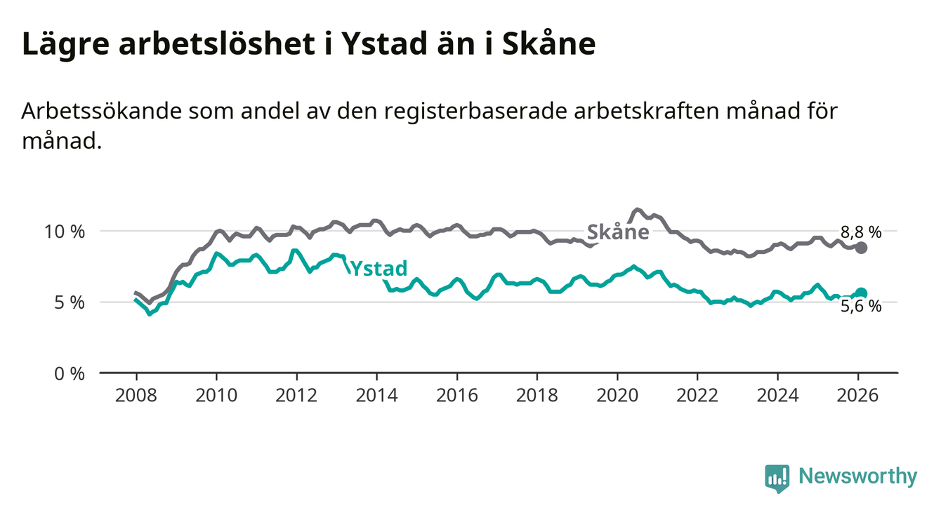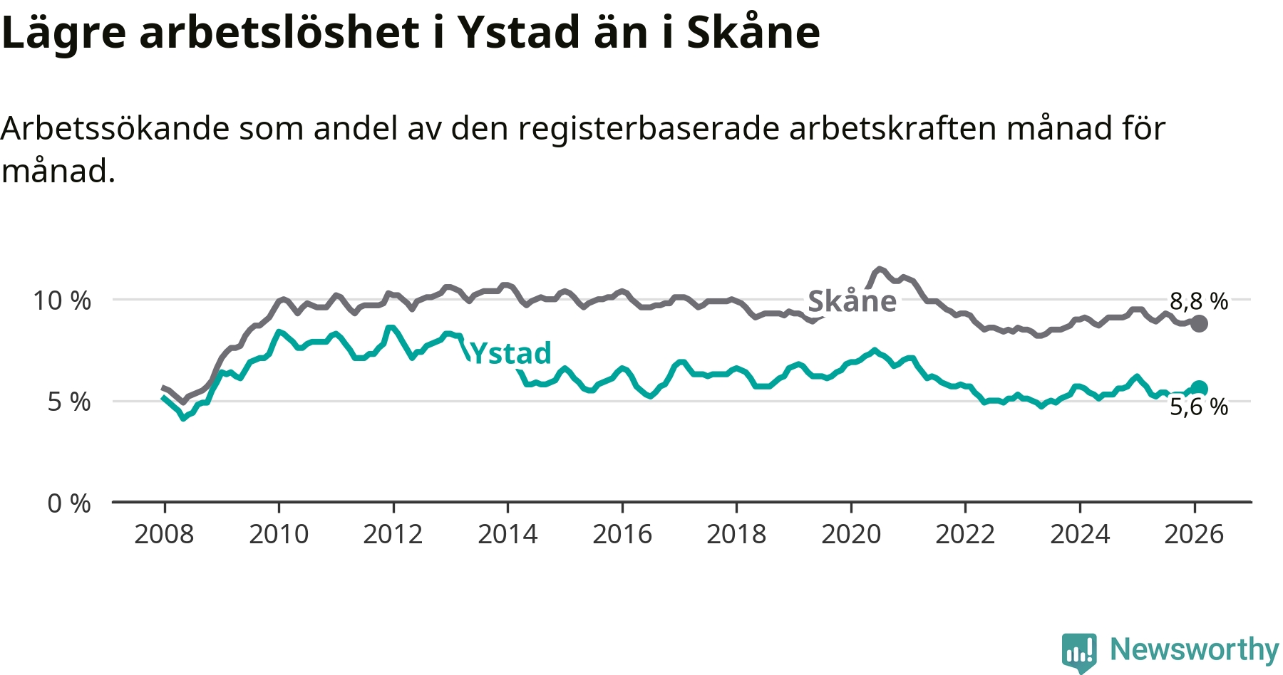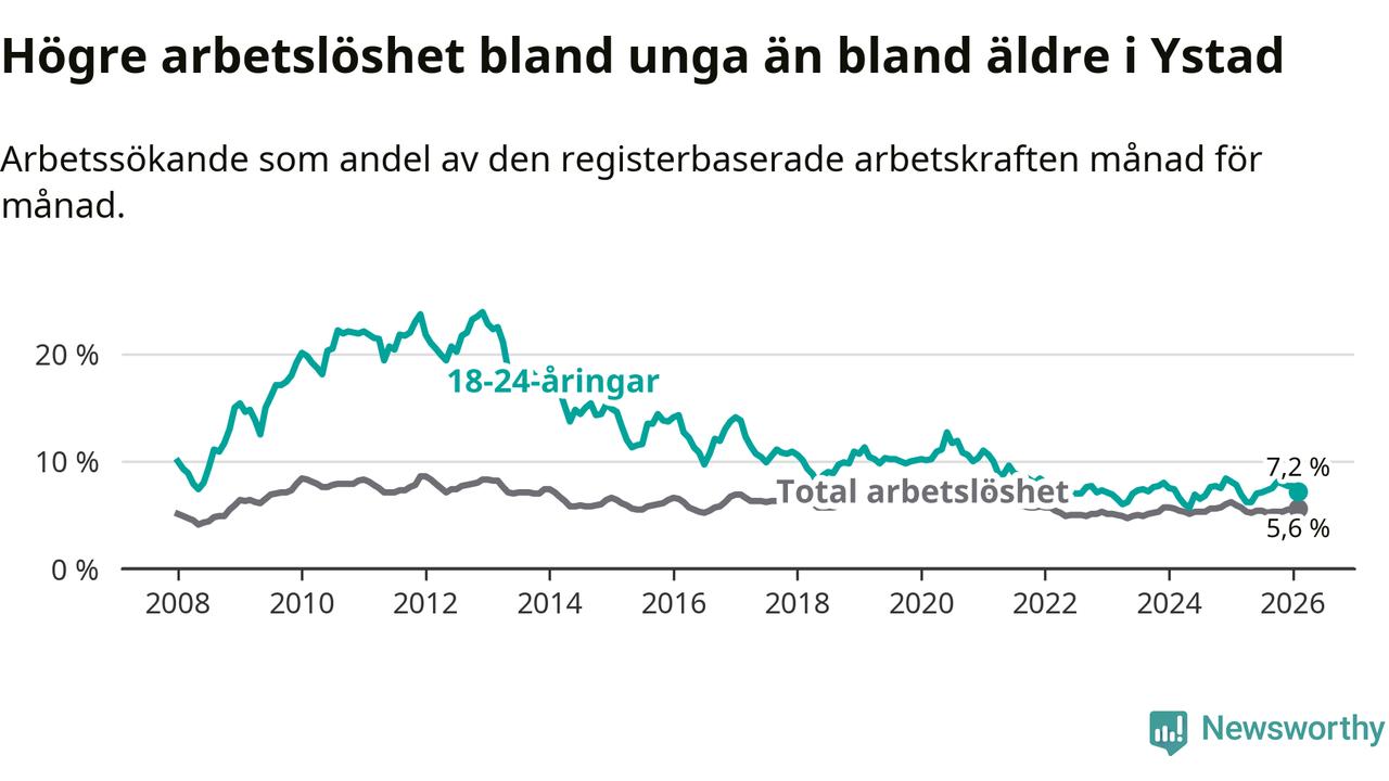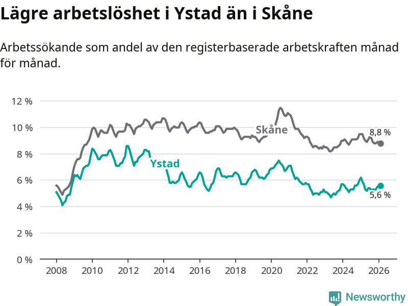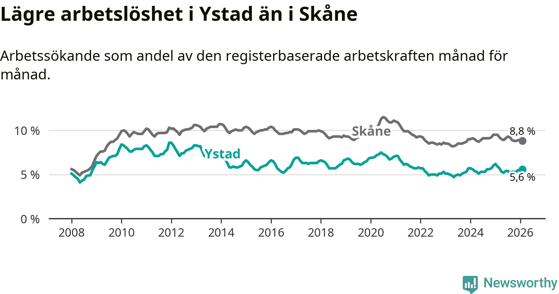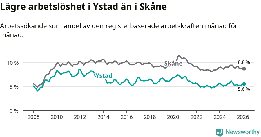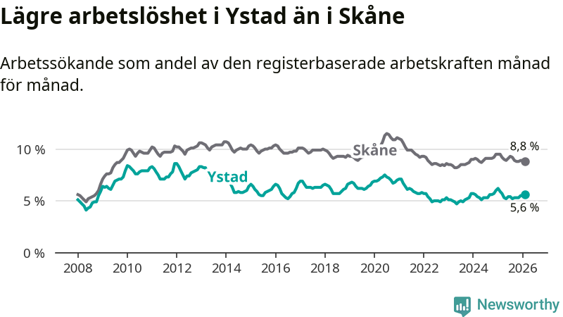 Under februari månad rapporterade Ystads kommun en total arbetslöshet på 5,6 procent. Det är en minskning jämfört med samma tidpunkt i fjol (−0,3 procentenheter). Även i Skåne län sjunker arbetslösheten .