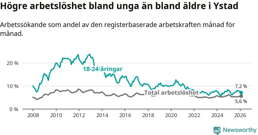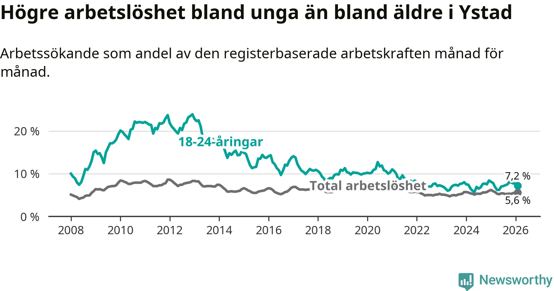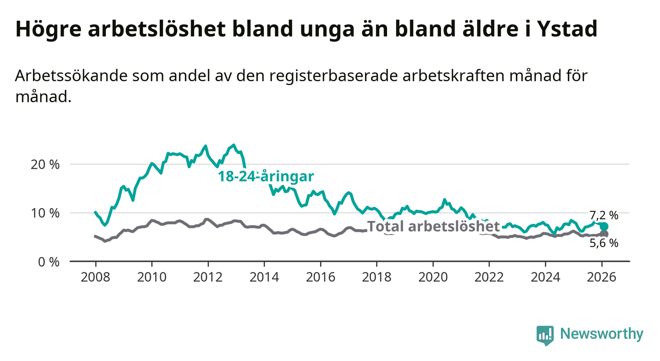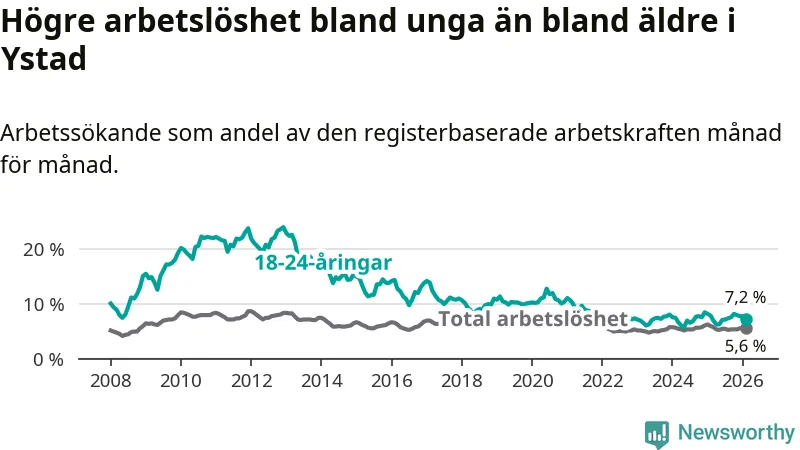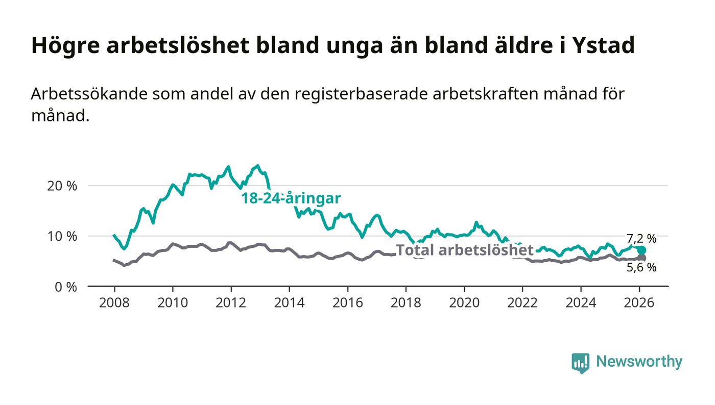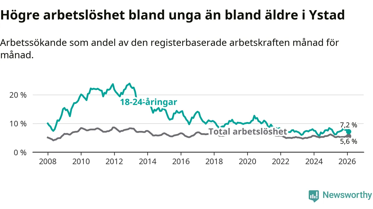 Under februari månad rapporterade Ystads kommun en total arbetslöshet på 5,6 procent. Det är en minskning jämfört med samma tidpunkt i fjol (−0,3 procentenheter). Även i Skåne län sjunker arbetslösheten .