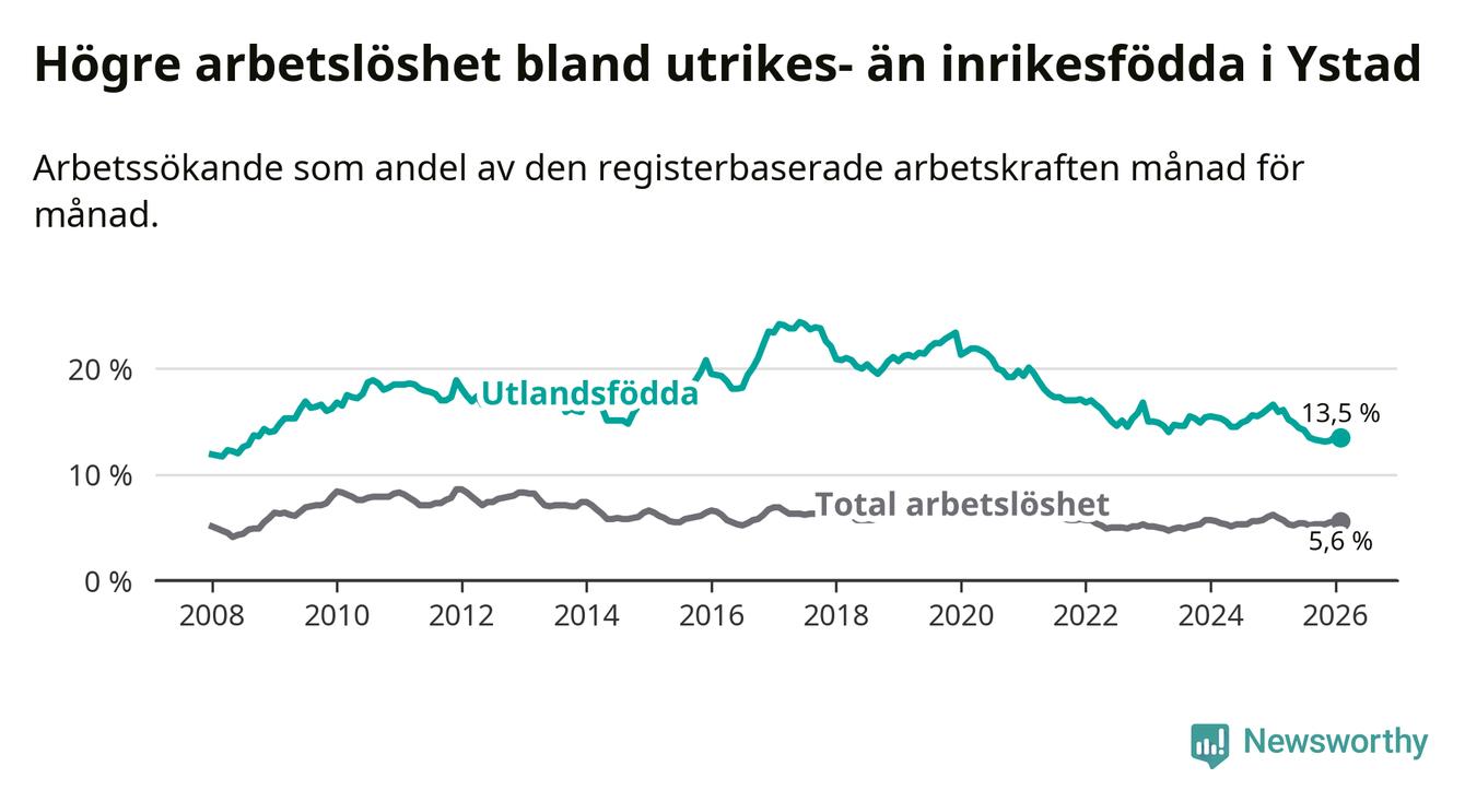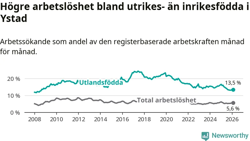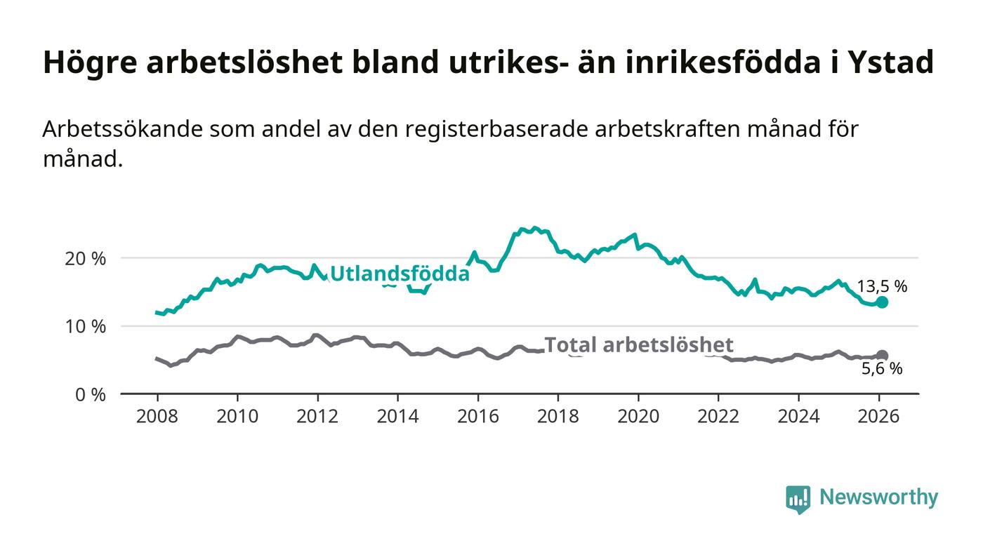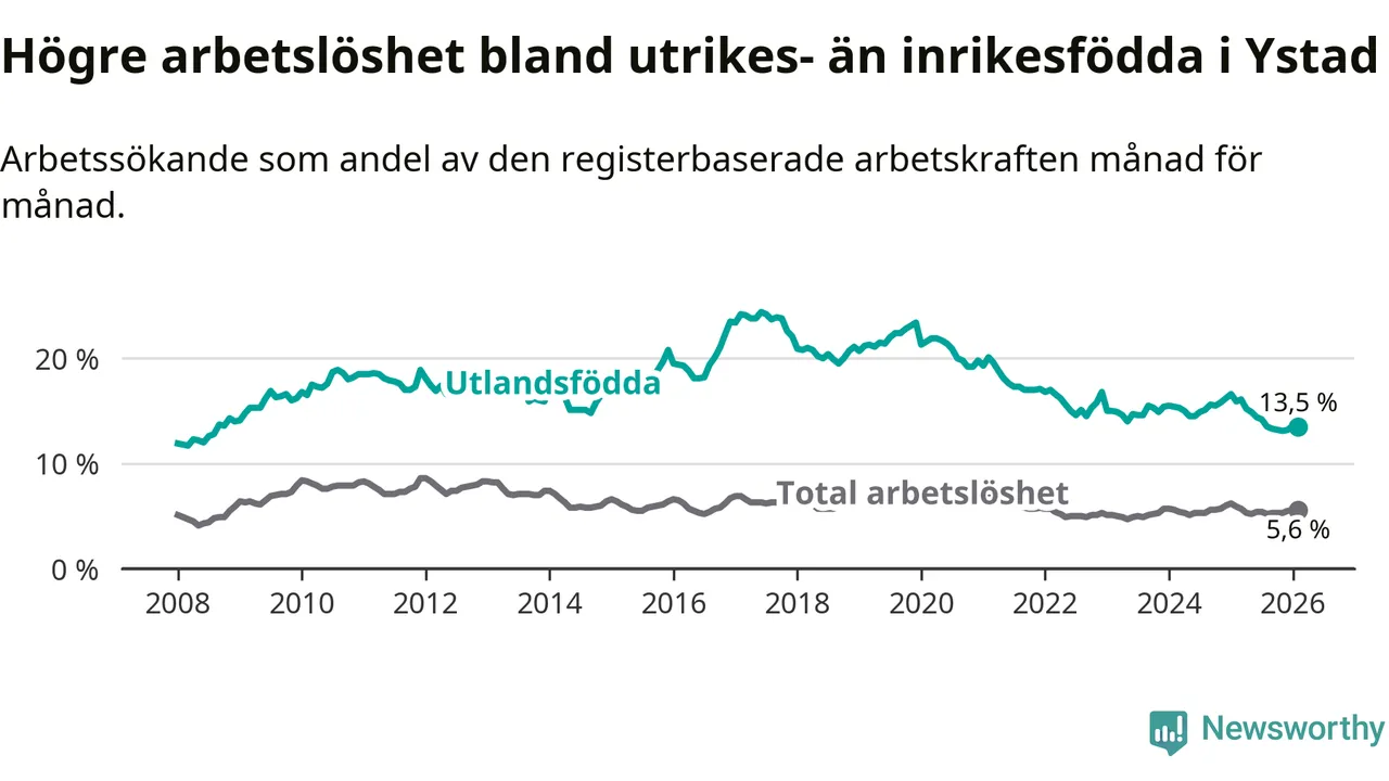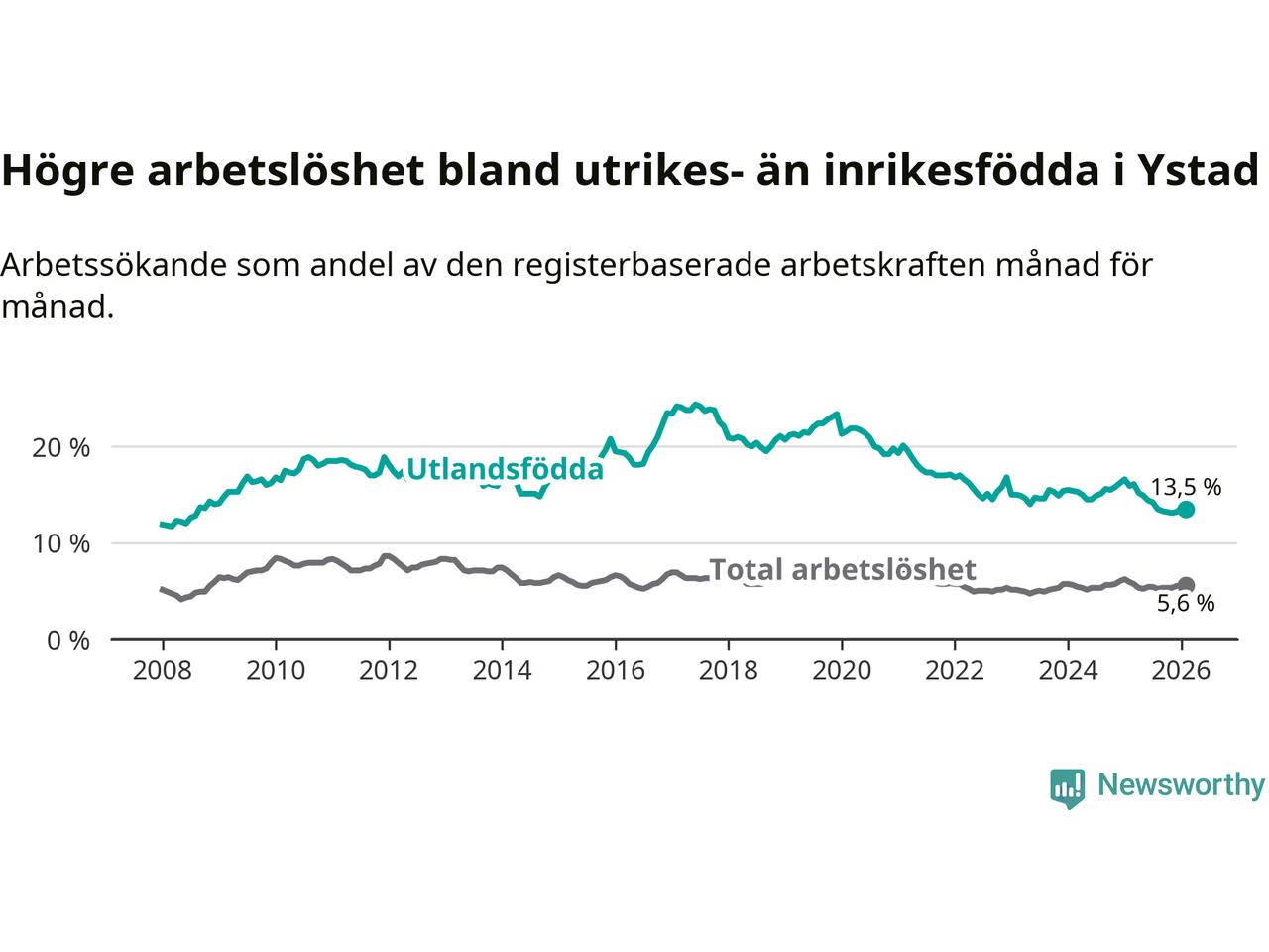 Arbetslösheten bland utlandsfödda var 13,5 procent i Ystad under februari månad, motsvarande 276 av 2 044 personer. Det är 2,4 procentenheter färre än vid samma tidpunkt i fjol (−44 om man räknar personer). Därmed är de utlandsföddas arbetslöshet lägre än vid samma tidpunkt i fjol för nionde månaden i följd. Sedan maj 2025 har arbetslösheten bland utlandsfödda minskat från 14,9 till 13,5 procent.