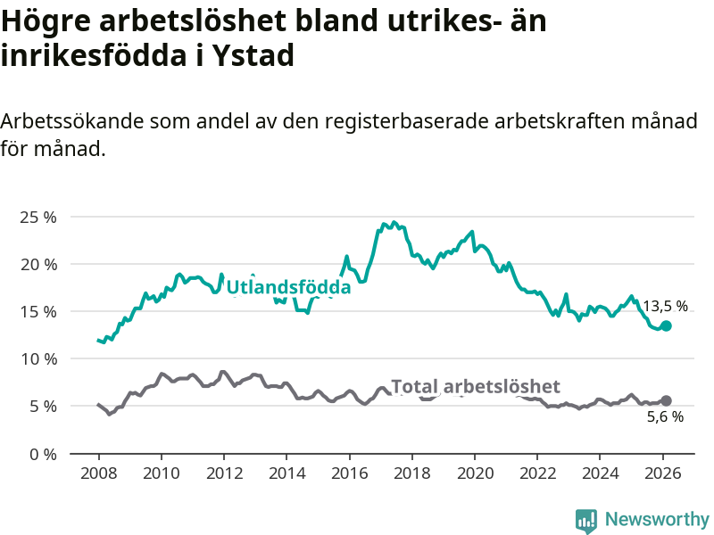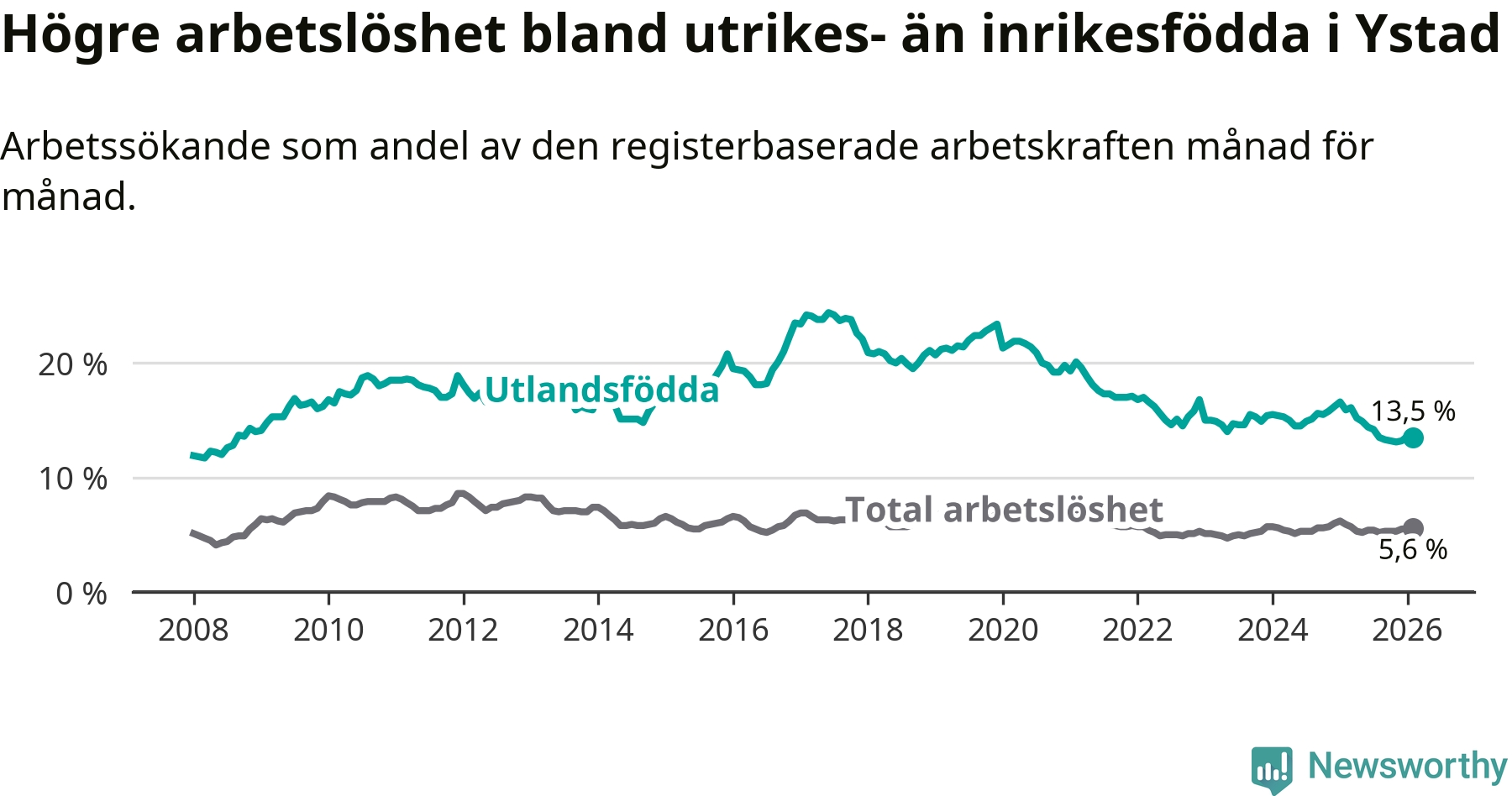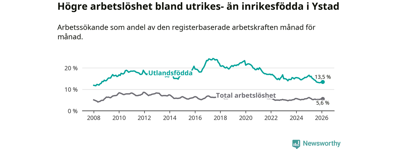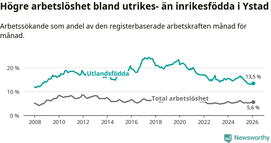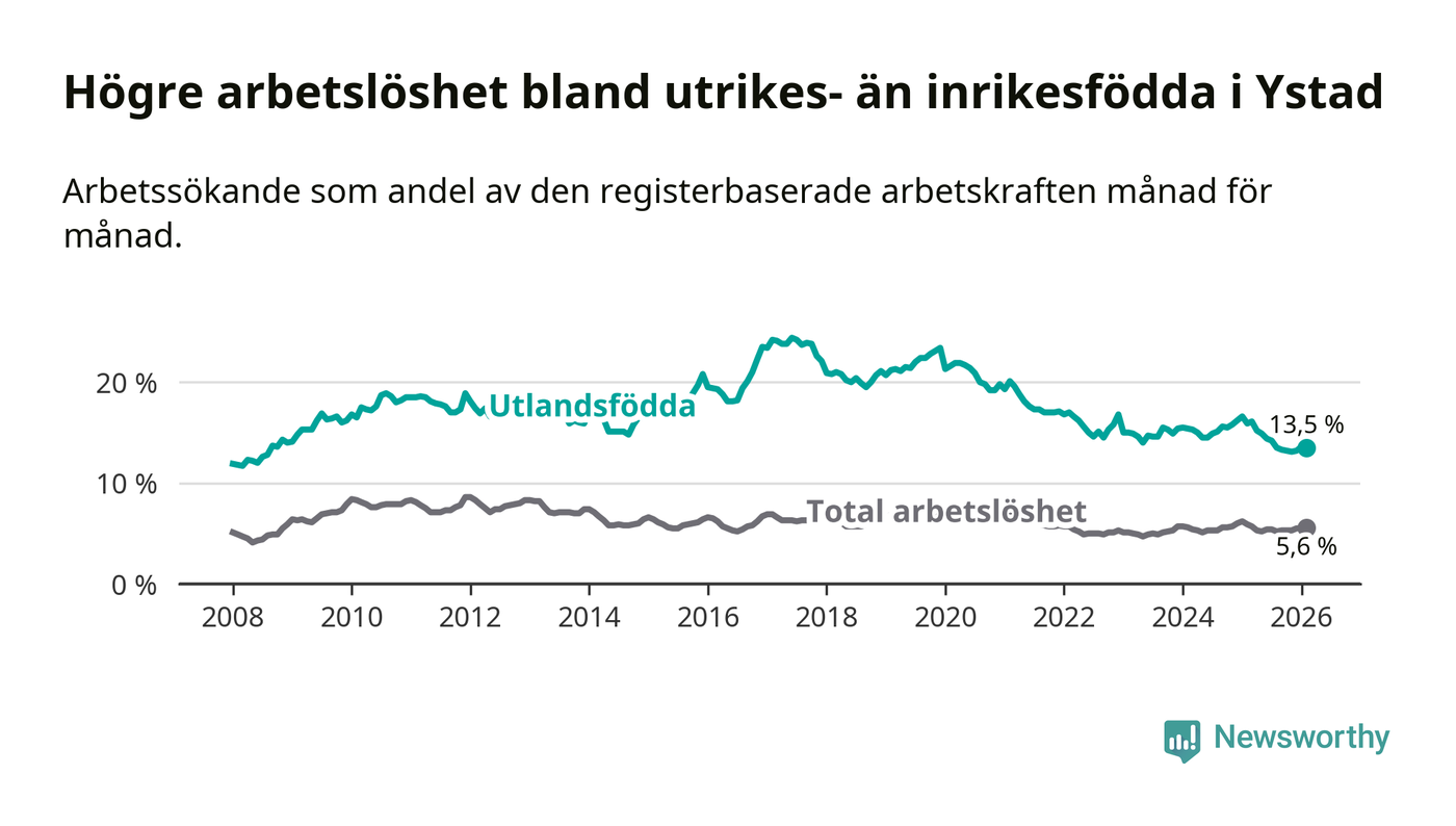 Arbetslösheten bland utlandsfödda var 13,5 procent i Ystad under februari månad, motsvarande 276 av 2 044 personer. Det är 2,4 procentenheter färre än vid samma tidpunkt i fjol (−44 om man räknar personer). Därmed är de utlandsföddas arbetslöshet lägre än vid samma tidpunkt i fjol för nionde månaden i följd. Sedan maj 2025 har arbetslösheten bland utlandsfödda minskat från 14,9 till 13,5 procent.