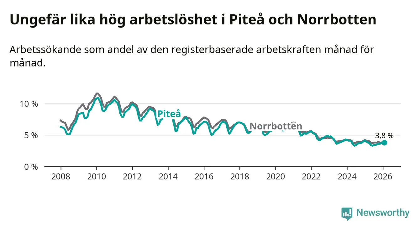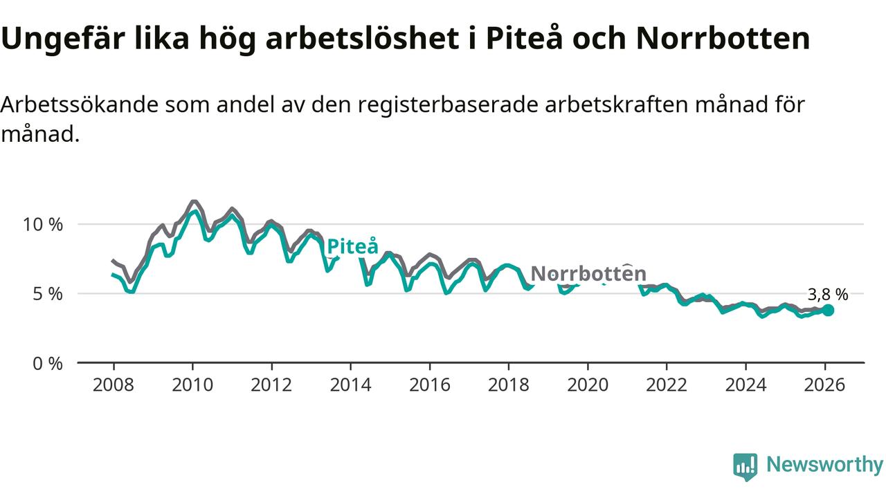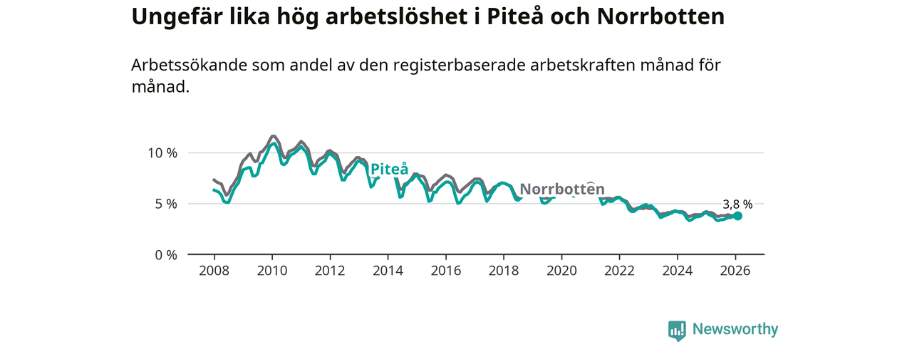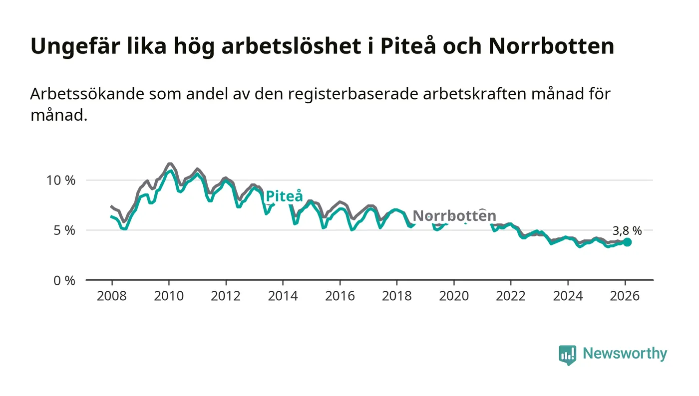 Under februari månad rapporterade Piteå kommun en total arbetslöshet på 3,8 procent. Det är en minskning jämfört med samma tidpunkt i fjol (−0,1 procentenheter). Även i Norrbottens län sjunker arbetslösheten .