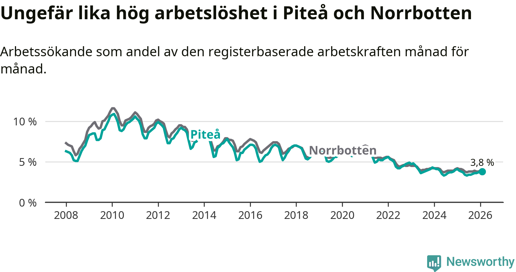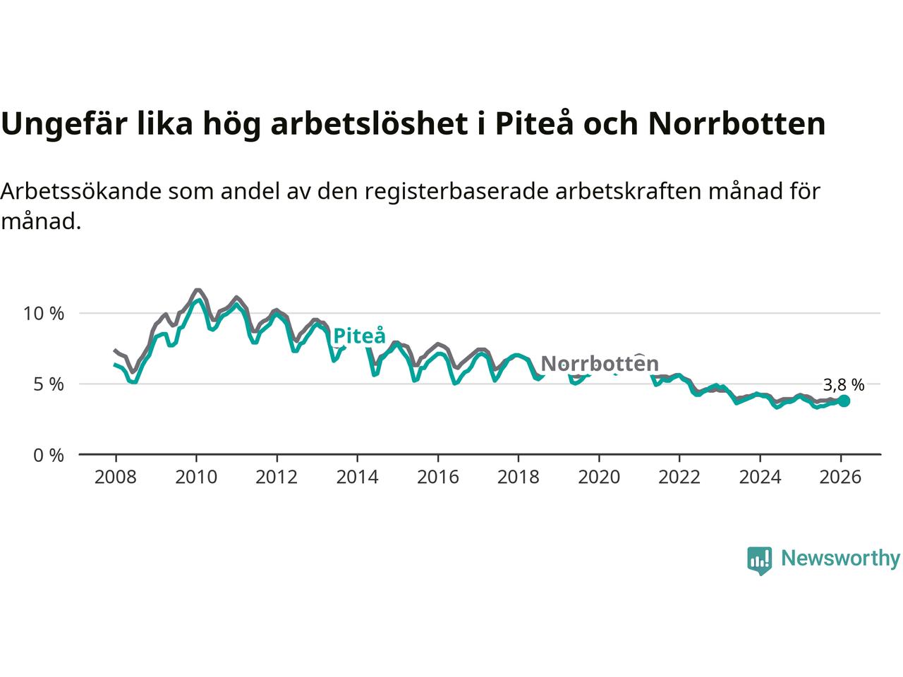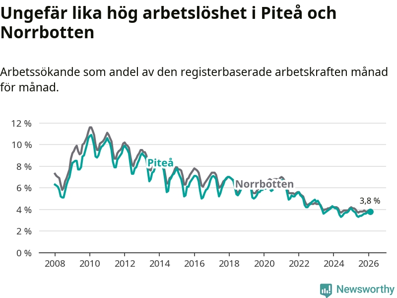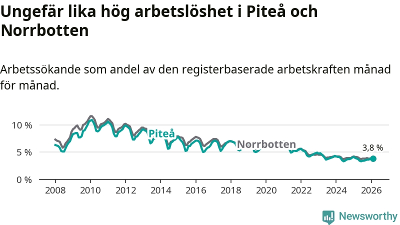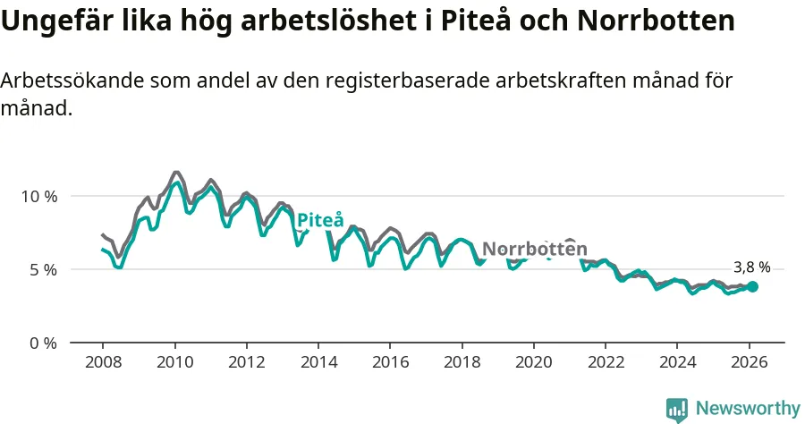 Under februari månad rapporterade Piteå kommun en total arbetslöshet på 3,8 procent. Det är en minskning jämfört med samma tidpunkt i fjol (−0,1 procentenheter). Även i Norrbottens län sjunker arbetslösheten .