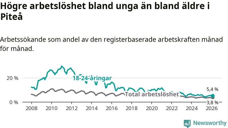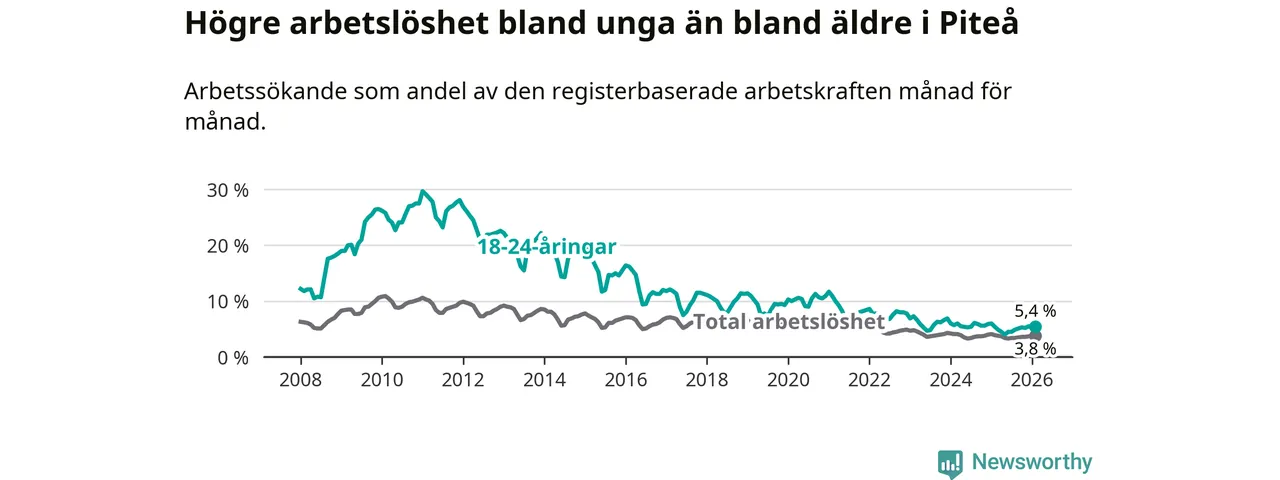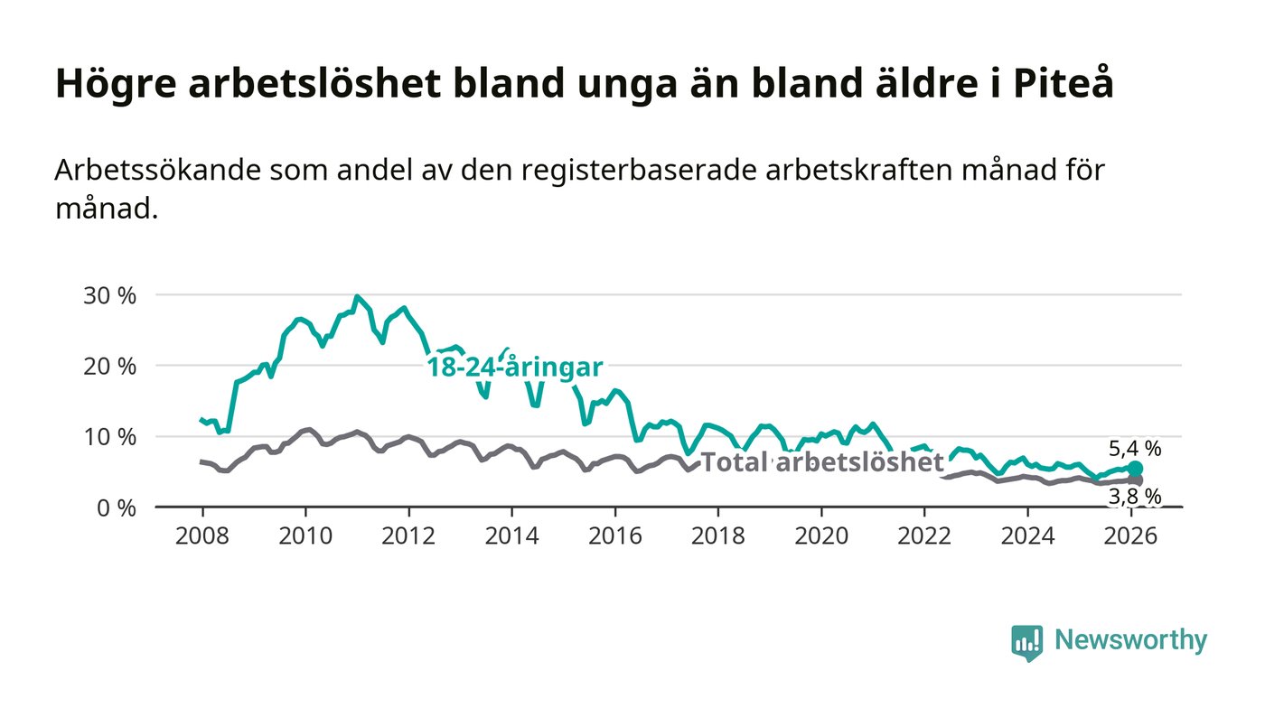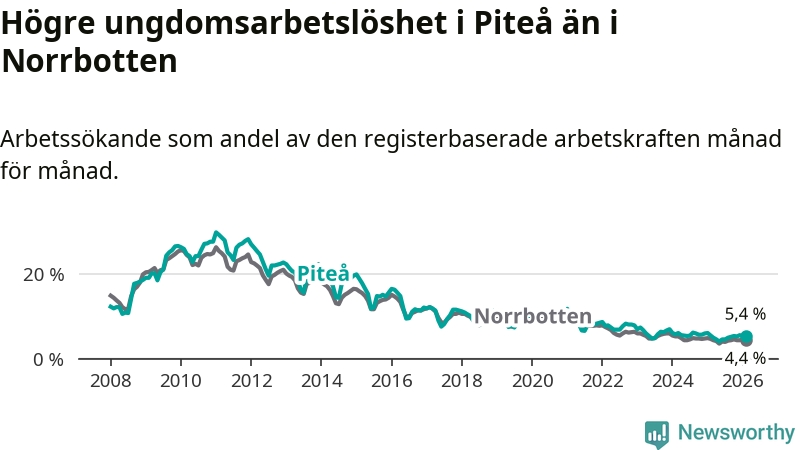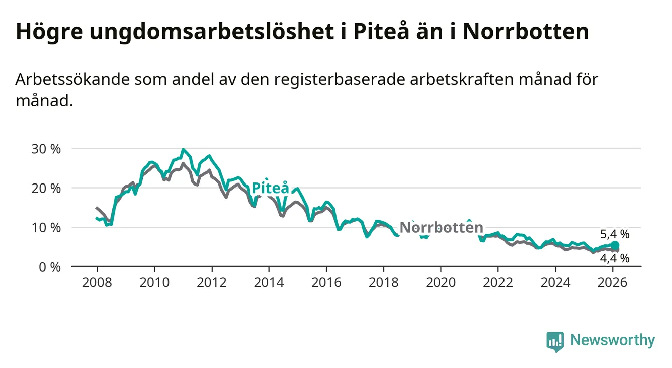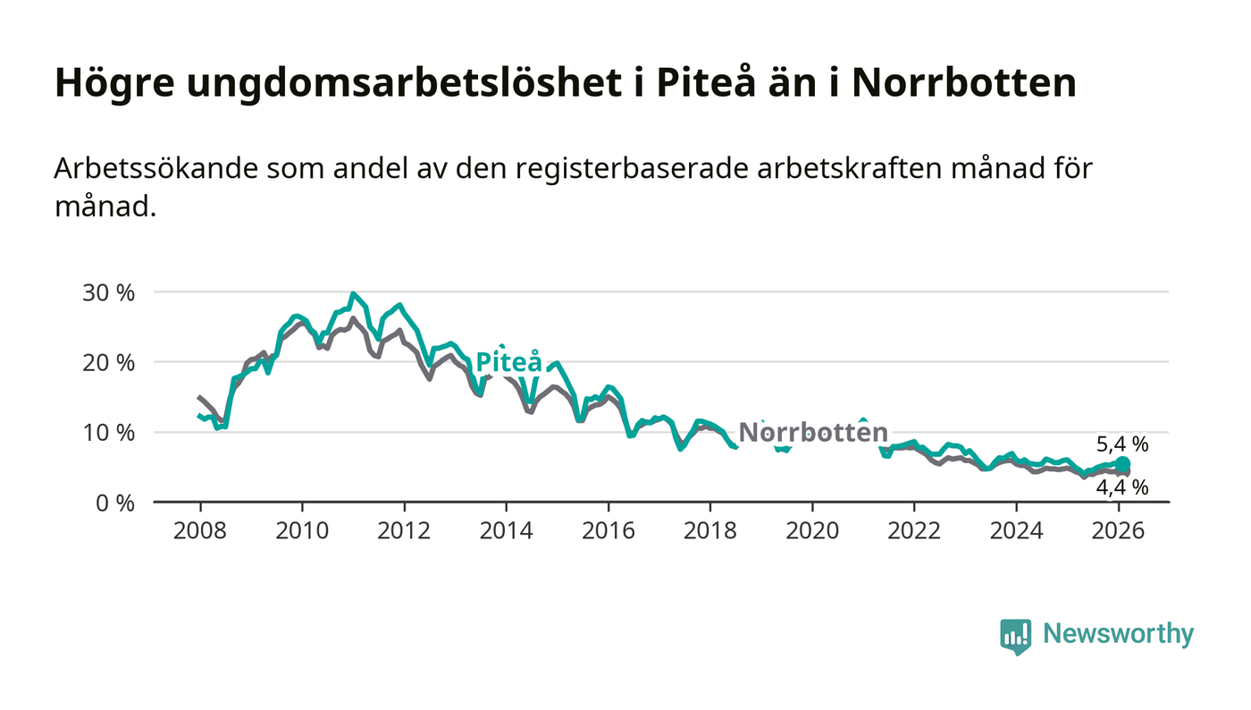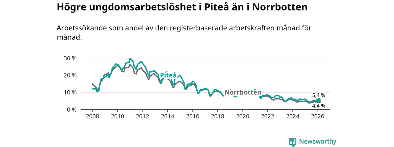 Medan Piteå har ungefär samma total arbetslöshet som Norrbotten, ligger ungdomsarbetslösheten 1,0 procentenheter högre i Piteå.