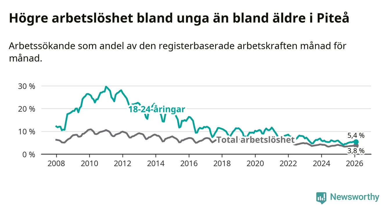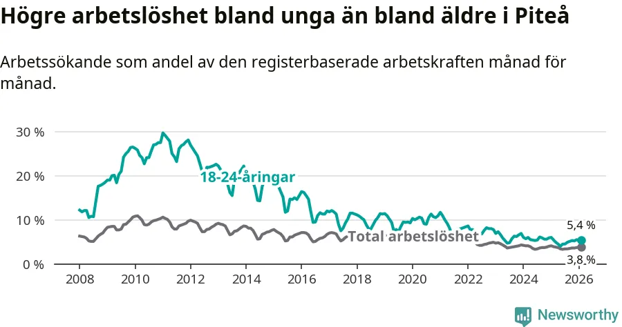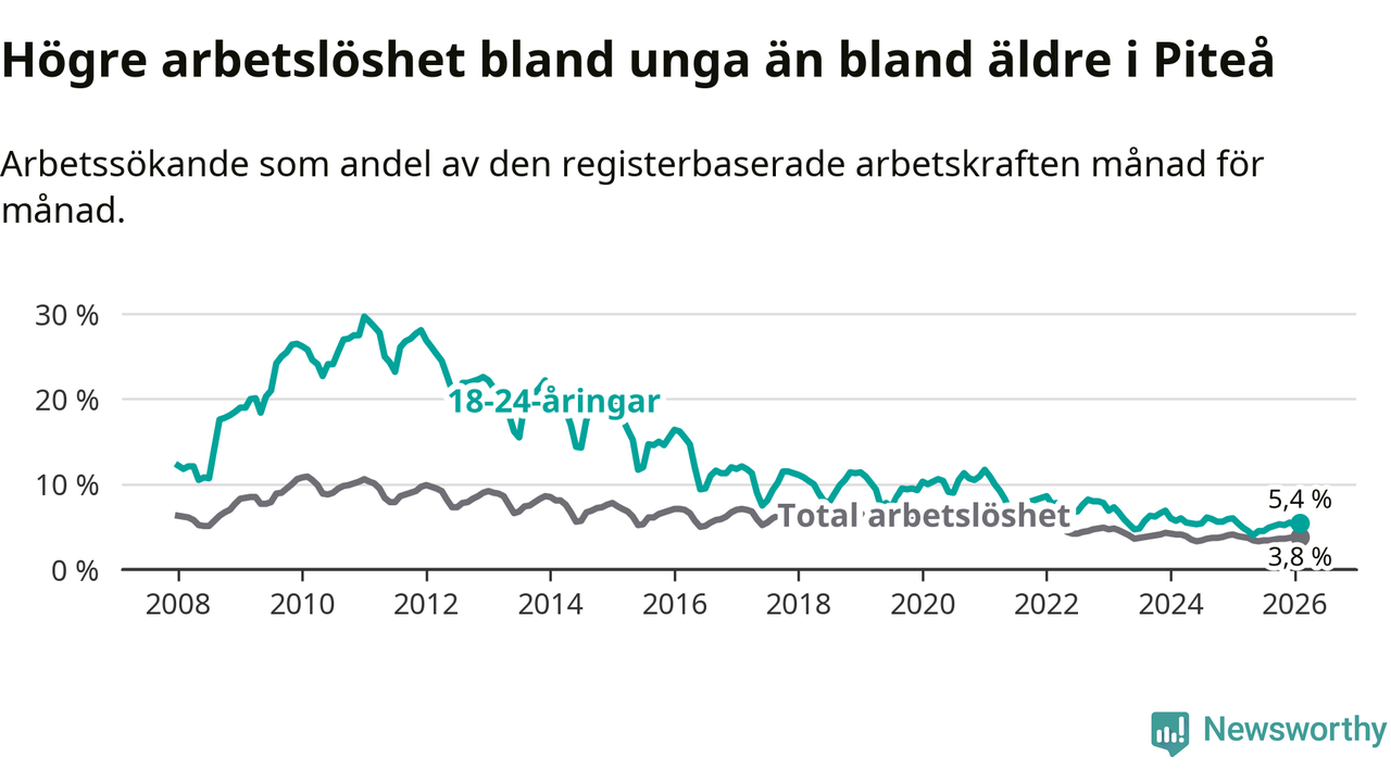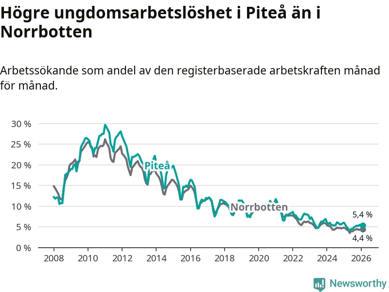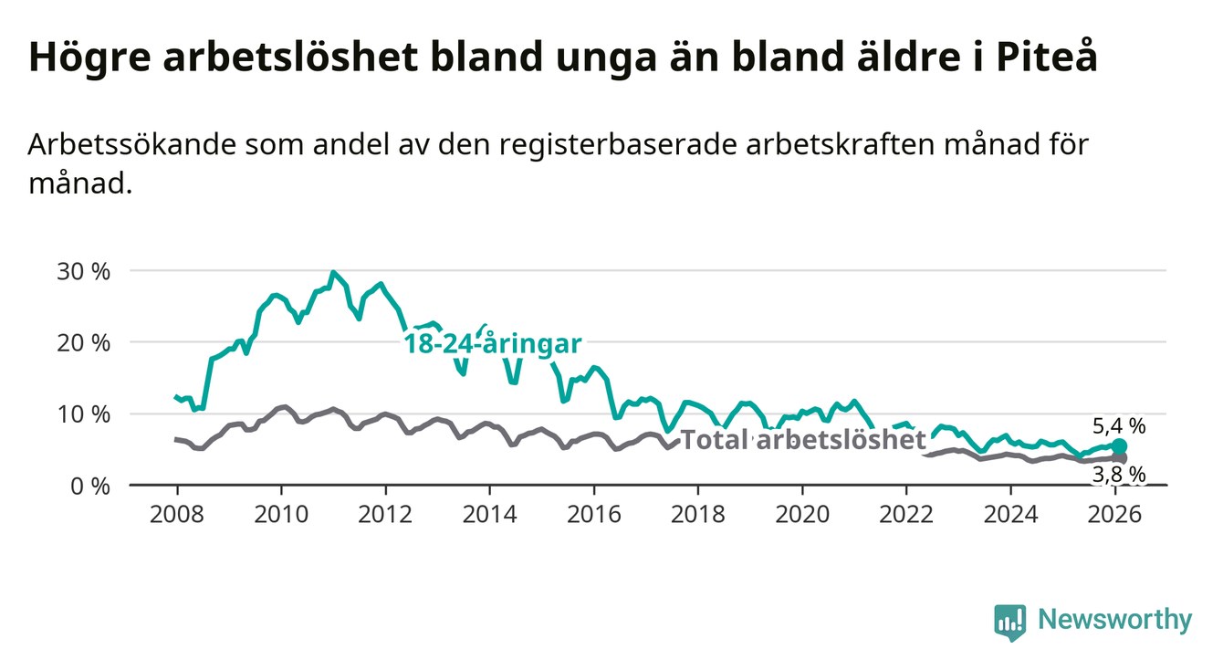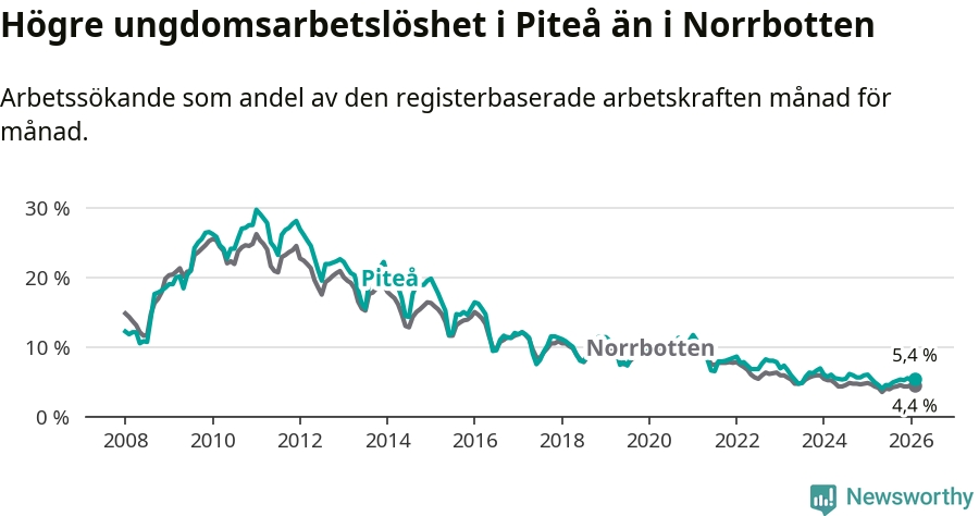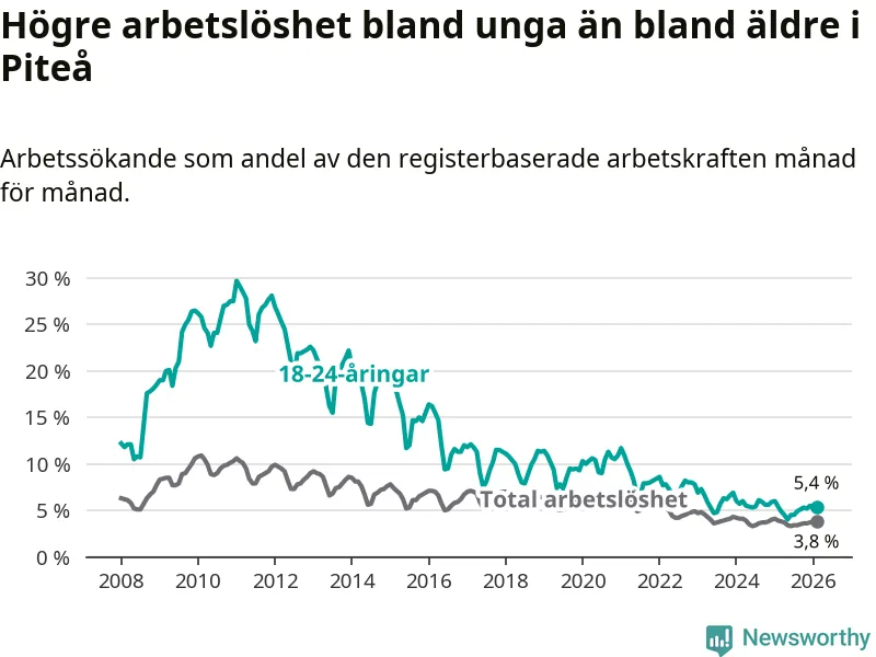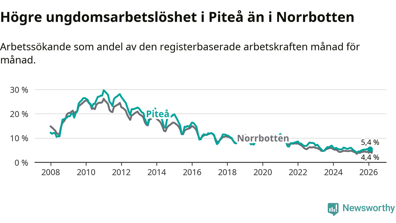 Medan Piteå har ungefär samma total arbetslöshet som Norrbotten, ligger ungdomsarbetslösheten 1,0 procentenheter högre i Piteå.