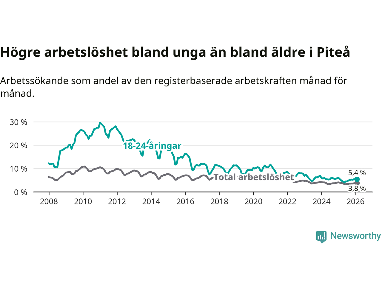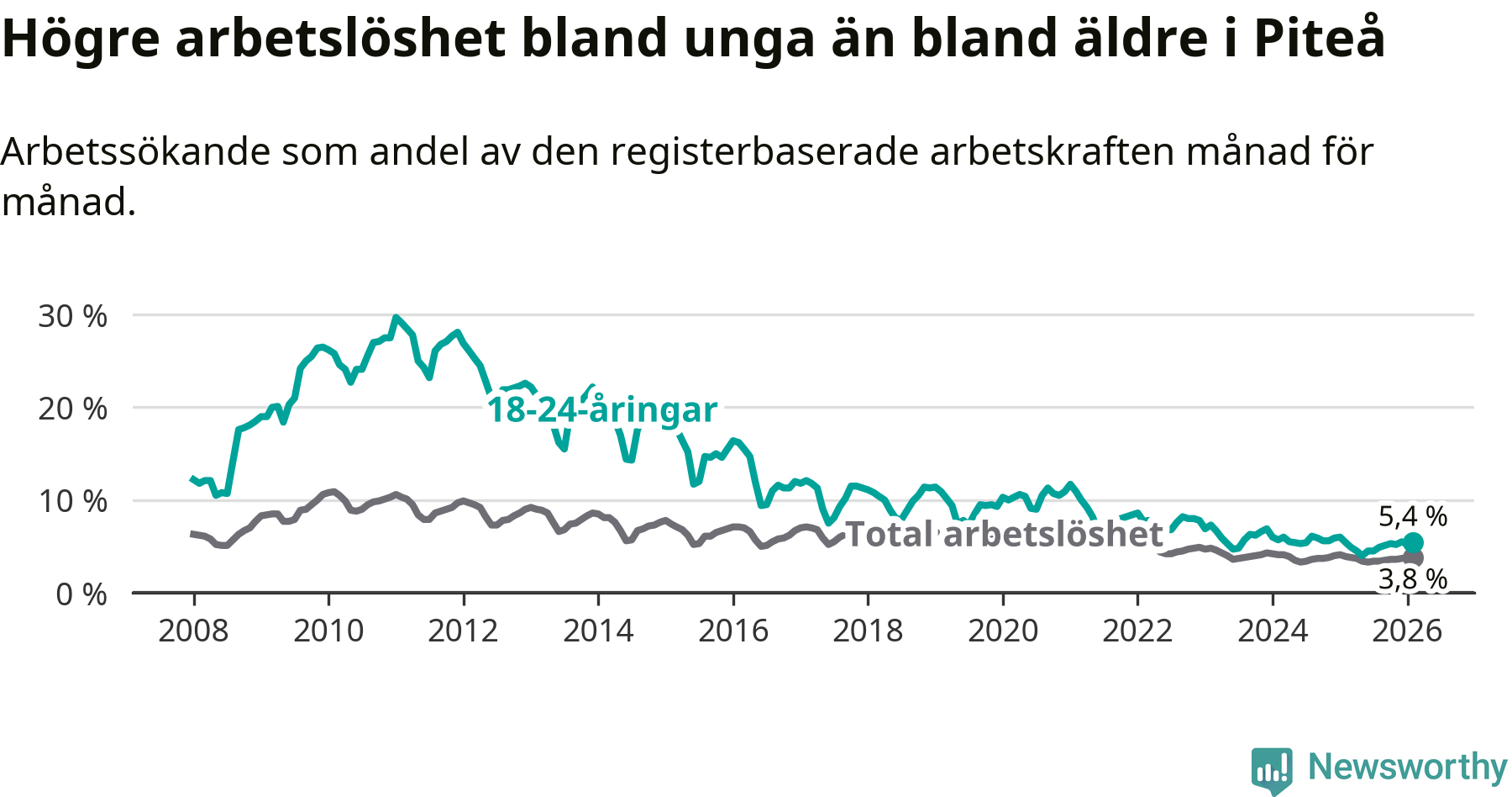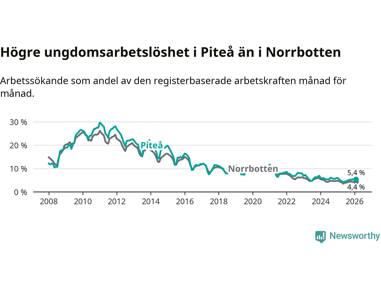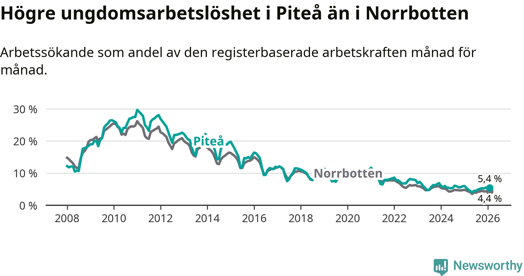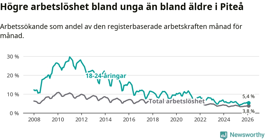Medan Piteå har ungefär samma total arbetslöshet som Norrbotten, ligger ungdomsarbetslösheten 1,0 procentenheter högre i Piteå.