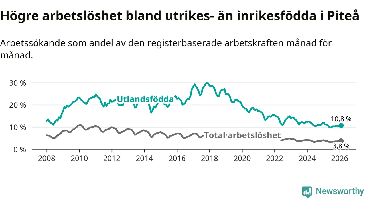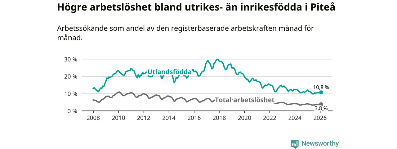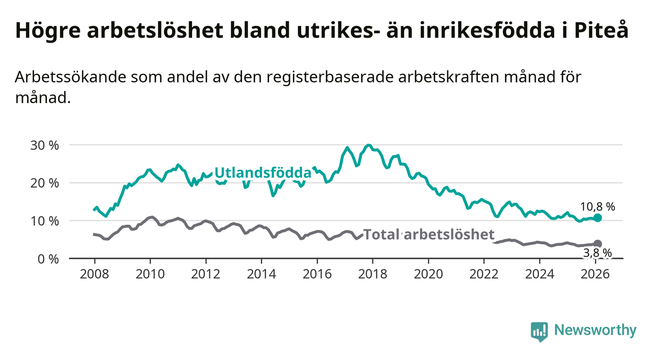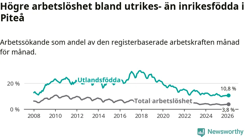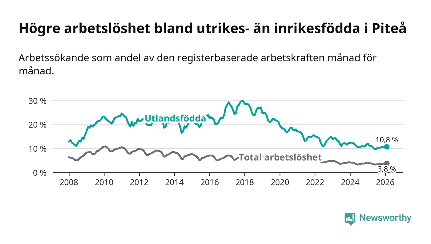 Arbetslösheten bland utlandsfödda var 10,8 procent i Piteå under februari månad, motsvarande 214 av 1 981 personer. Det är 0,4 procentenheter färre än vid samma tidpunkt i fjol (+1 om man räknar personer). Därmed har de utlandsföddas arbetslöshet varit lägre än vid samma tidpunkt i fjol i över två år i sträck.