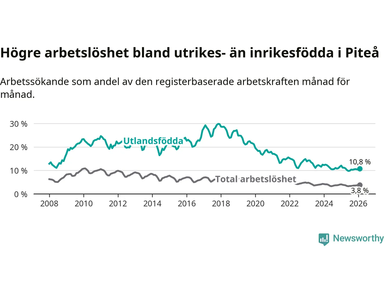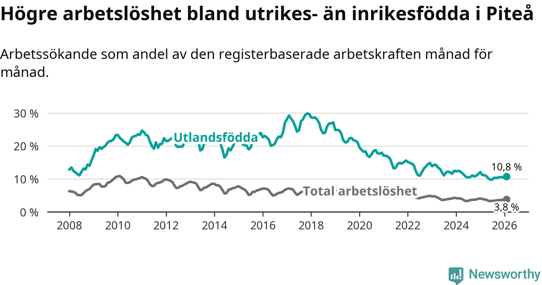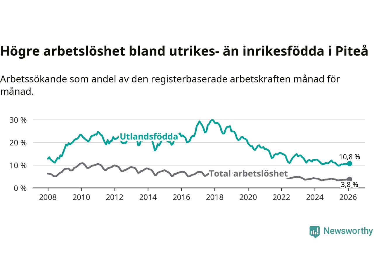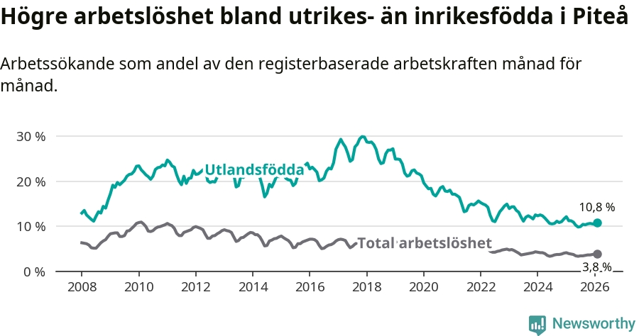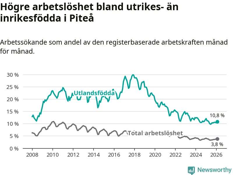 Arbetslösheten bland utlandsfödda var 10,8 procent i Piteå under februari månad, motsvarande 214 av 1 981 personer. Det är 0,4 procentenheter färre än vid samma tidpunkt i fjol (+1 om man räknar personer). Därmed har de utlandsföddas arbetslöshet varit lägre än vid samma tidpunkt i fjol i över två år i sträck.
