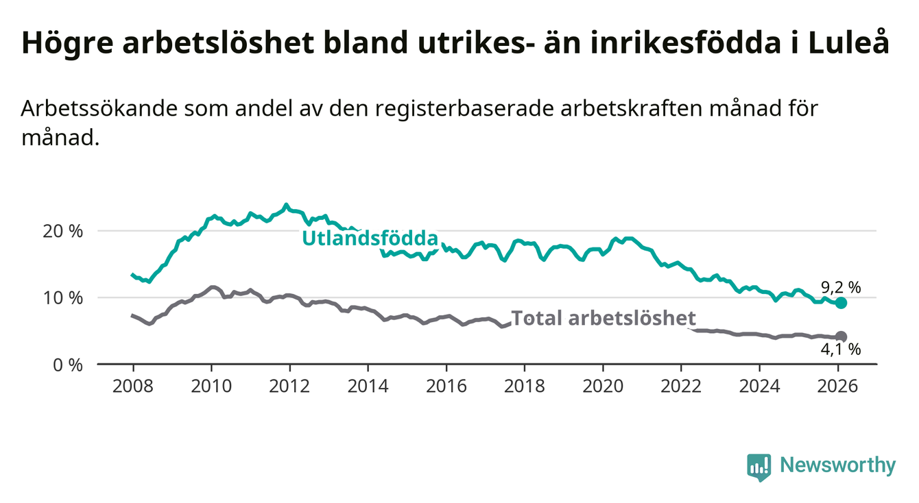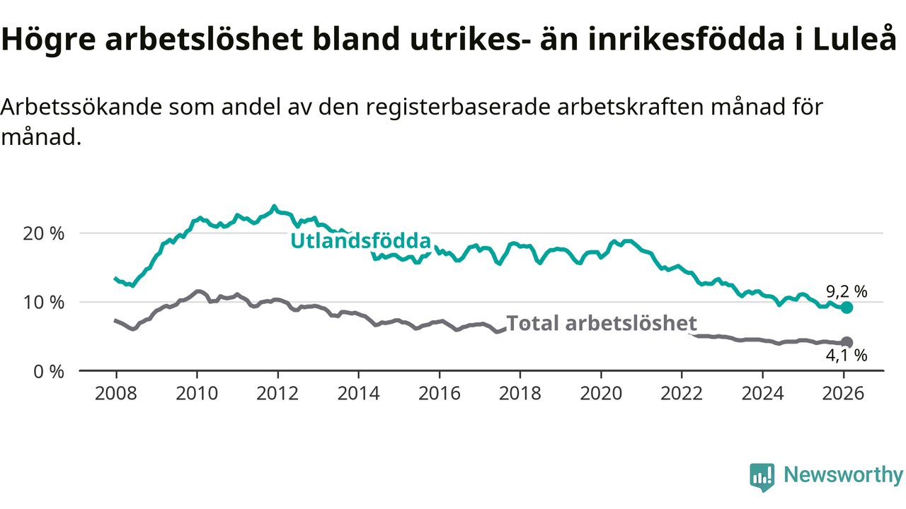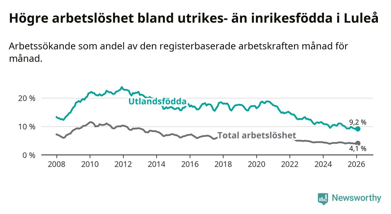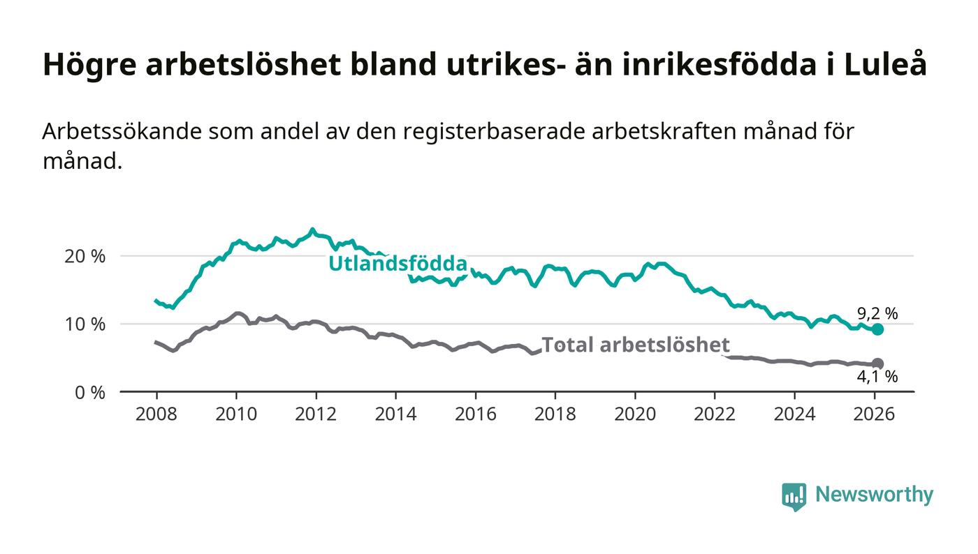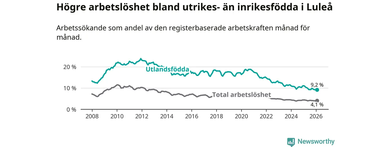 Arbetslösheten bland utlandsfödda var 9,2 procent i Luleå under februari månad, motsvarande 598 av 6 500 personer. Det är 1,7 procentenheter färre än vid samma tidpunkt i fjol (−71 om man räknar personer). Därmed är de utlandsföddas arbetslöshet lägre än vid samma tidpunkt i fjol för tolfte månaden i följd. Sedan februari 2025 har arbetslösheten bland utlandsfödda minskat från 10,9 till 9,2 procent.