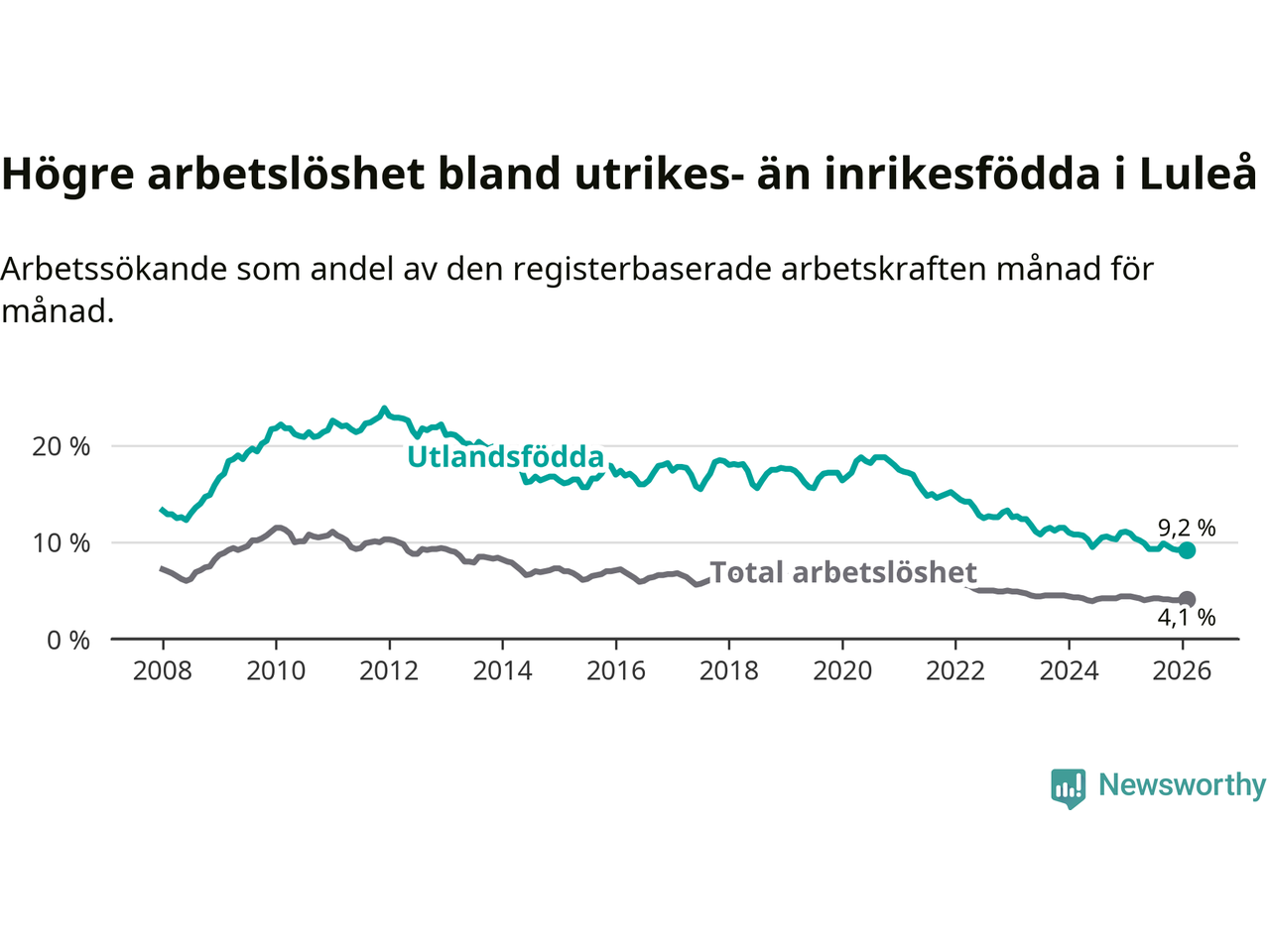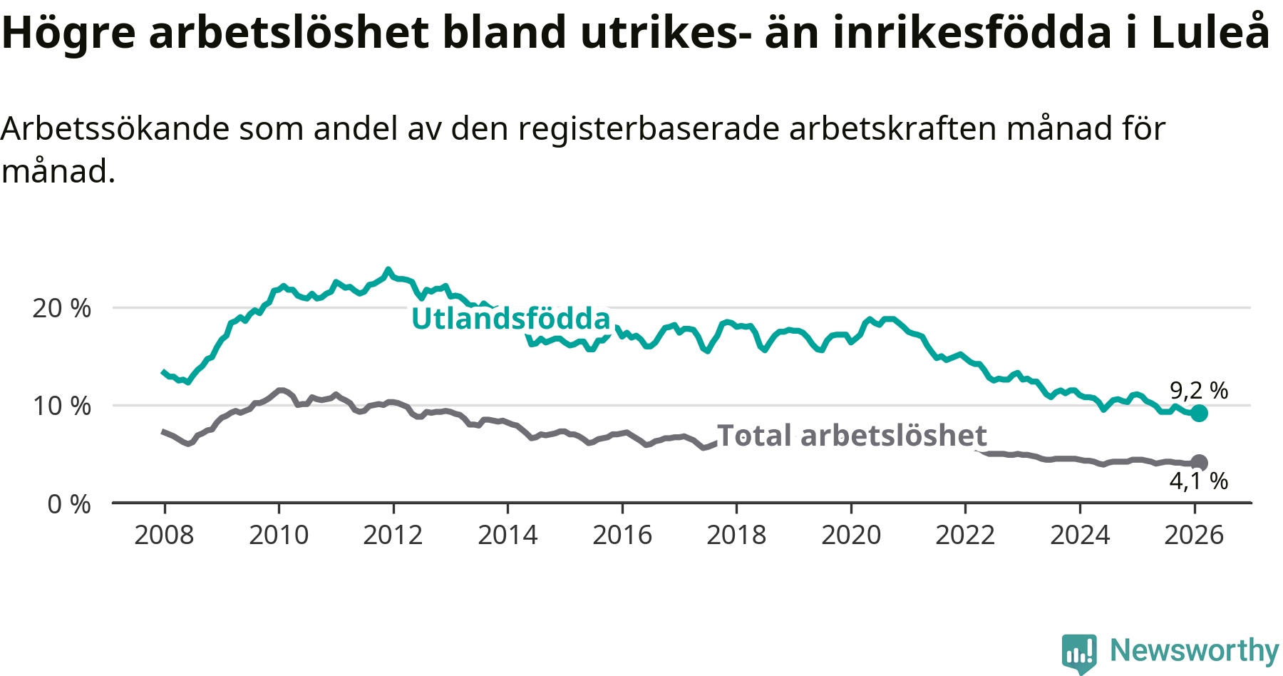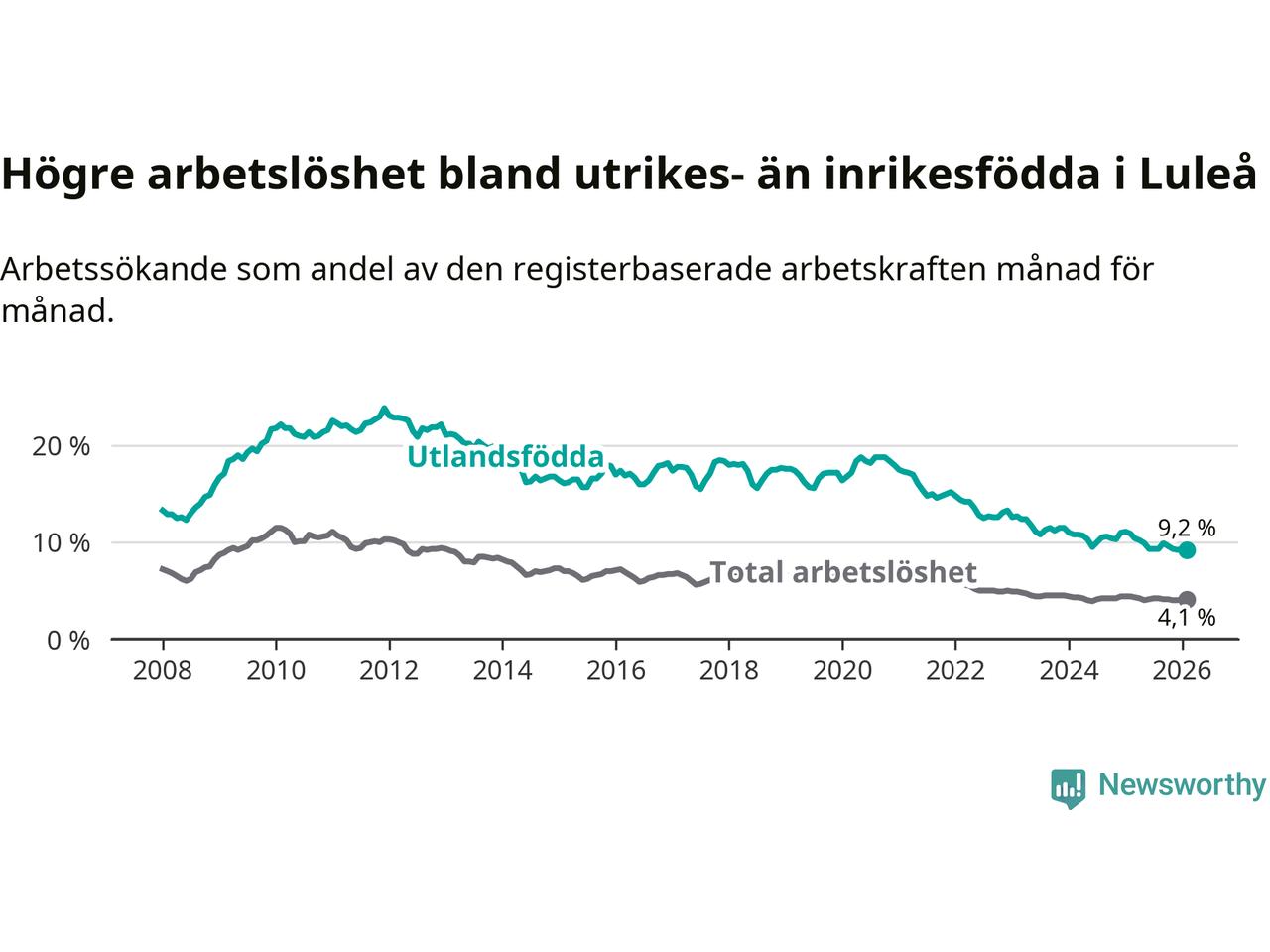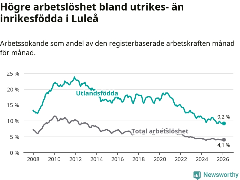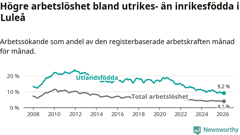 Arbetslösheten bland utlandsfödda var 9,2 procent i Luleå under februari månad, motsvarande 598 av 6 500 personer. Det är 1,7 procentenheter färre än vid samma tidpunkt i fjol (−71 om man räknar personer). Därmed är de utlandsföddas arbetslöshet lägre än vid samma tidpunkt i fjol för tolfte månaden i följd. Sedan februari 2025 har arbetslösheten bland utlandsfödda minskat från 10,9 till 9,2 procent.