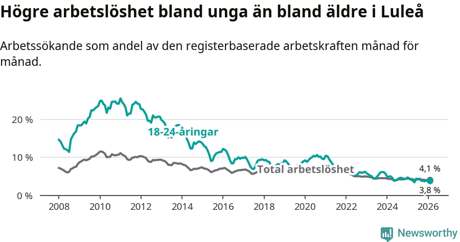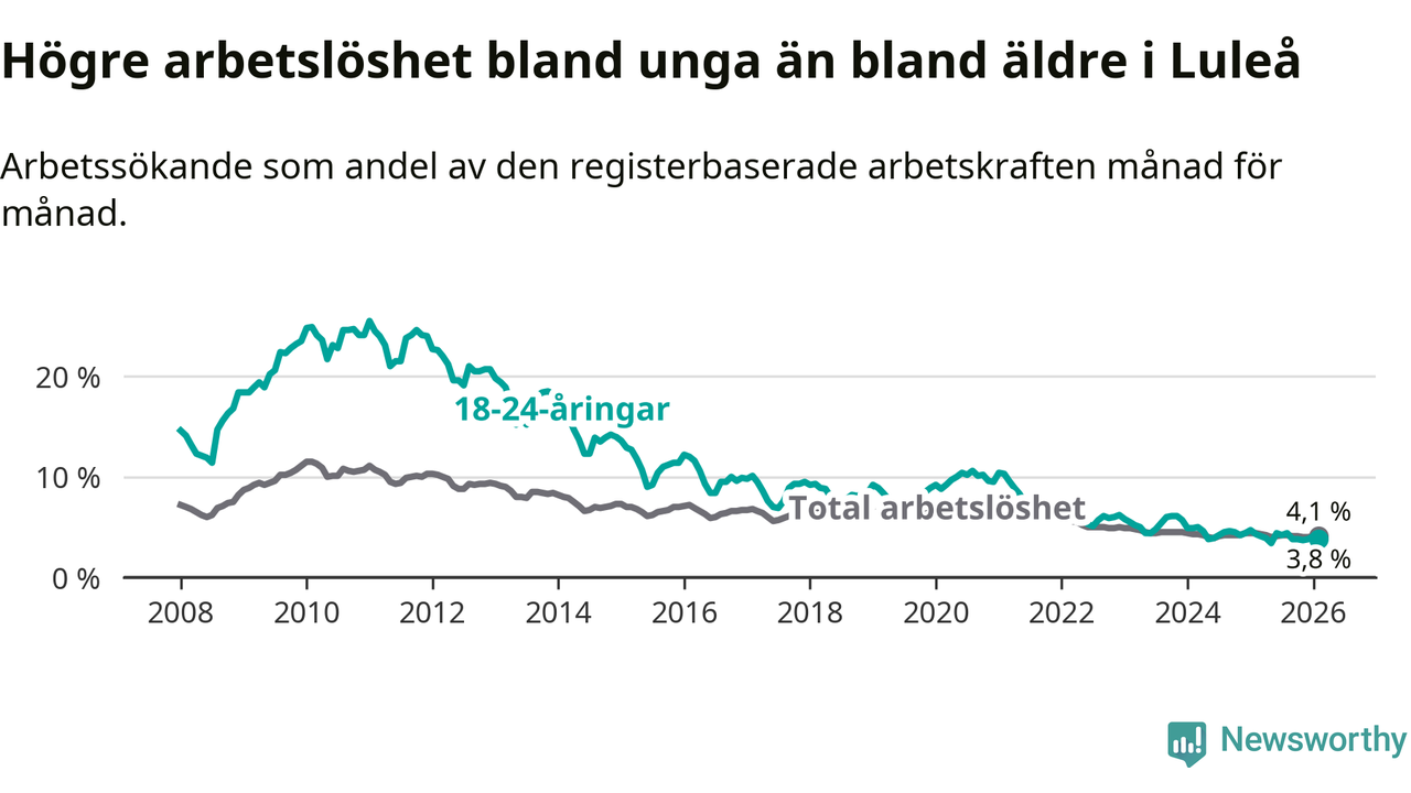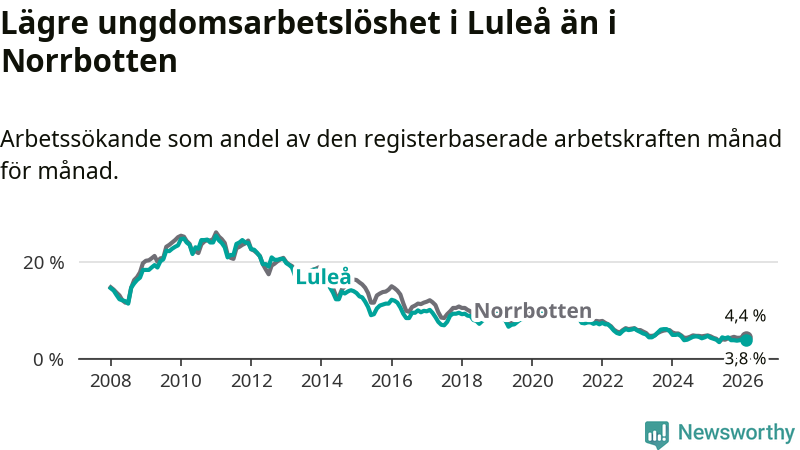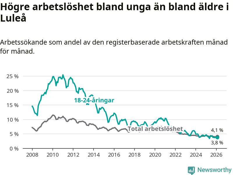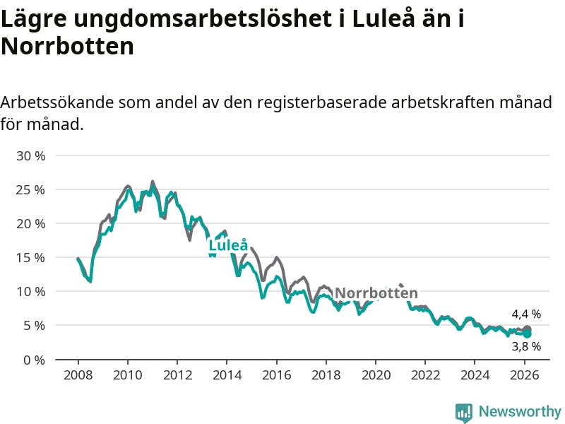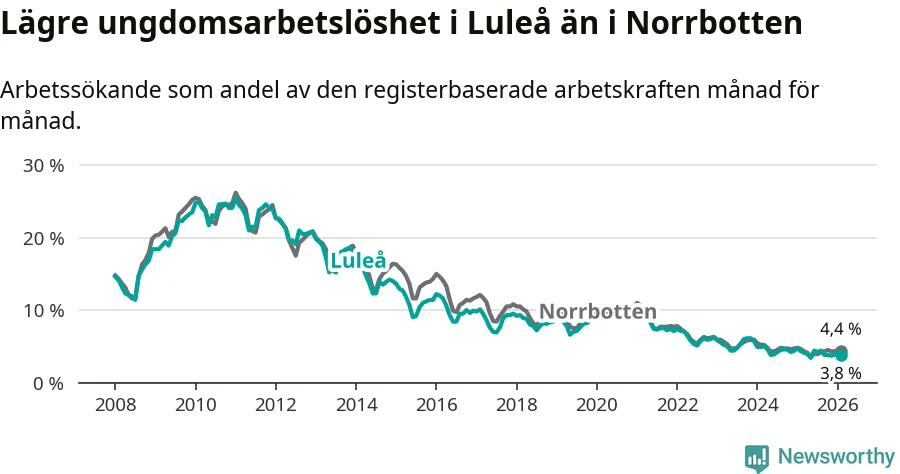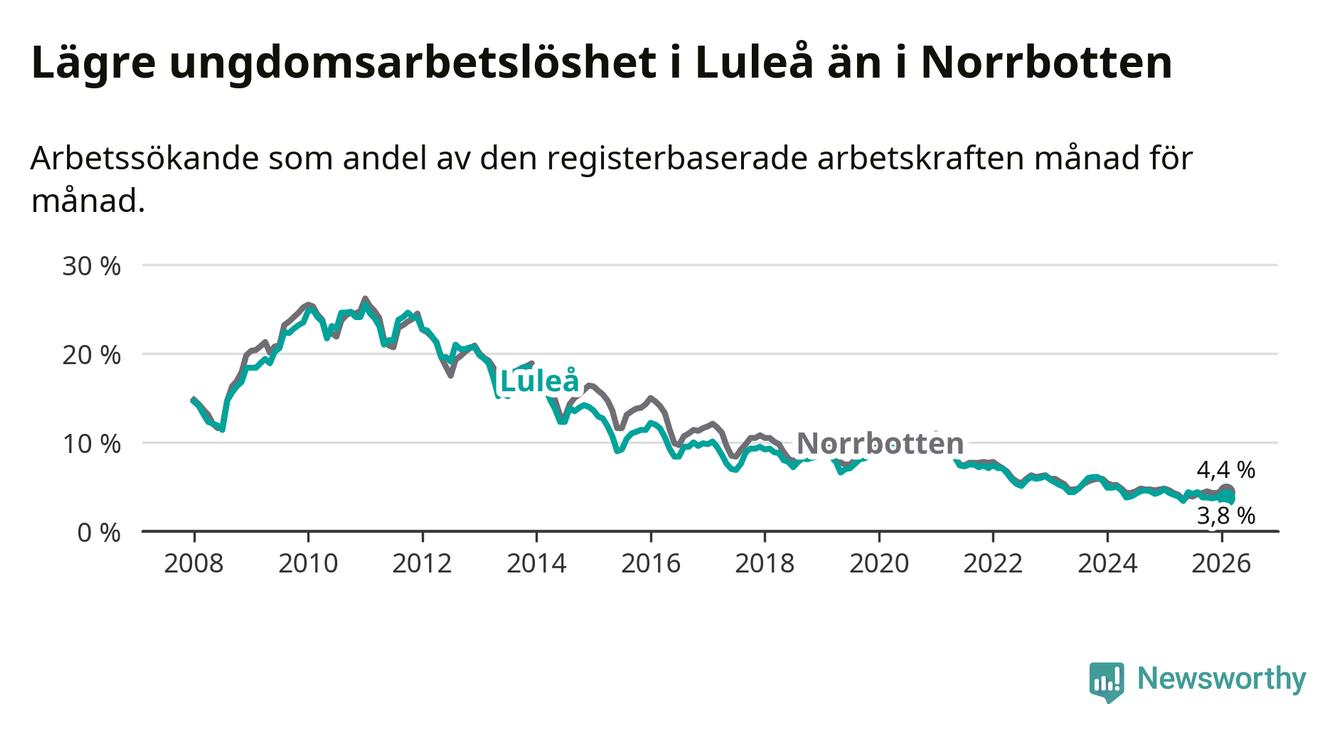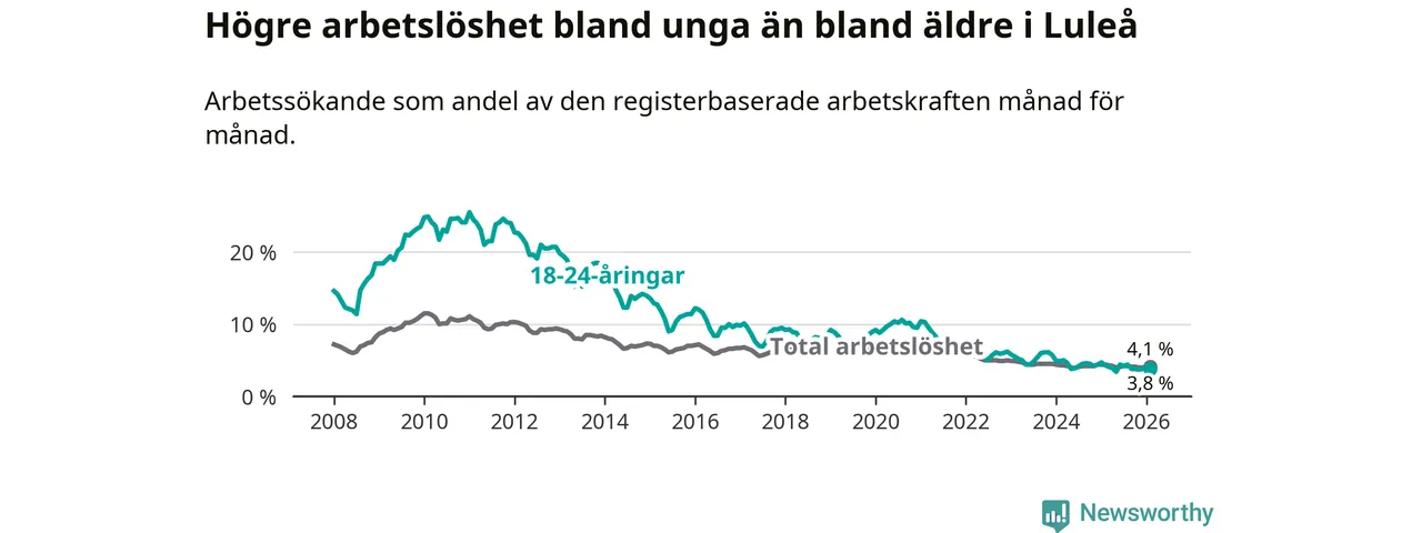 I och med den senaste månadens nedgång har de ungas arbetslöshet i Luleå sjunkit sju månader i följd (ner från 4,2 procent i juli 2025 till 3,8 procent nu).