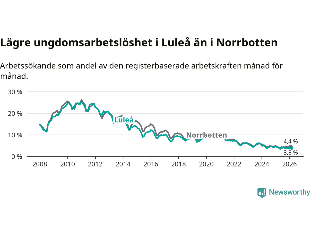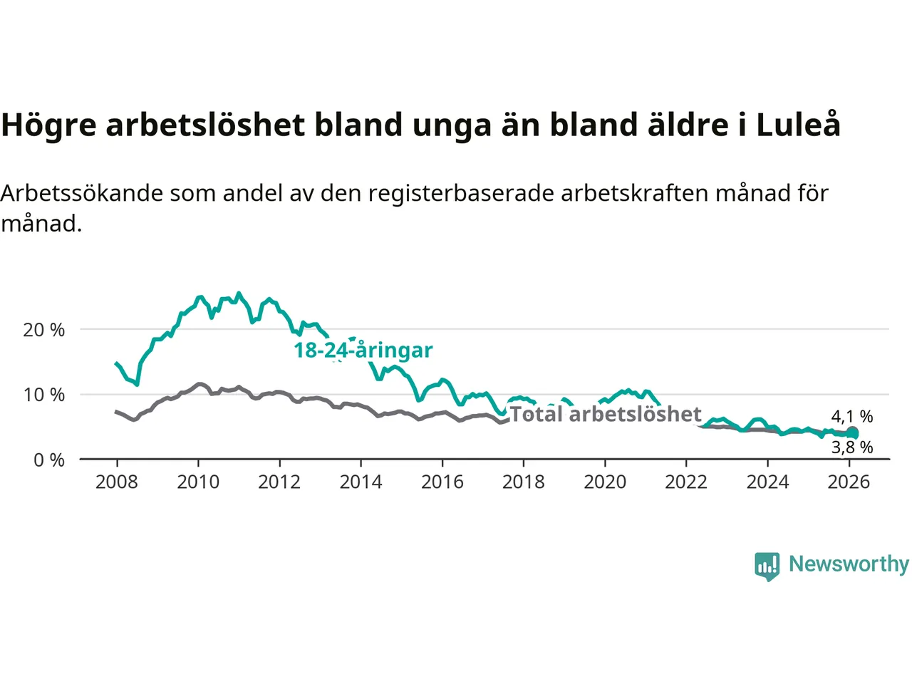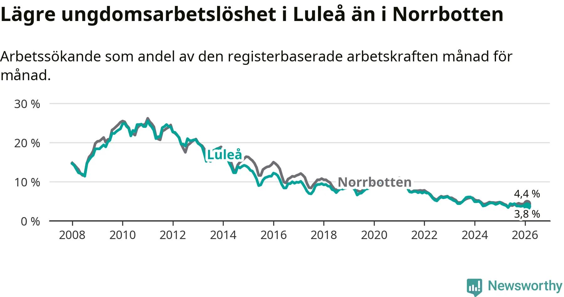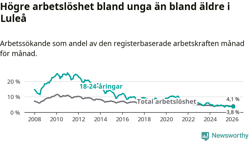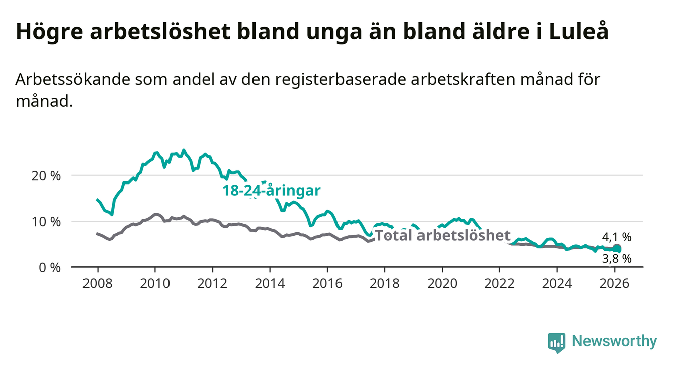 I och med den senaste månadens nedgång har de ungas arbetslöshet i Luleå sjunkit sju månader i följd (ner från 4,2 procent i juli 2025 till 3,8 procent nu).