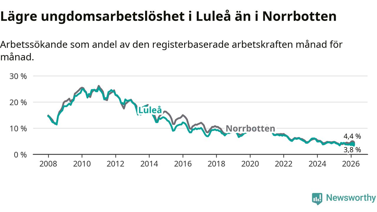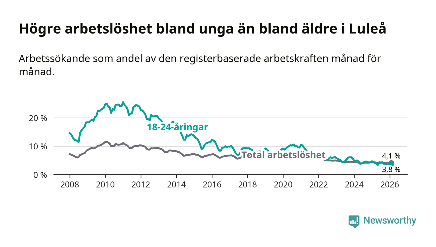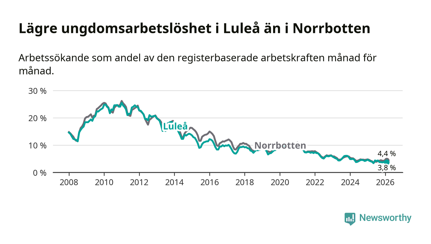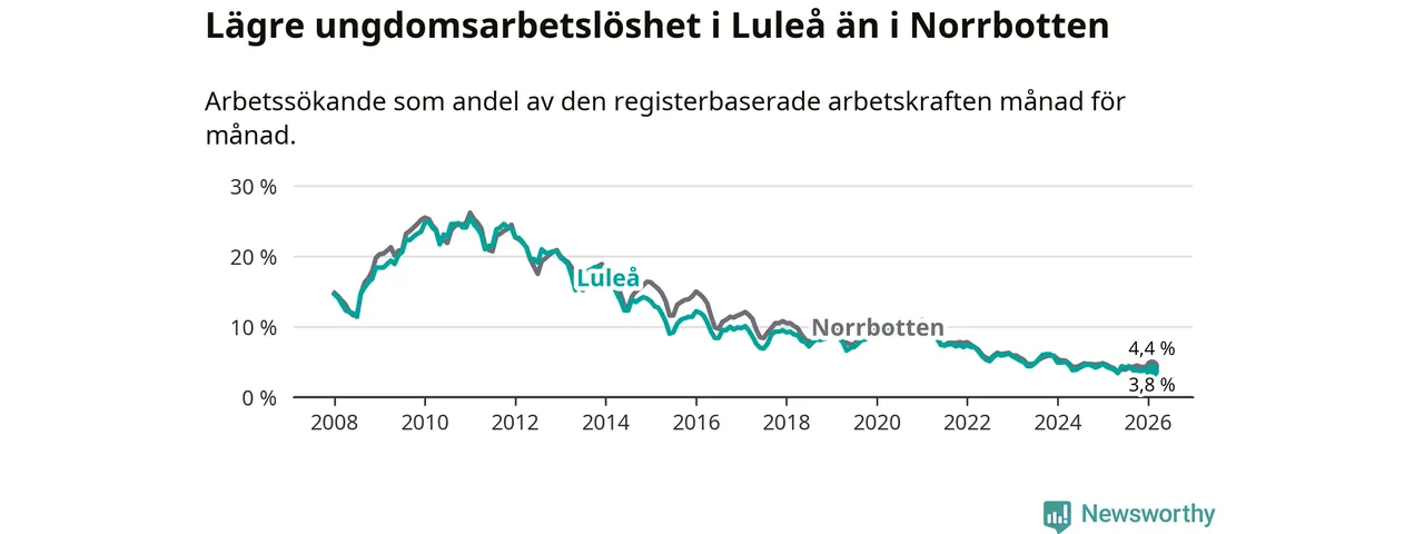 Medan Luleå har högre total arbetslöshet än Norrbotten, ligger ungdomsarbetslösheten 0,6 procentenheter lägre i Luleå.