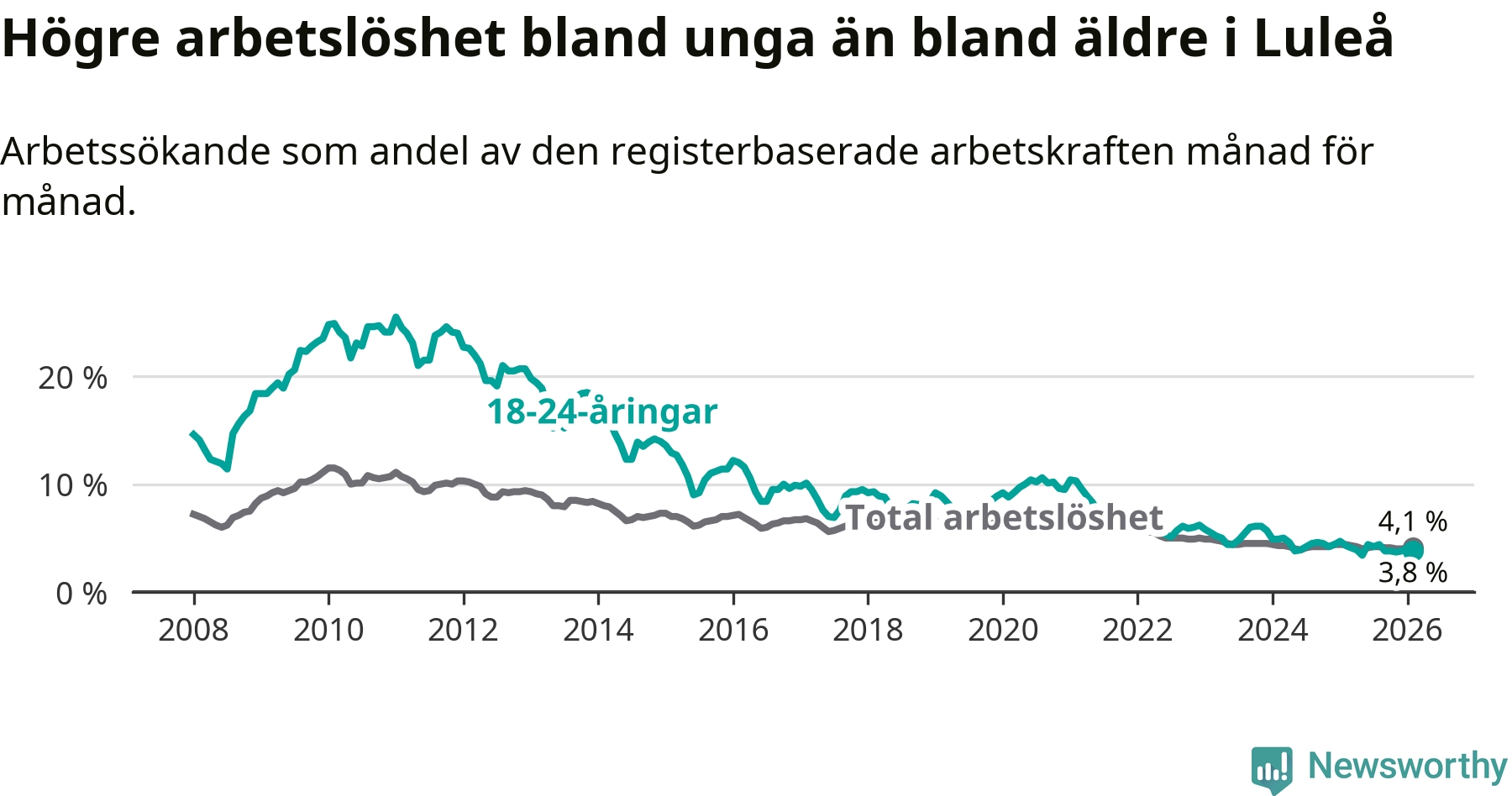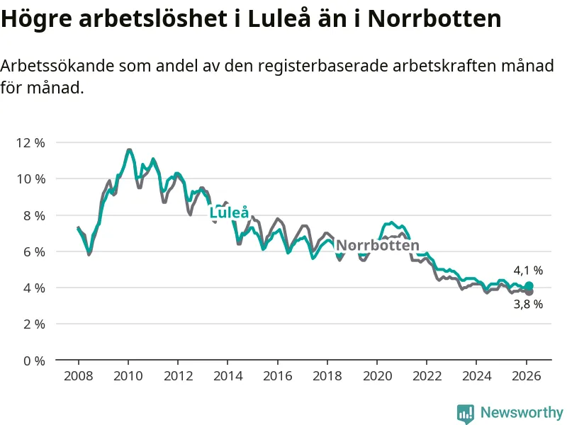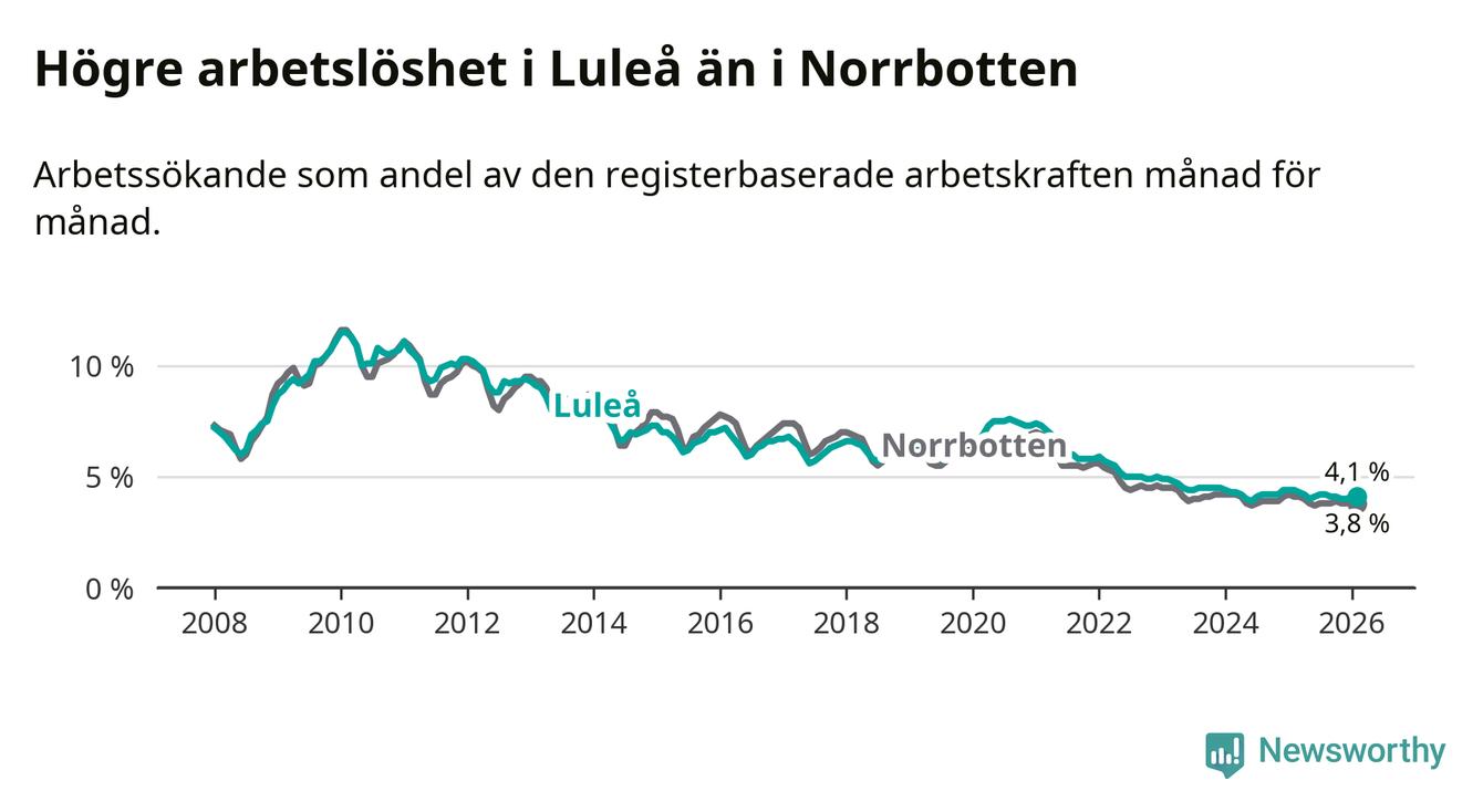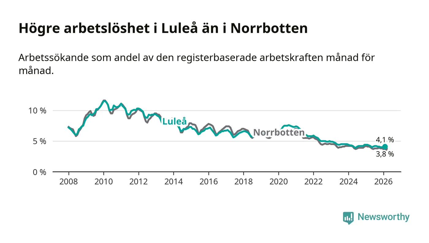Medan Luleå har högre total arbetslöshet än Norrbotten, ligger ungdomsarbetslösheten 0,6 procentenheter lägre i Luleå.