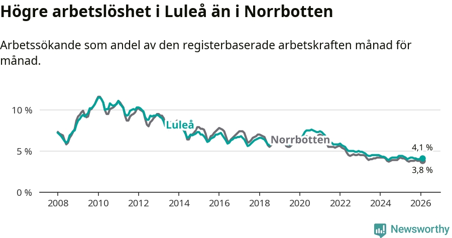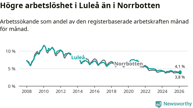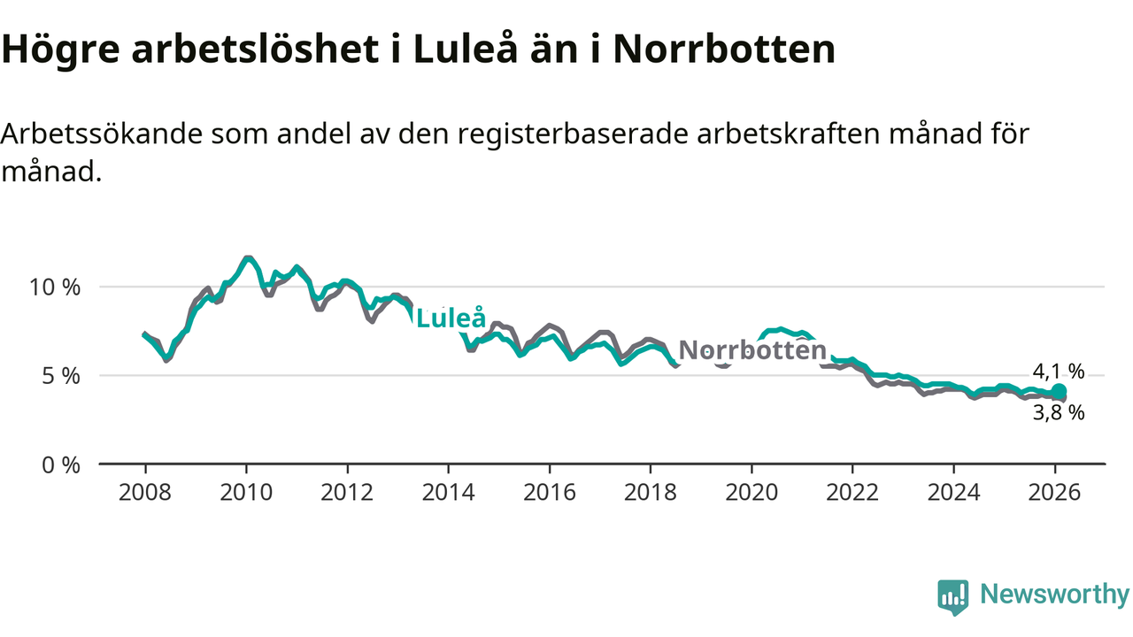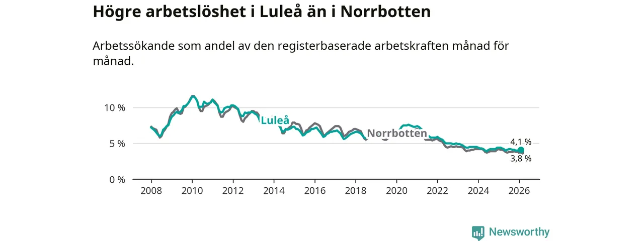 Under februari månad rapporterade Luleå kommun en total arbetslöshet på 4,1 procent. Det är en minskning jämfört med samma tidpunkt i fjol (−0,3 procentenheter). Även i Norrbottens län sjunker arbetslösheten .