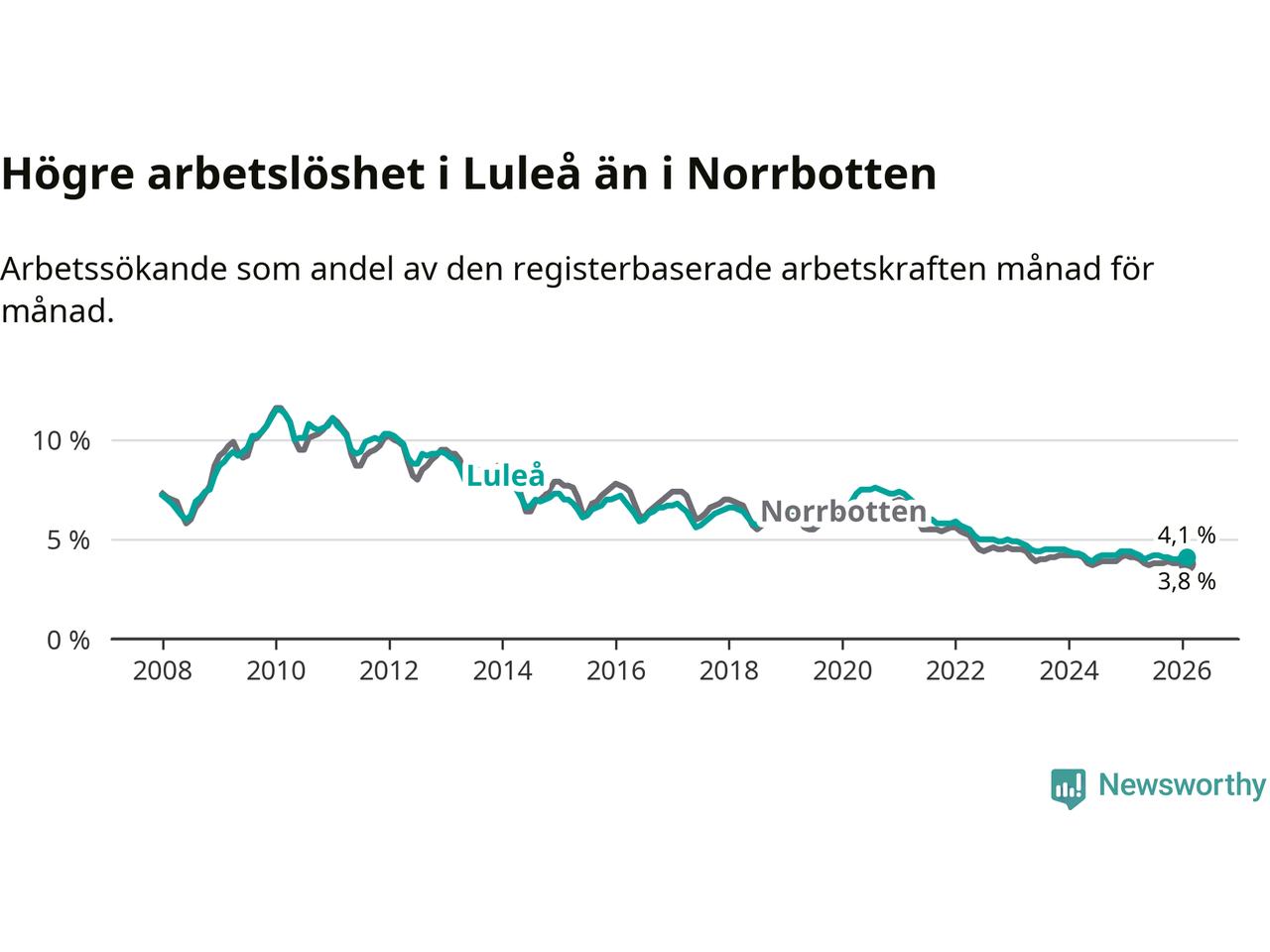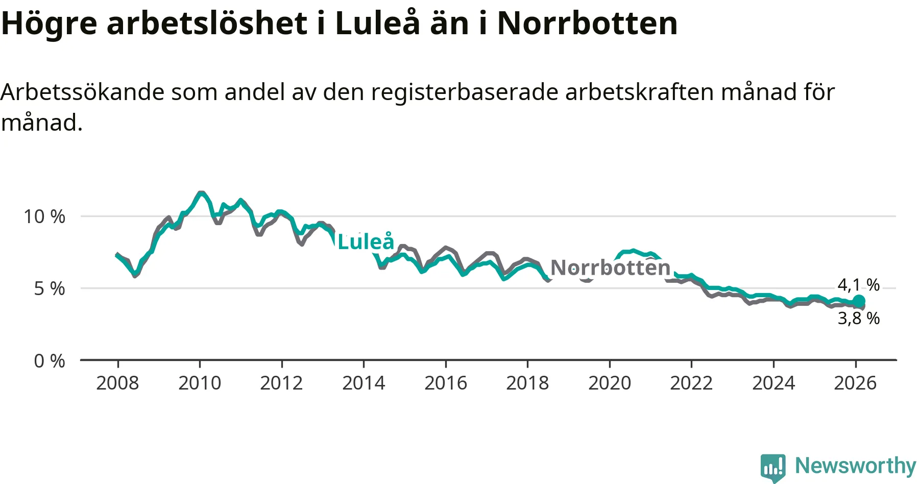 Graf: Arbetslöshet i Luleå kommun och Norrbottens län