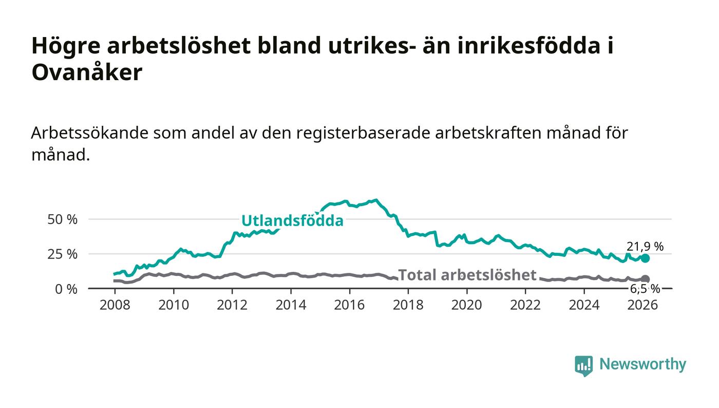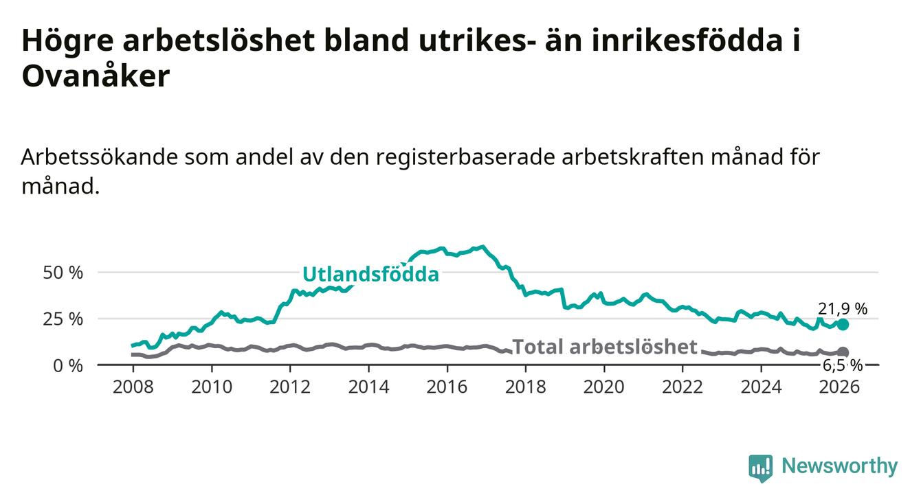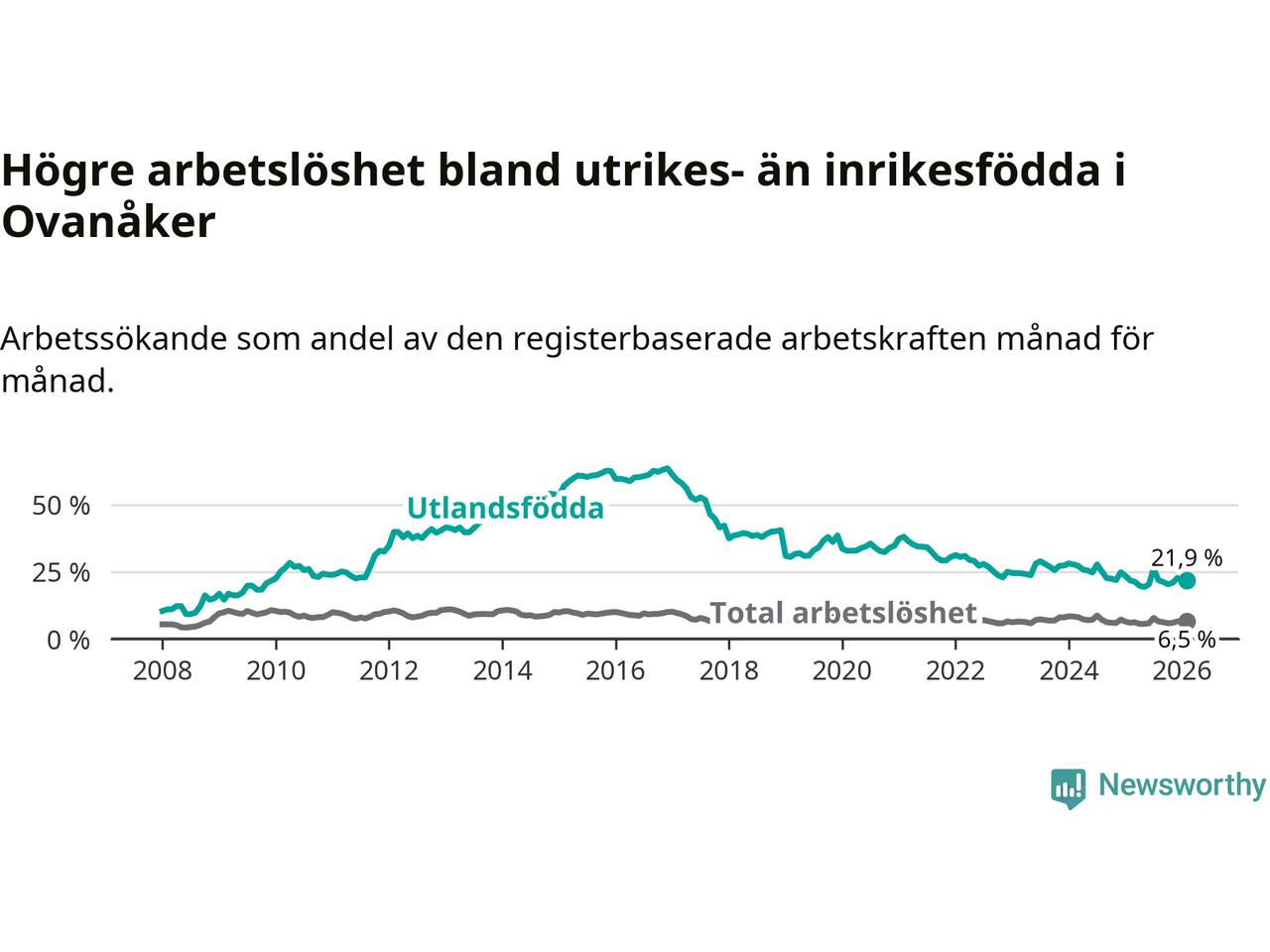 Arbetslösheten bland utlandsfödda var 21,9 procent i Ovanåker under februari månad, motsvarande 116 av 530 personer. Det är 0,2 procentenheter fler än vid samma tidpunkt i fjol (−5 om man räknar personer). Den senaste månadens uppgång innebär ett trendbrott. Under de 20 föregående månaderna hade arbetslösheten bland utlandsfödda varit lägre än motsvarande tidpunkt året innan.