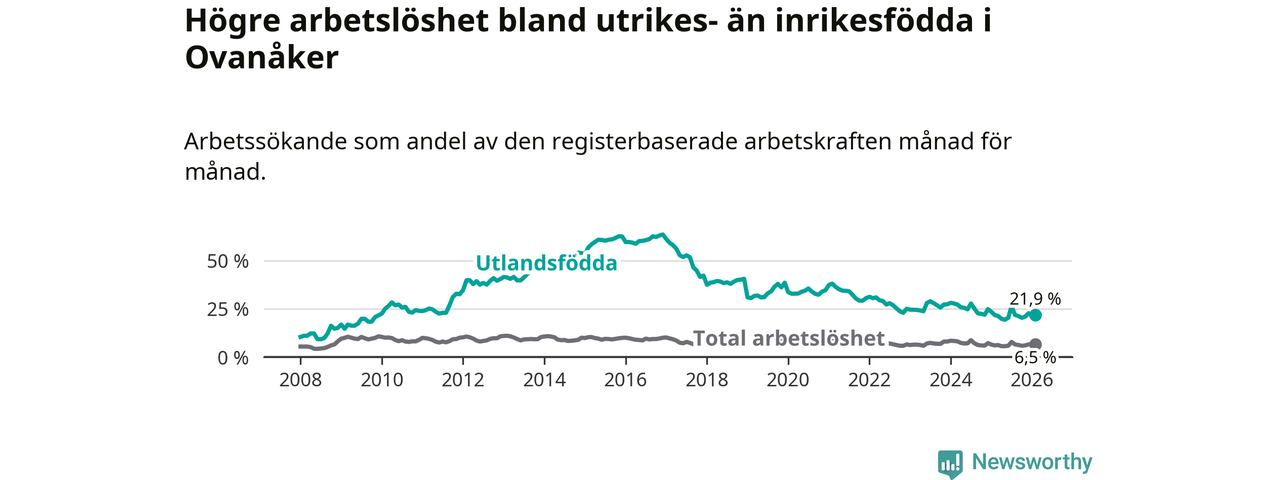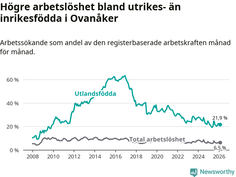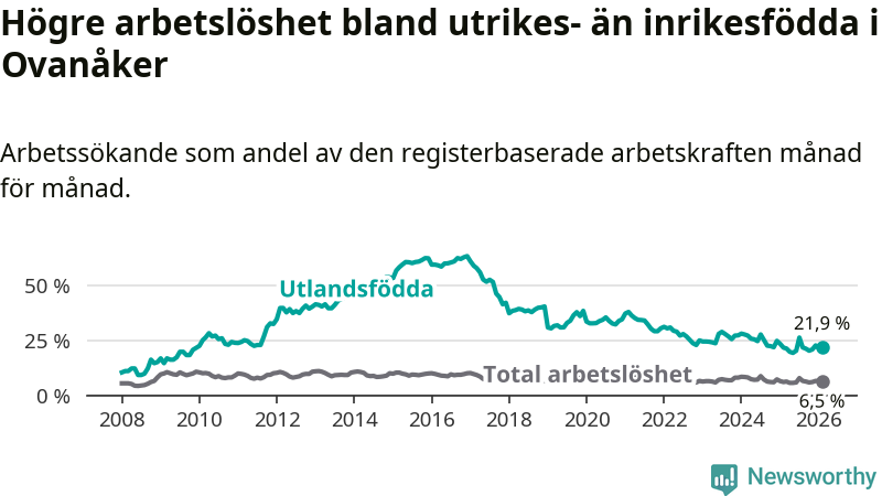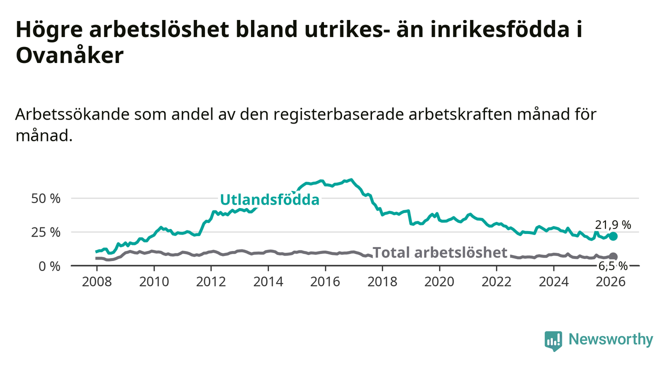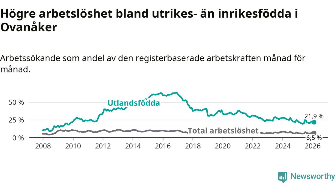 Arbetslösheten bland utlandsfödda var 21,9 procent i Ovanåker under februari månad, motsvarande 116 av 530 personer. Det är 0,2 procentenheter fler än vid samma tidpunkt i fjol (−5 om man räknar personer). Den senaste månadens uppgång innebär ett trendbrott. Under de 20 föregående månaderna hade arbetslösheten bland utlandsfödda varit lägre än motsvarande tidpunkt året innan.