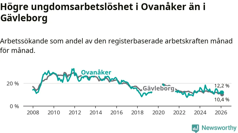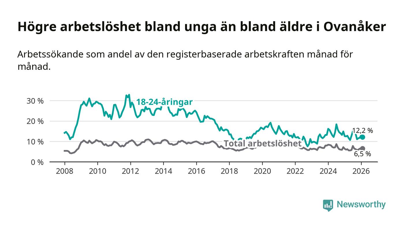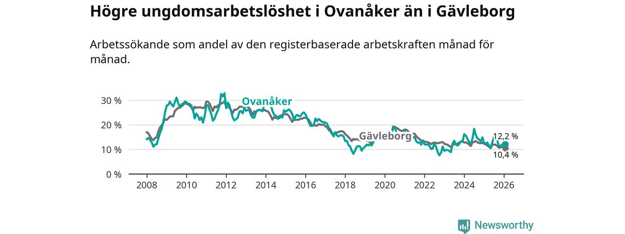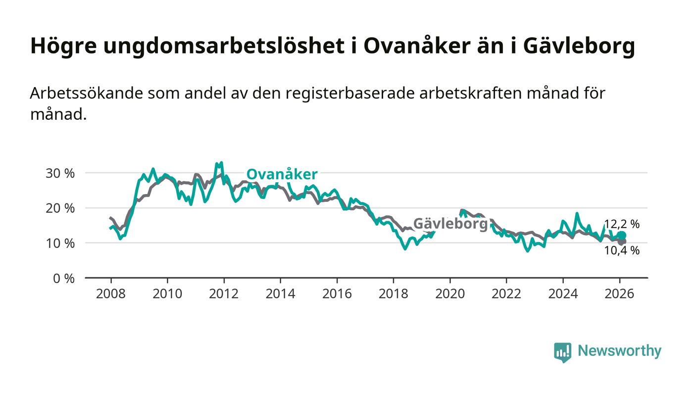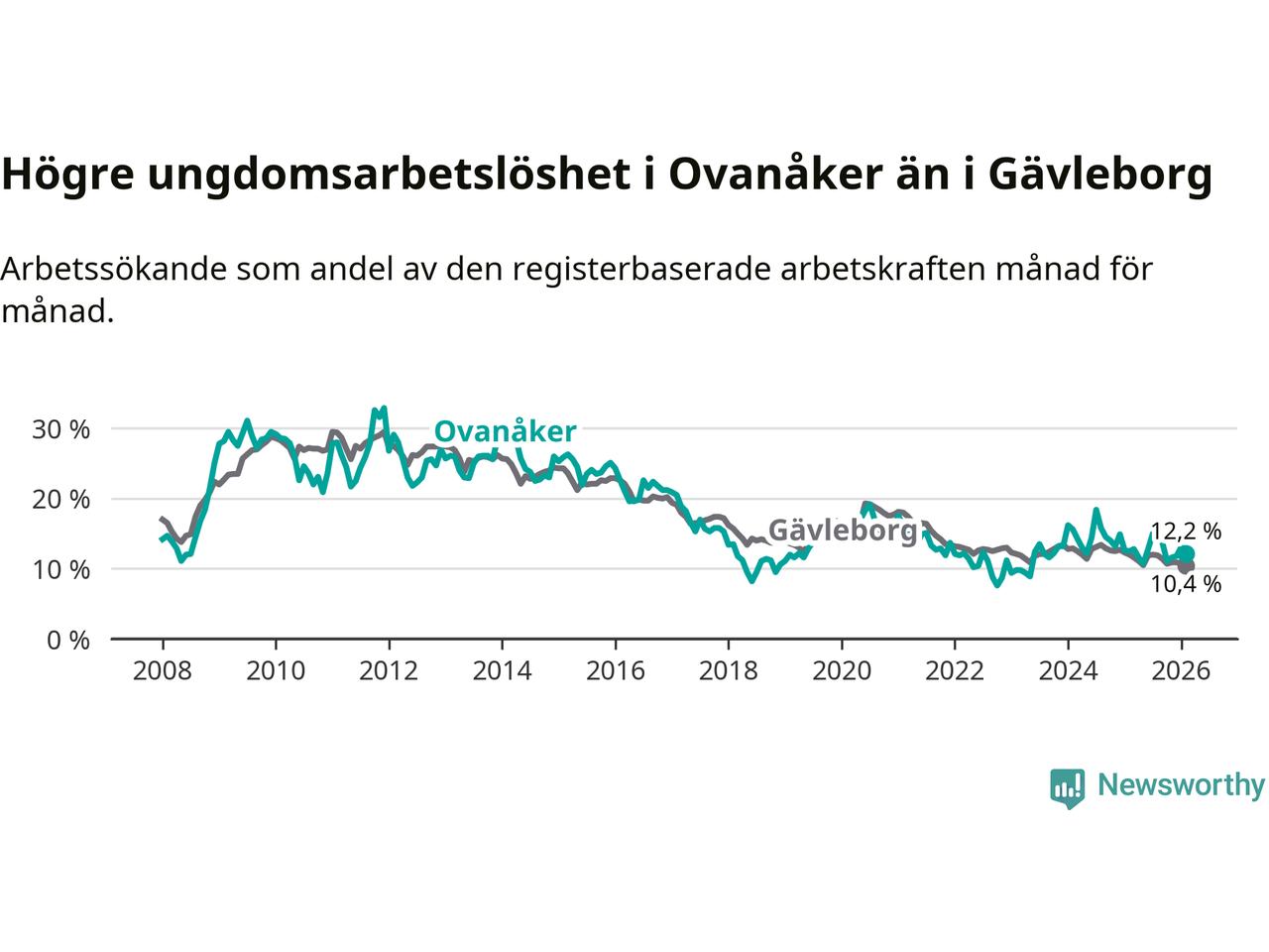 Medan Ovanåker har lägre total arbetslöshet än Gävleborg, ligger ungdomsarbetslösheten 1,8 procentenheter högre i Ovanåker.